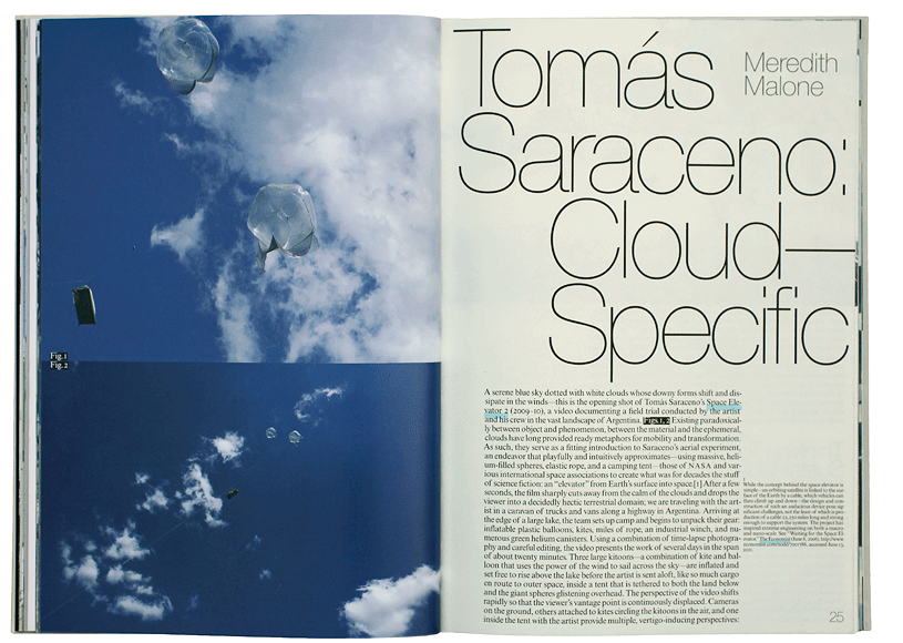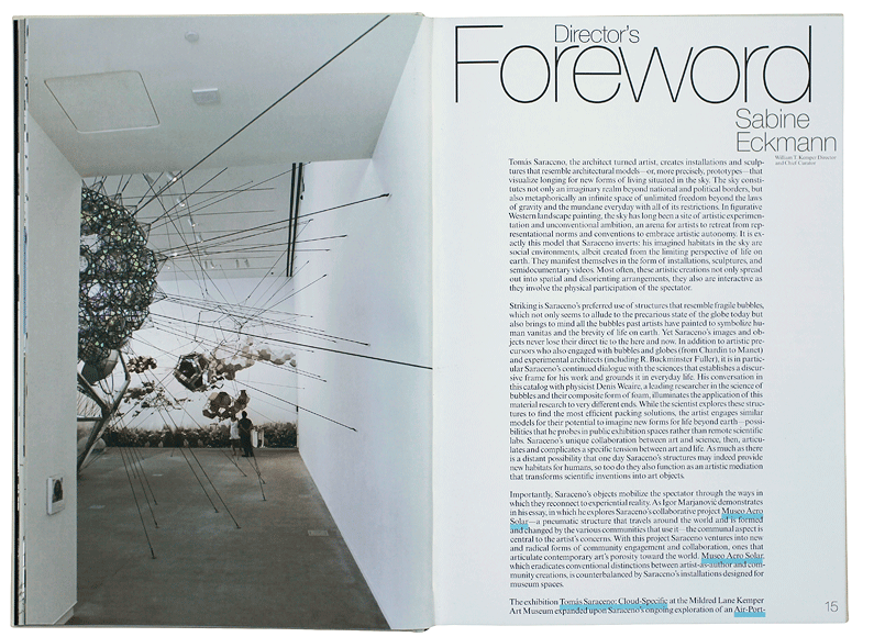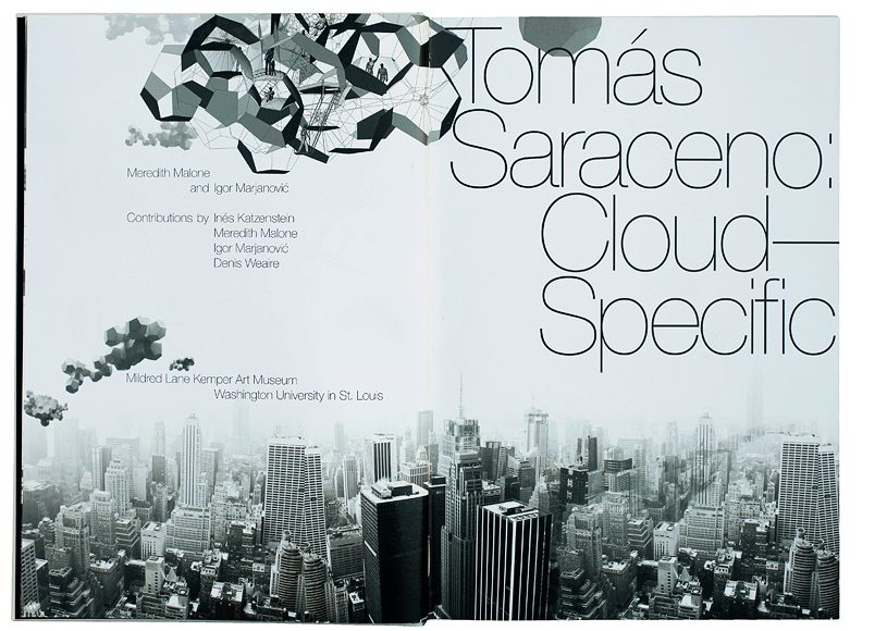 Cloud-Specific is a monograph by Tomás Saraceno, edited by Jane E. Neidhardt, designed by cyan, and published by the Mildred Lane Kemper Art Museum in 2014. The book contains photos, diagrams, and articles.