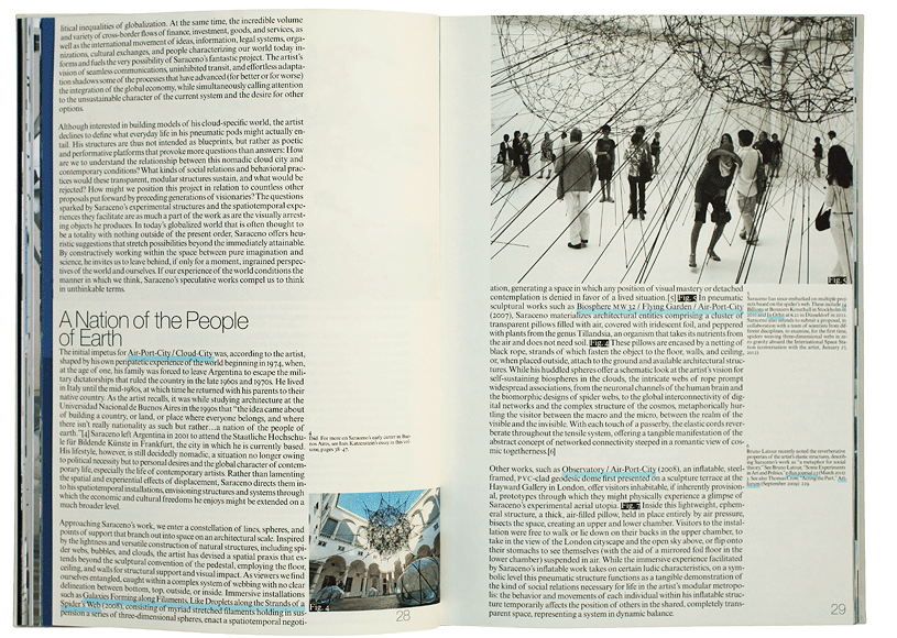 Tomás Saraceno is a contemporary artist from Argentinia. Many of his works are in line with the concepts of “link” and “connection” that surround us. He has often used the sky and space as a place to reflect. Cloud-Specific was also an exhibition shown by the Mildred Lane Kemper Art Museum from September 9, 2011 to January 9, 2012. In it, you can find polygonal metal structures that connect to each other and blend together. For the artist the sky is a place of spatial conditions.
