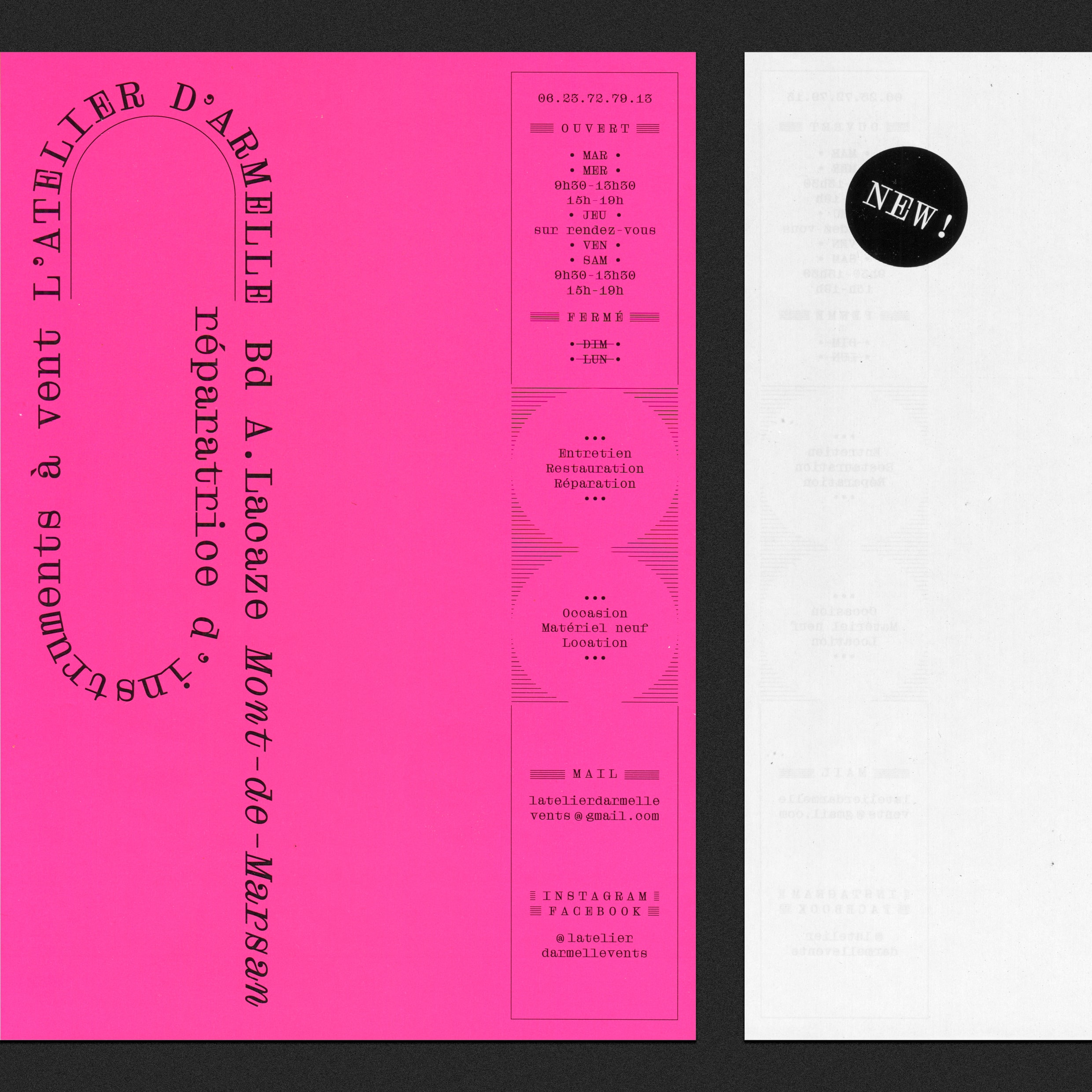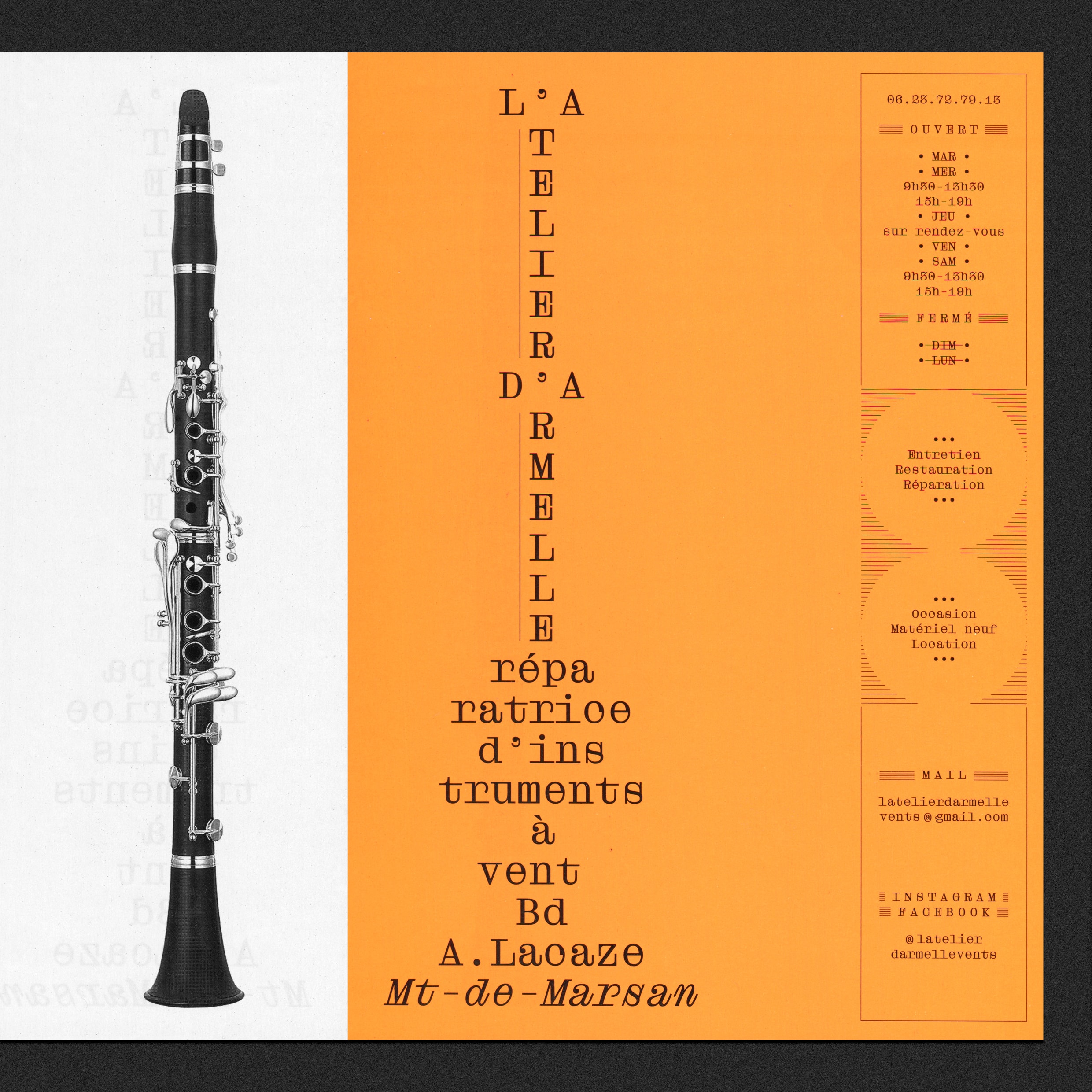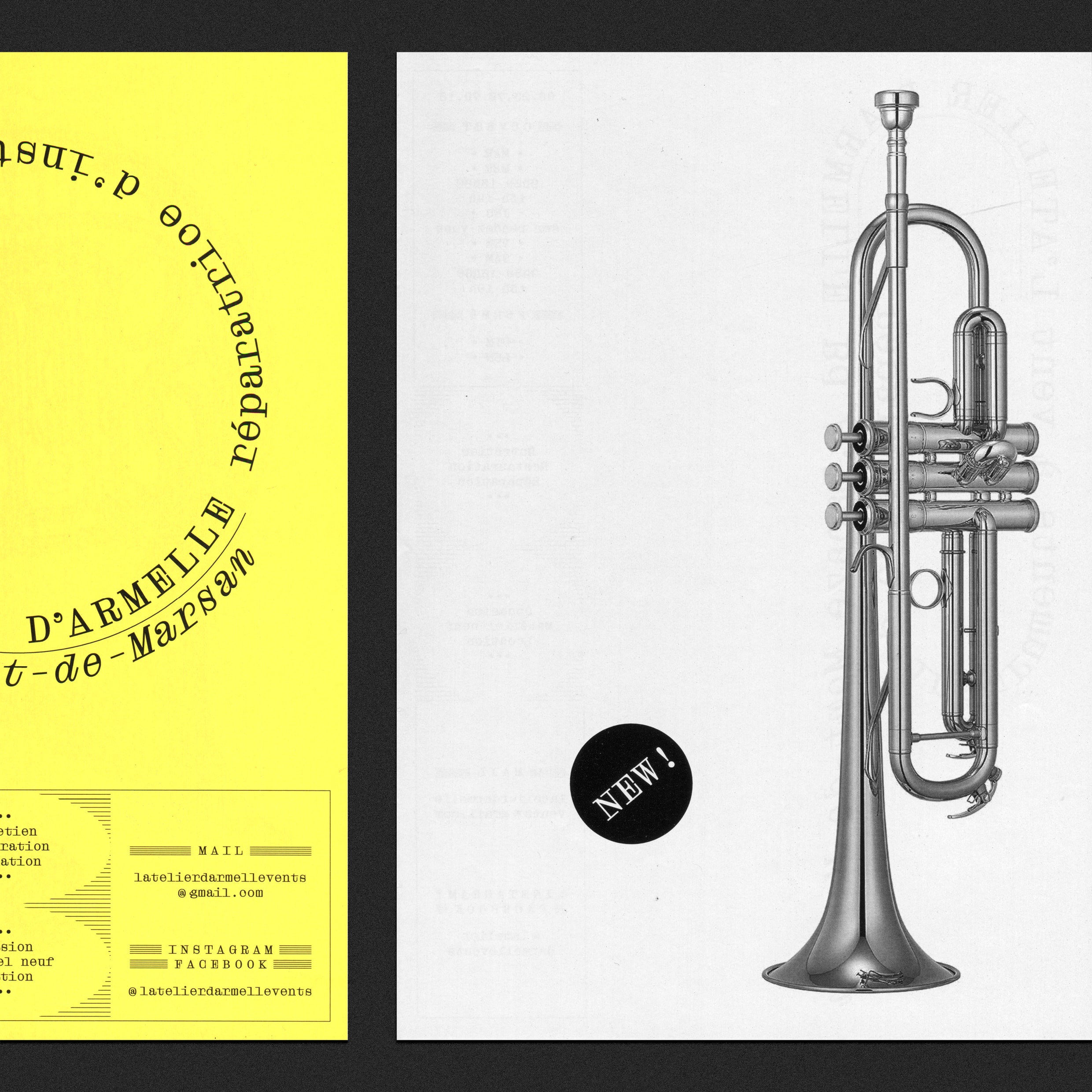 To anchor her workshop in the local musical culture, Antoine Lemarchand and Noémie Santos designed communication media which evoke the posters of votive festivals, ferias and bandas printed on a plain colored background. The lines of text follow the typical shapes of the instruments that she restores.