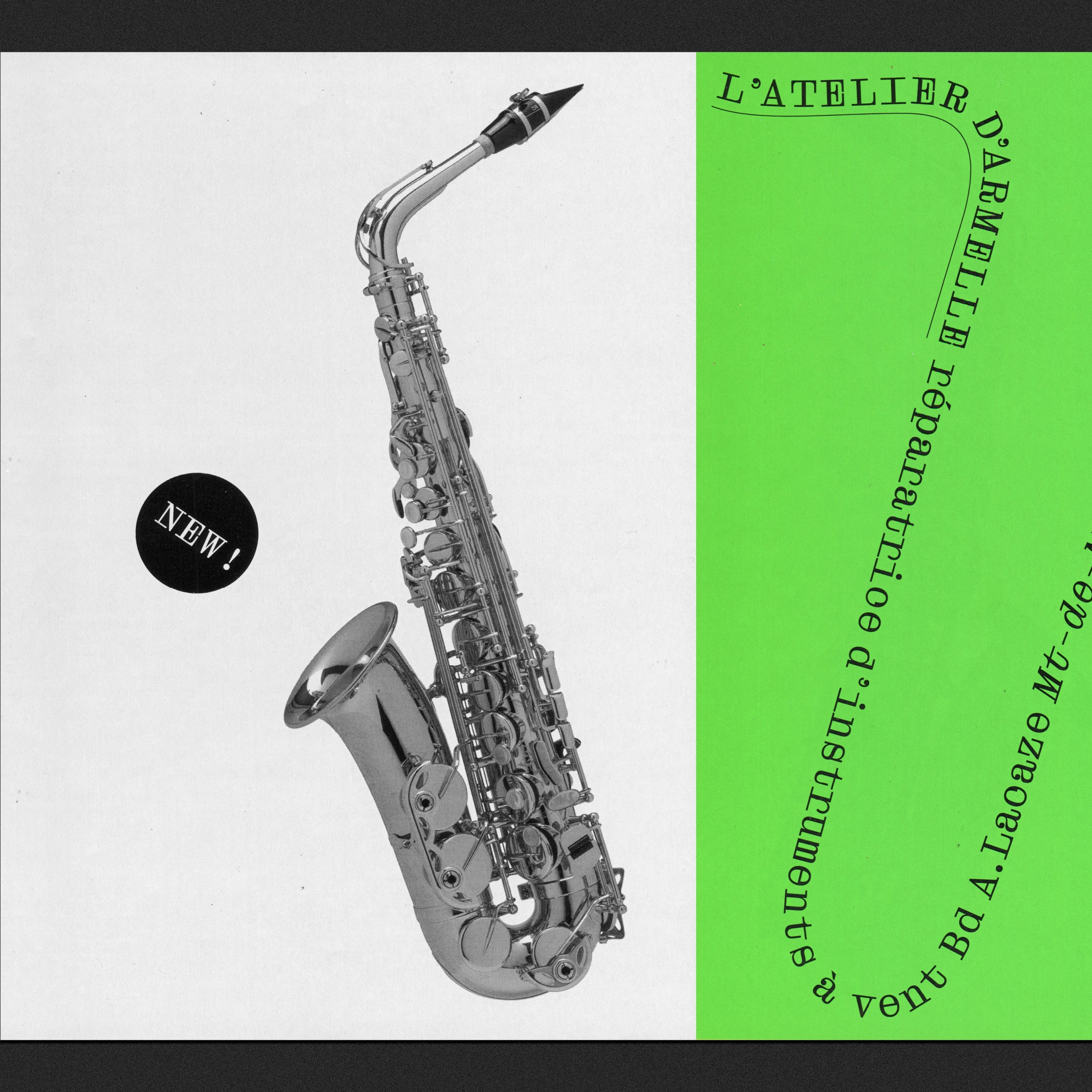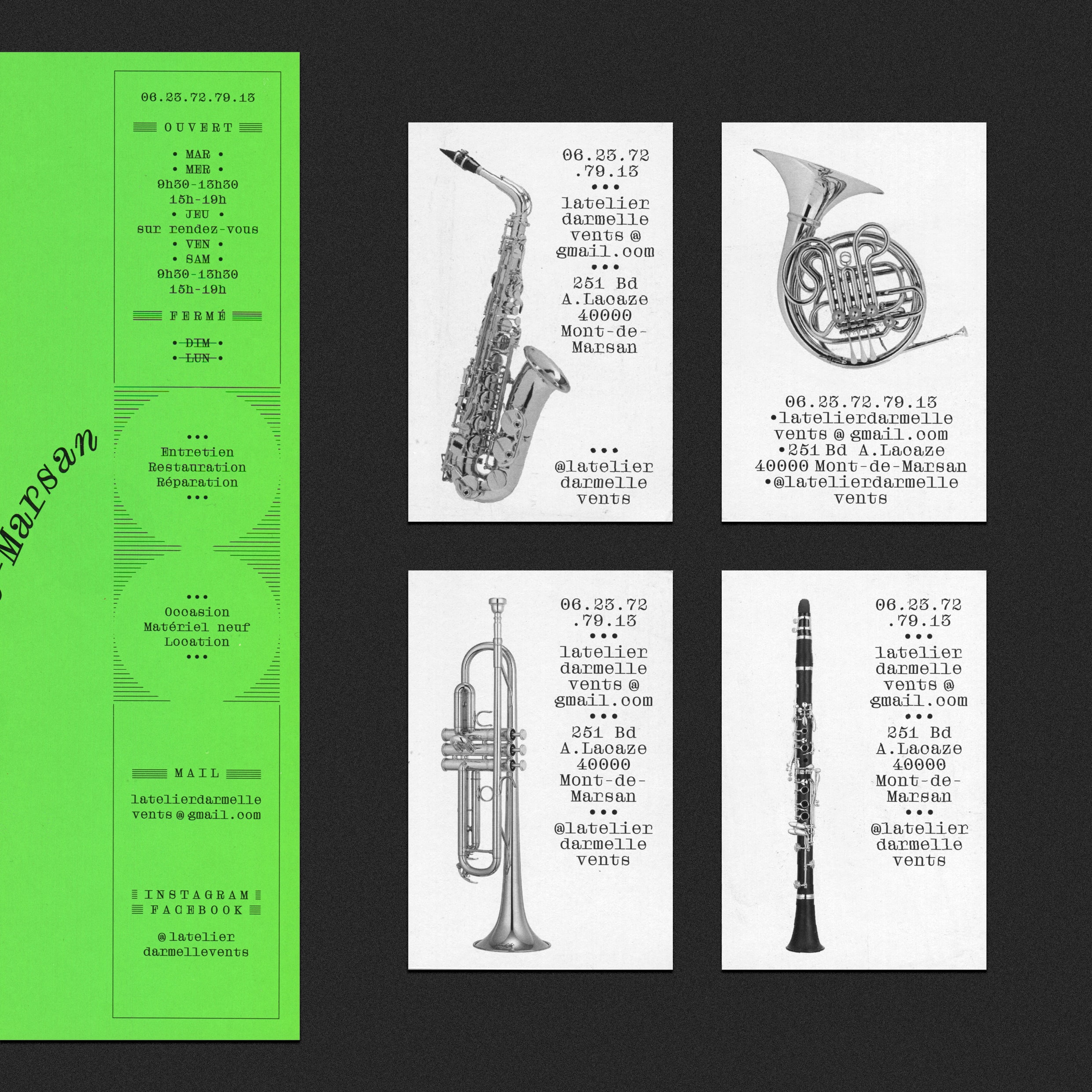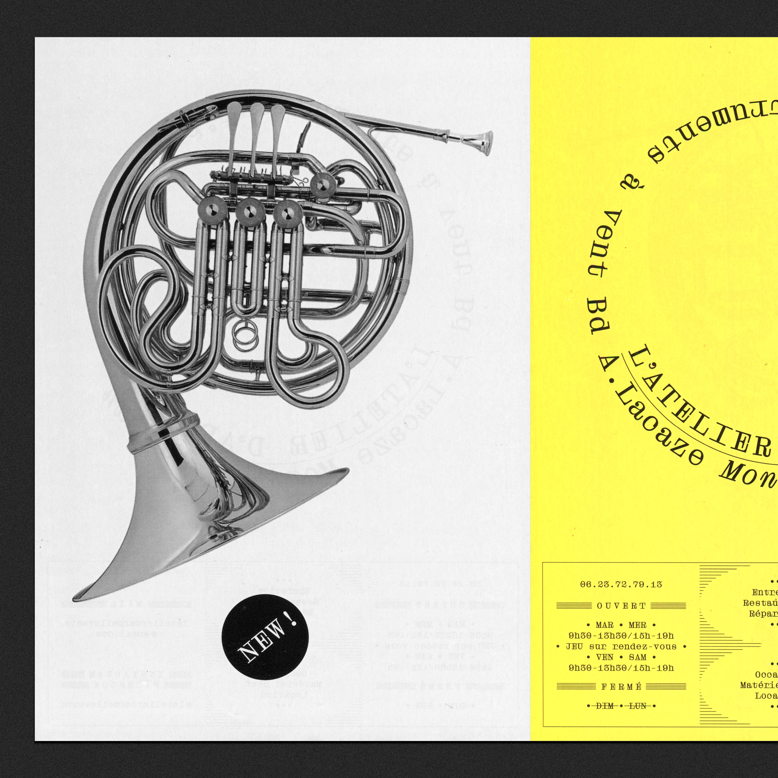 To anchor her workshop in the local musical culture, Antoine Lemarchand and Noémie Santos designed communication media which evoke the posters of votive festivals, ferias and bandas printed on a plain colored background. The lines of text follow the typical shapes of the instruments that she restores.