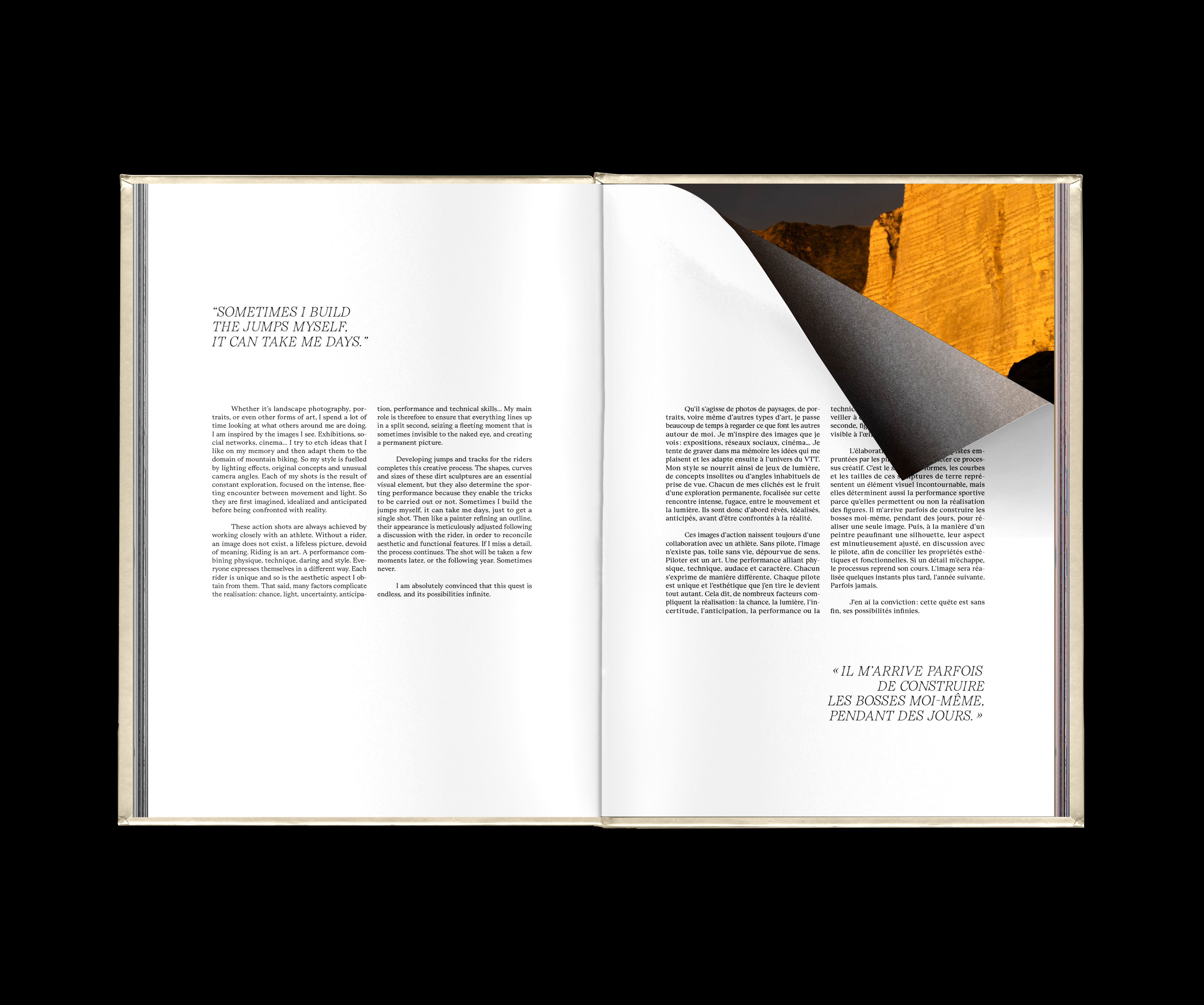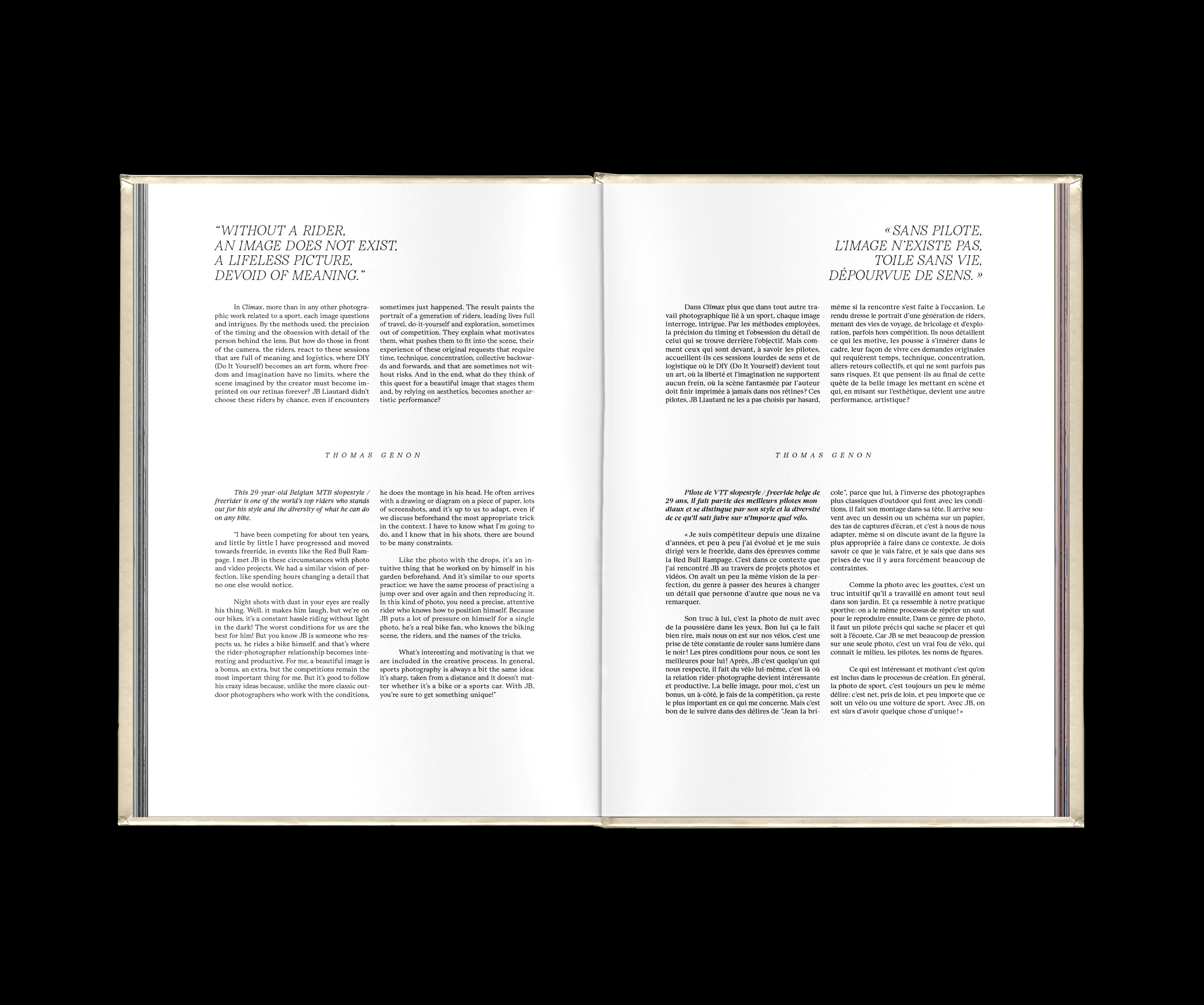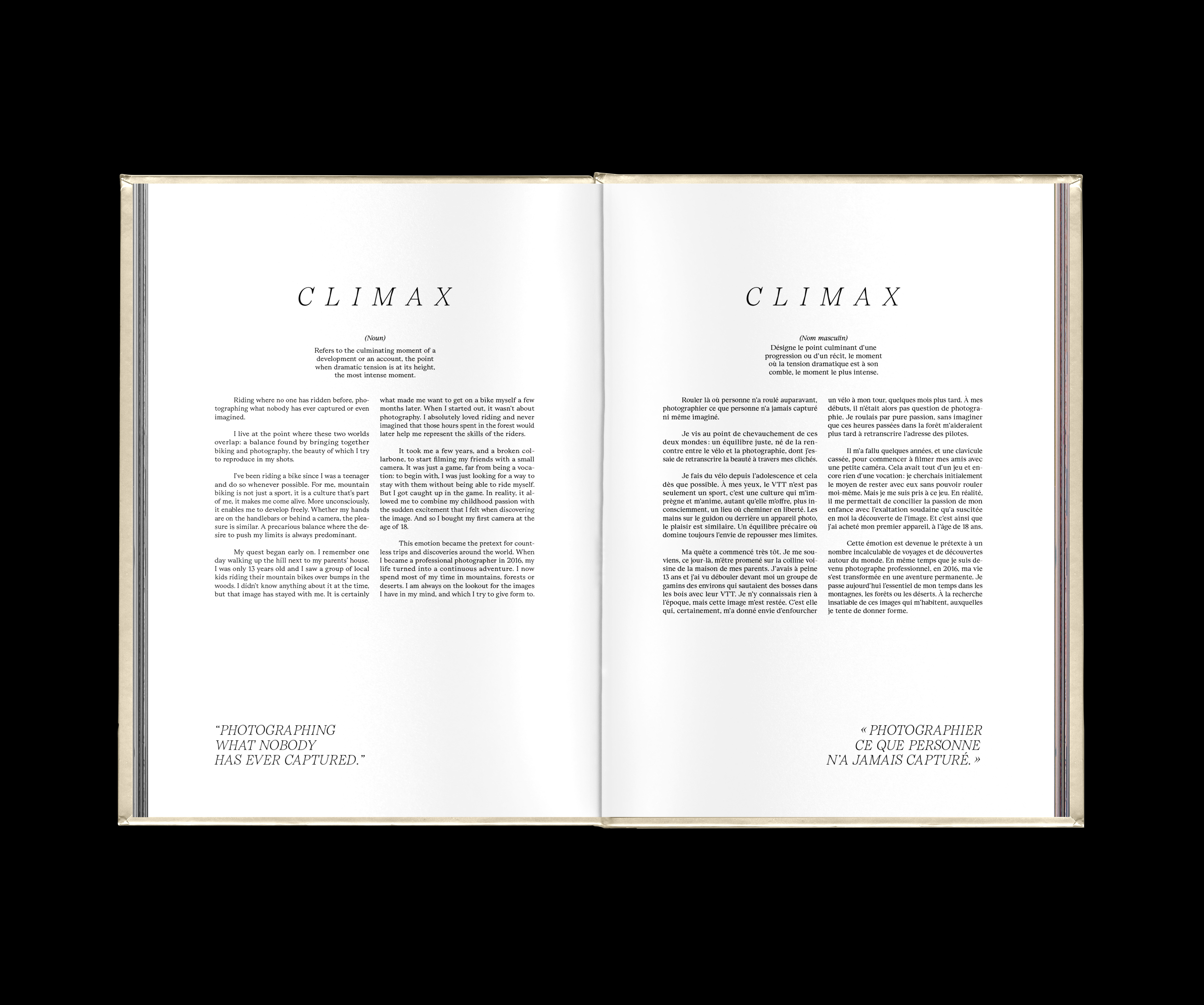 Climax is the first book by Jb Liautard, a 27-year-old French talent who turned to photography after falling off a mountain bike. Liautard transforms the bicycle into poetry, sport into art. He is an artisan of the perfect image, which he tracks down in the most beautiful landscapes in the world, with the complicity of the best international mountain bike riders. The book was successfully crowdfunded and published by Éditions Mons.