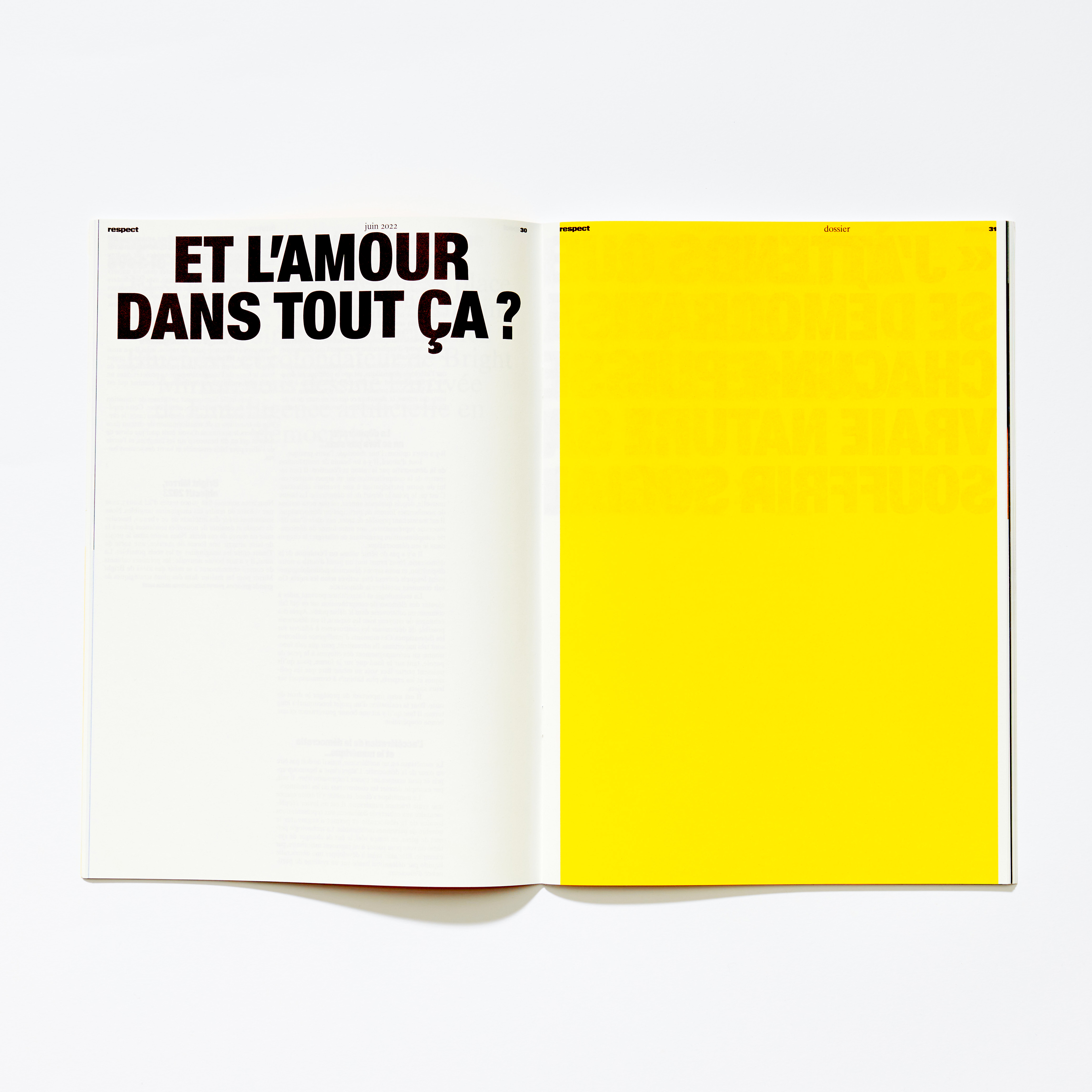 Respect is a French magazine which is posted quarterly. It is designed by Paris-based graphic design studio Zoo using Waldenburg, paired with a version of Times.