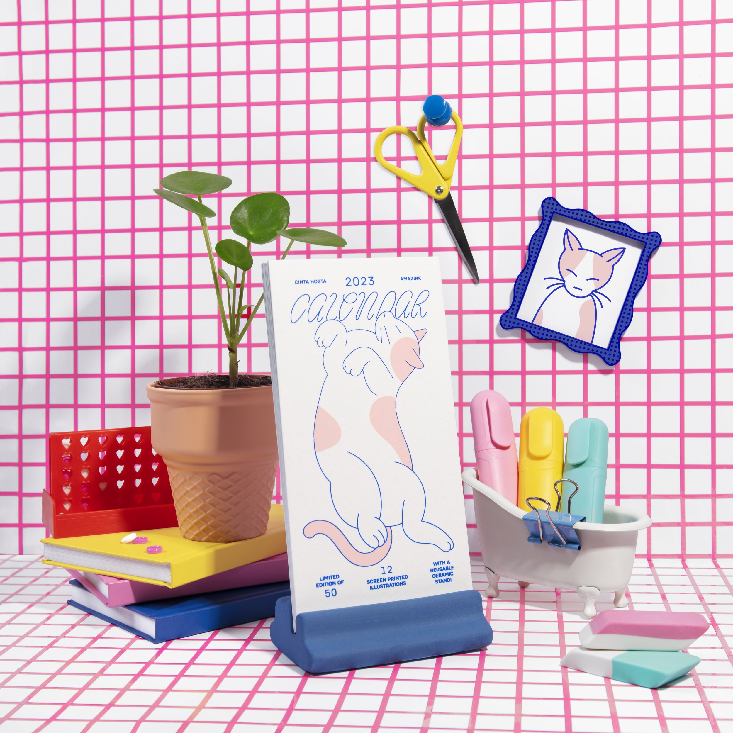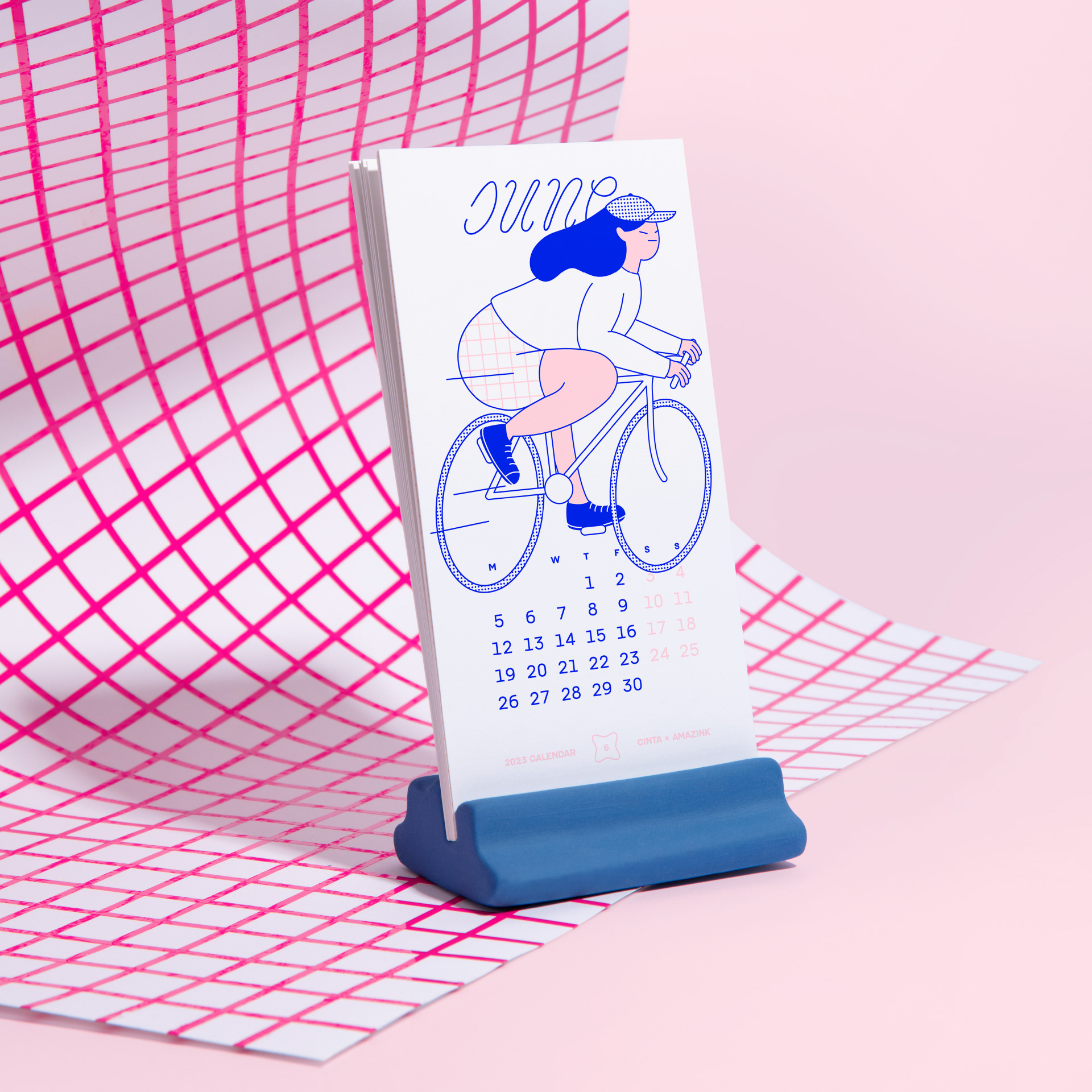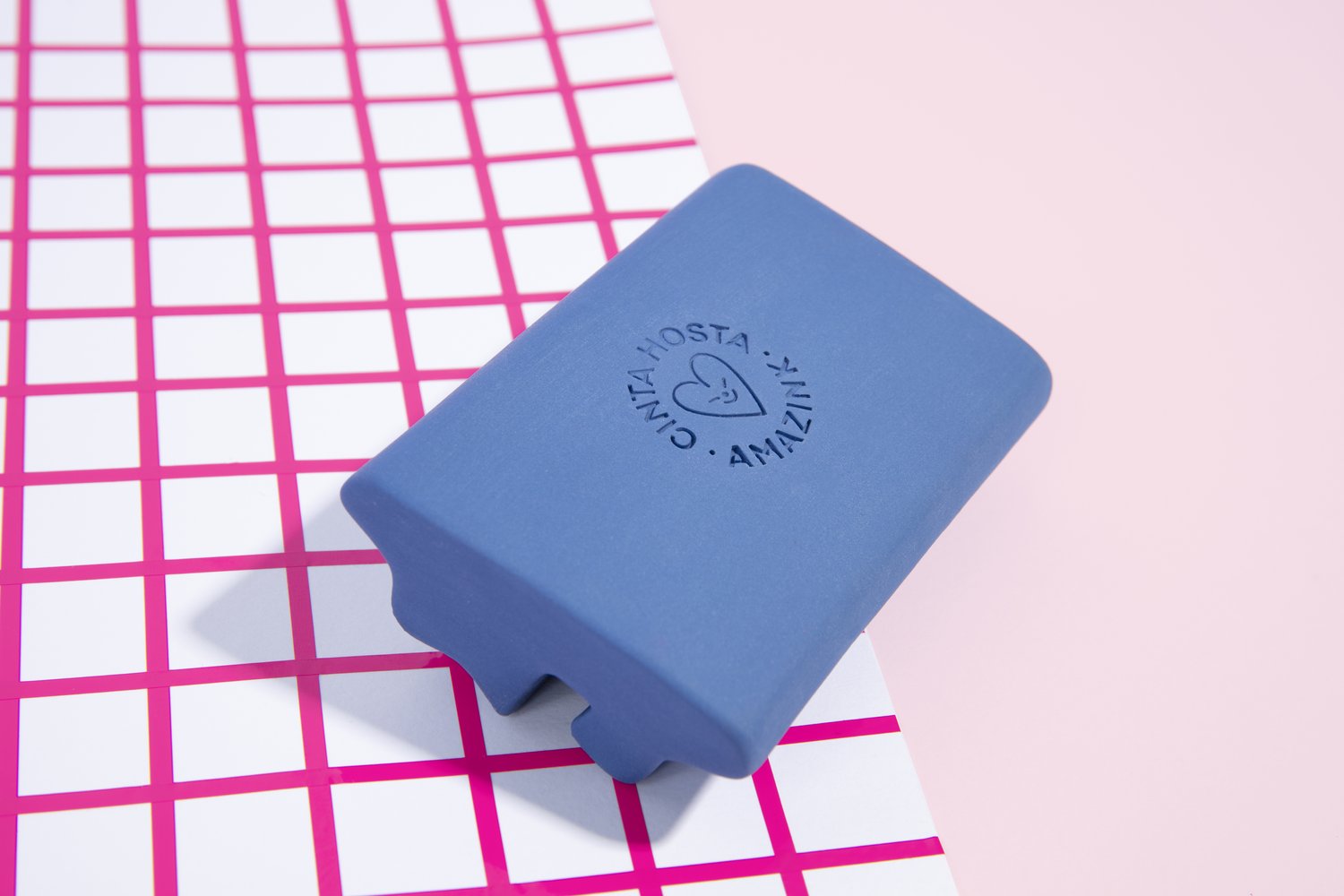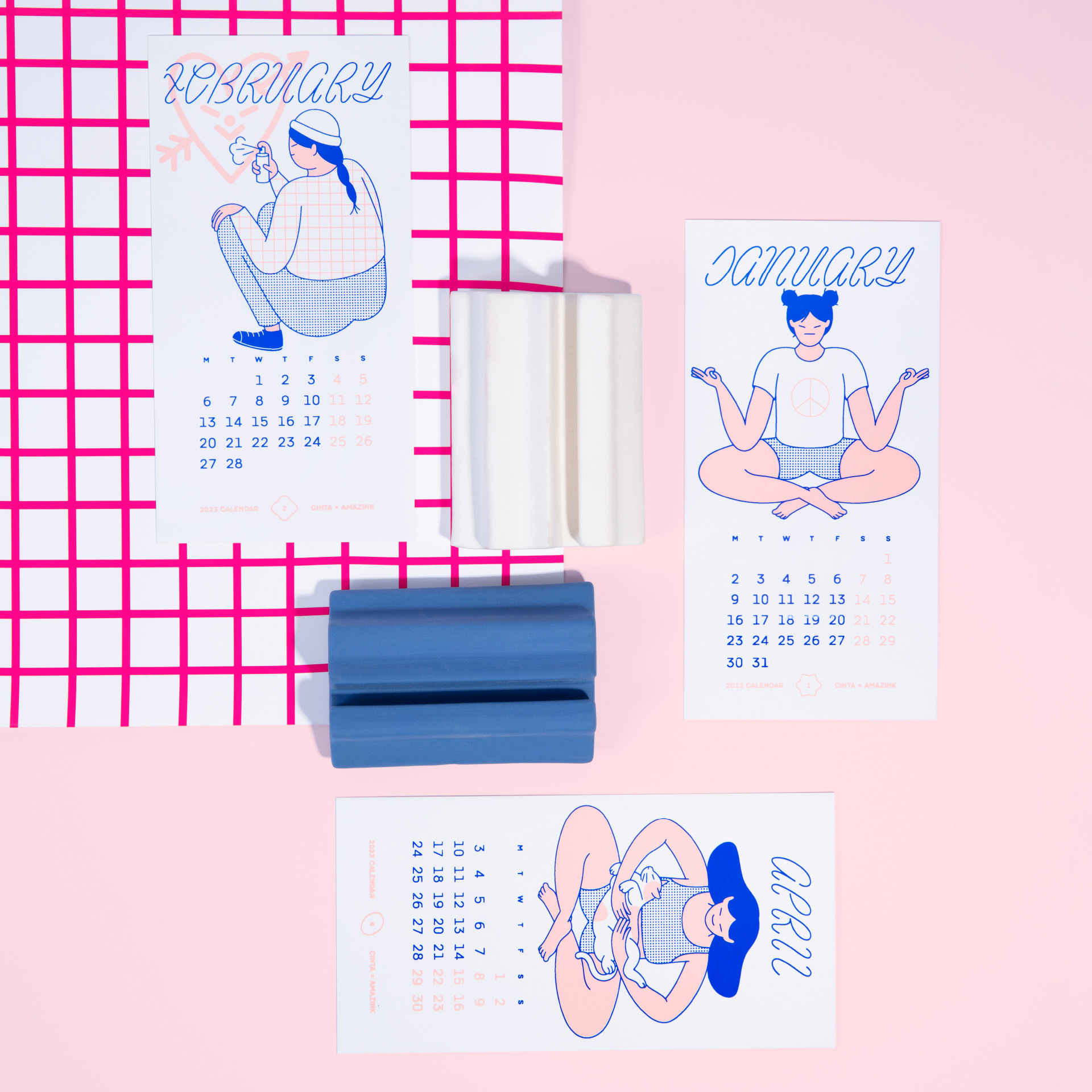 This 2023 desk calendar uses Pacaembu as the text face and Pentool to set the names of each month. Pacaembu also features in a 3D printed punch, which was used to engrave the base of the ceramic stand with the names of both collaborators in the project: Barcelona based graphic designer and illustrator Cinta Hosta and screen printing specialists Amazink Print Studio.