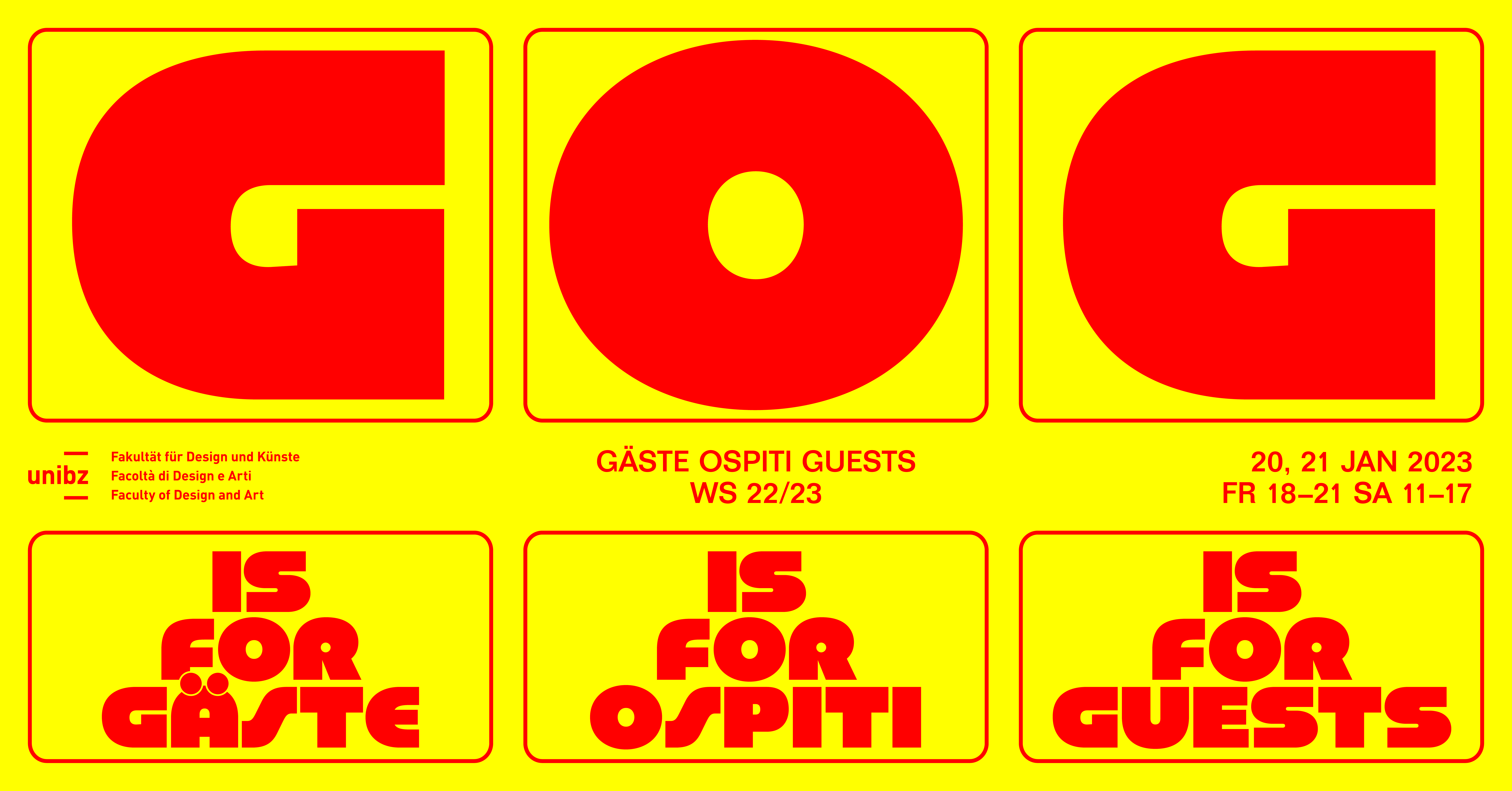 GOG – Gäste Ospiti Guests – is an exhibition of the projects developed by the students of the Faculty of Design and Art of the unibz – Bolzano, South Tyrol, Italy. At the end of each semester, the work produced by the students in the fields of visual communication, product design and art is displayed in the spaces of the Italian university.