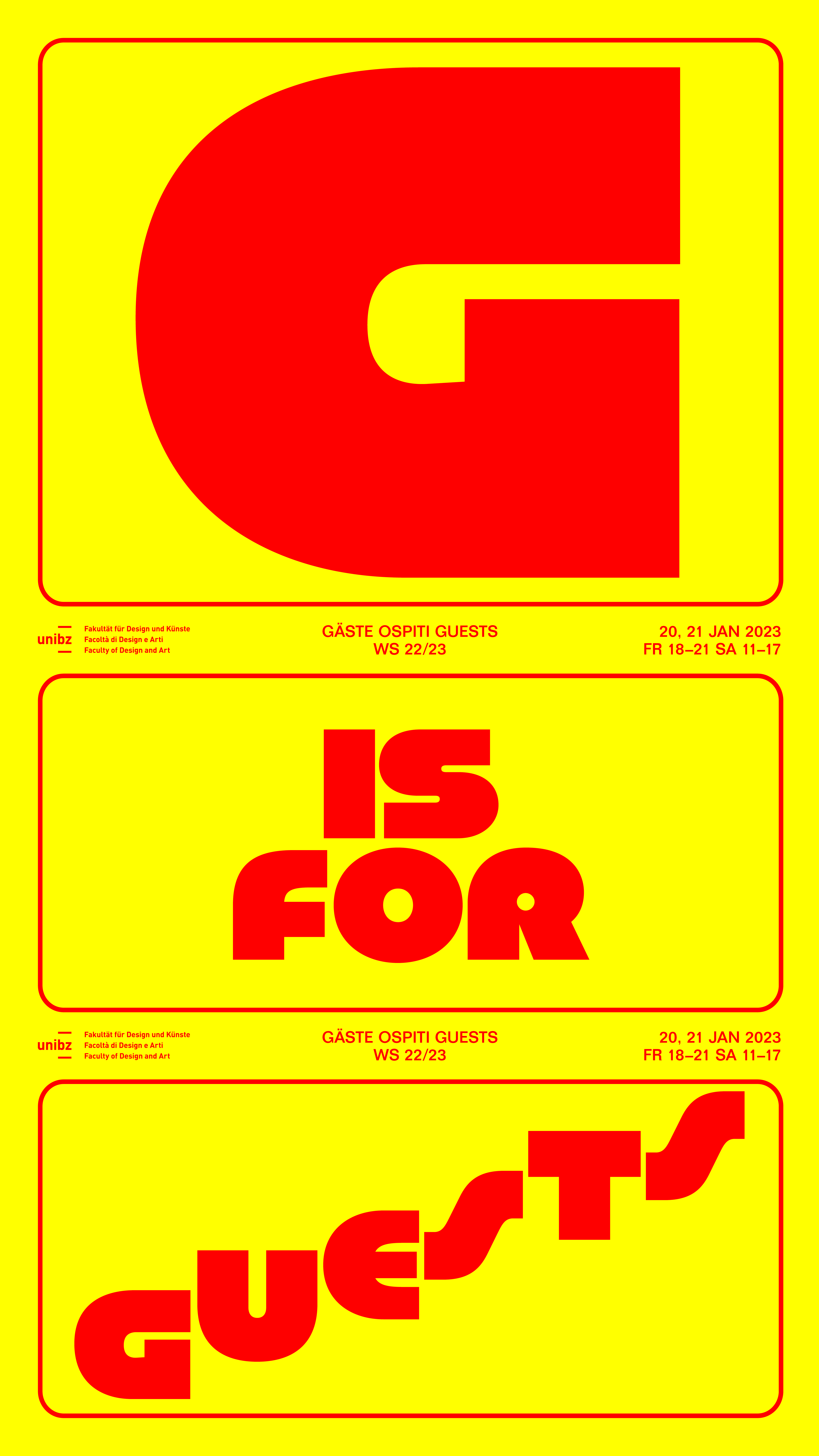 The visual communication developed for the winter semester 2022/23 edition of GOG uses the Baustraße font designed by Fantasia Type. It’s supported by Folio. The unibz logo uses FF DIN.