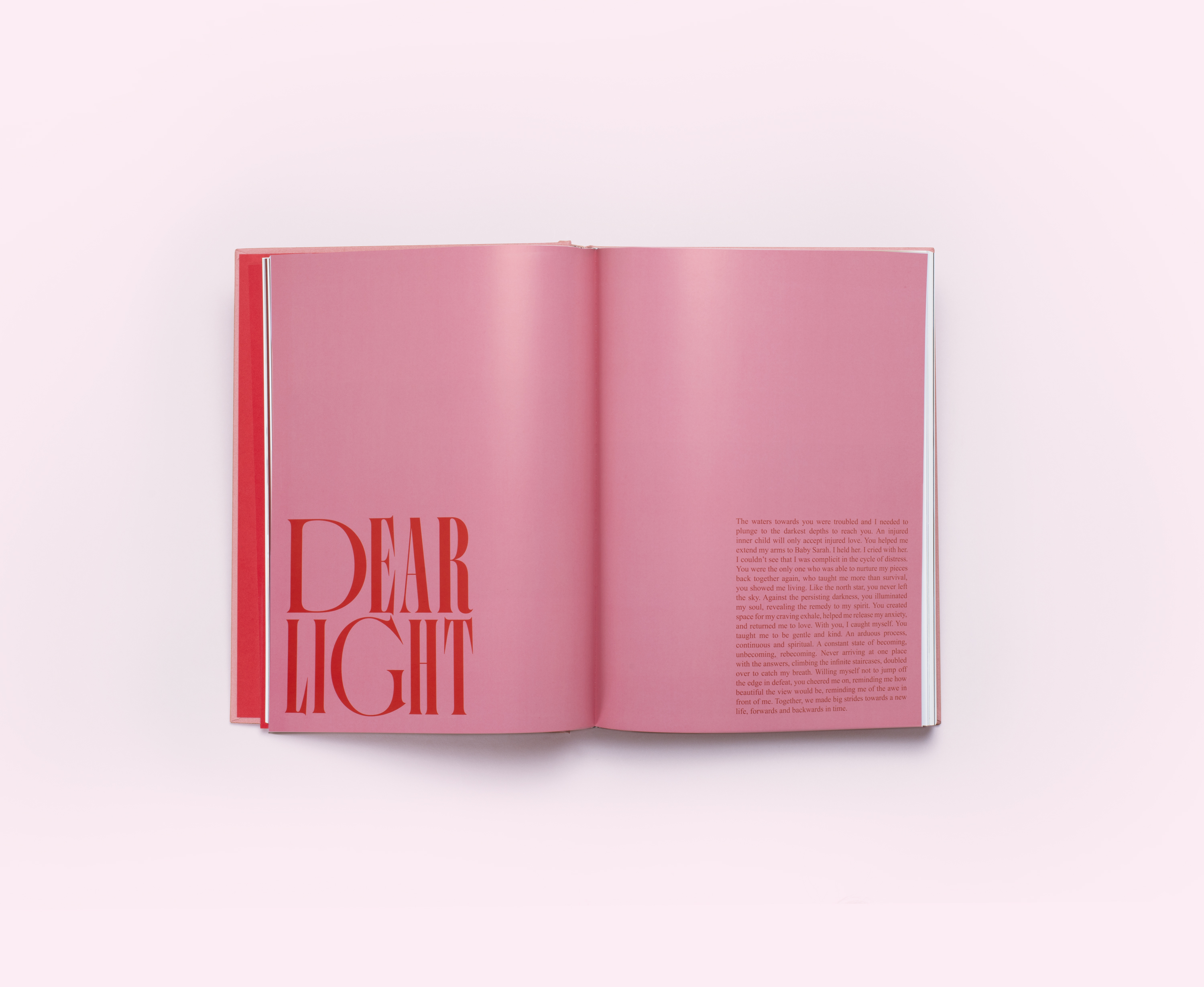 The combination of metallic red hot foil stamping on a linen hard cover further enhances Dear Love’s emotional impact. The book is smyth-sewn, with woven headbands, and includes four satin ribbons for bookmarking.