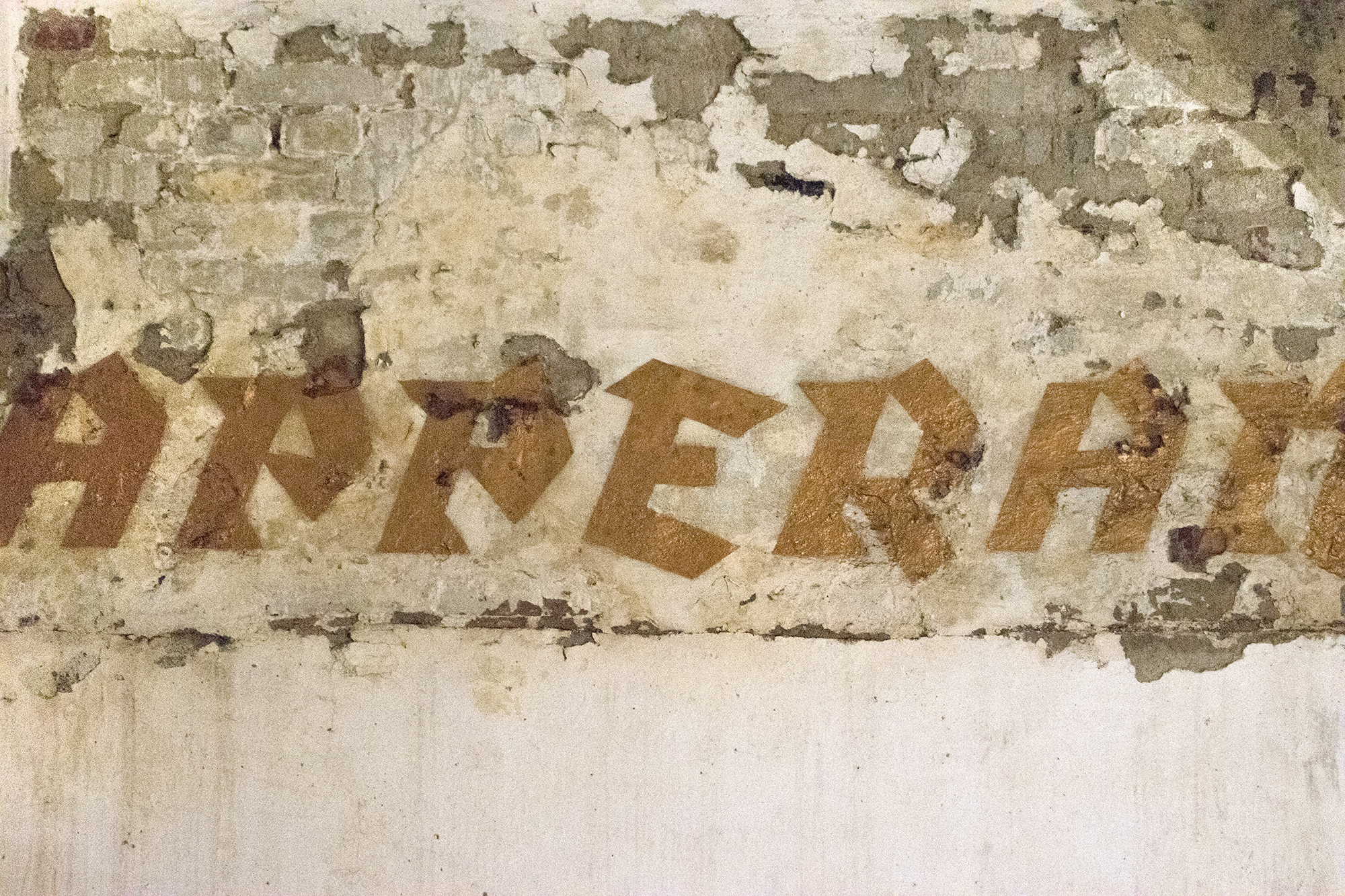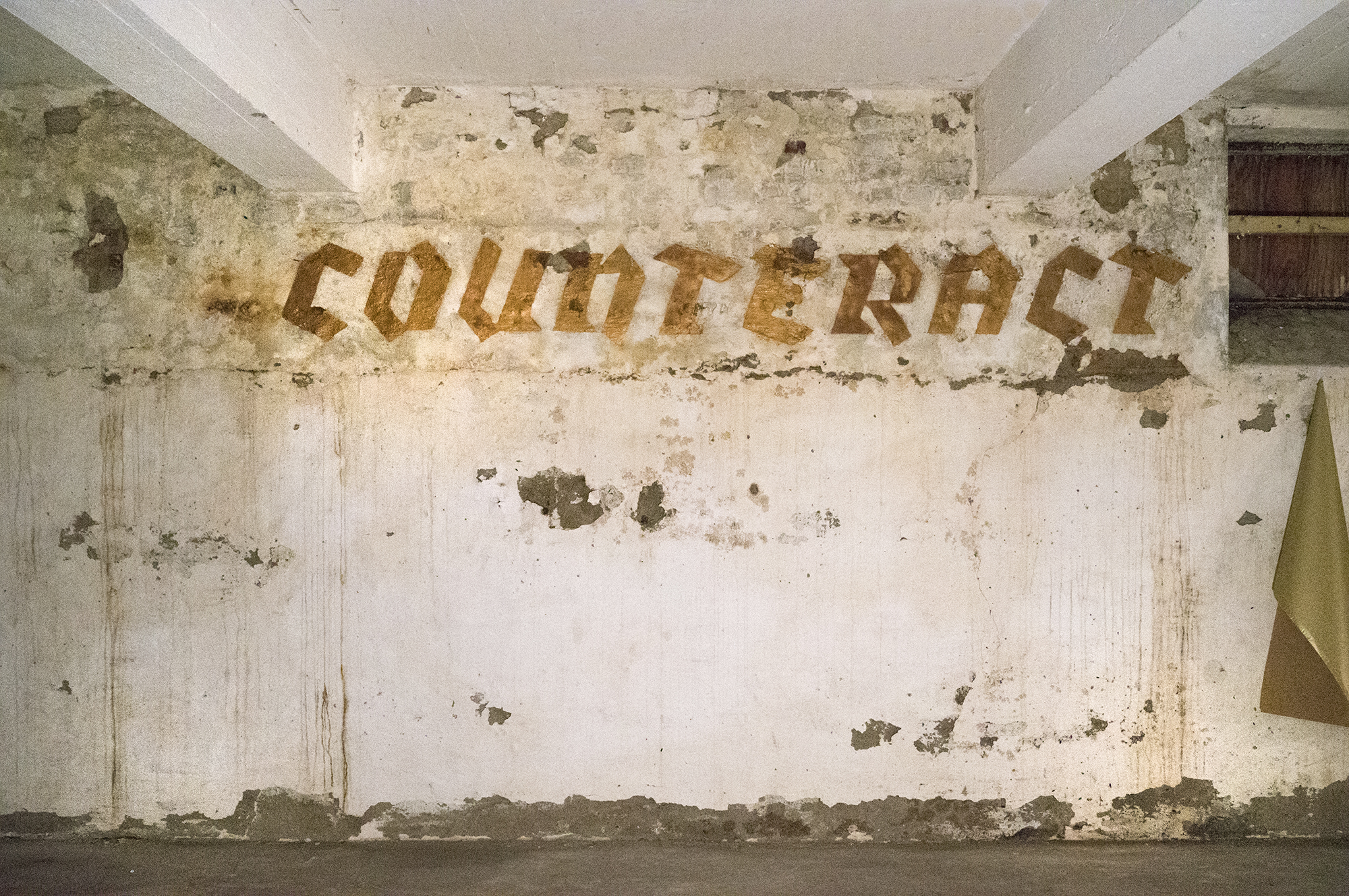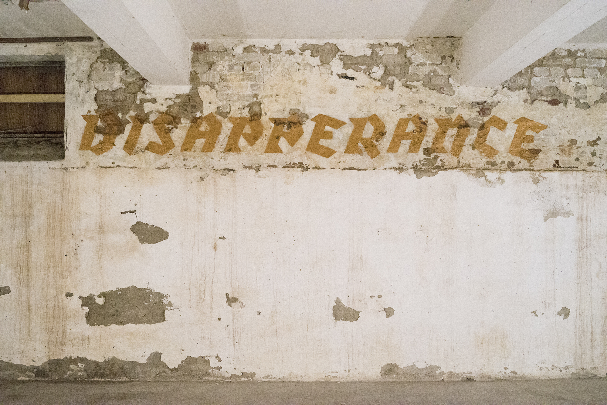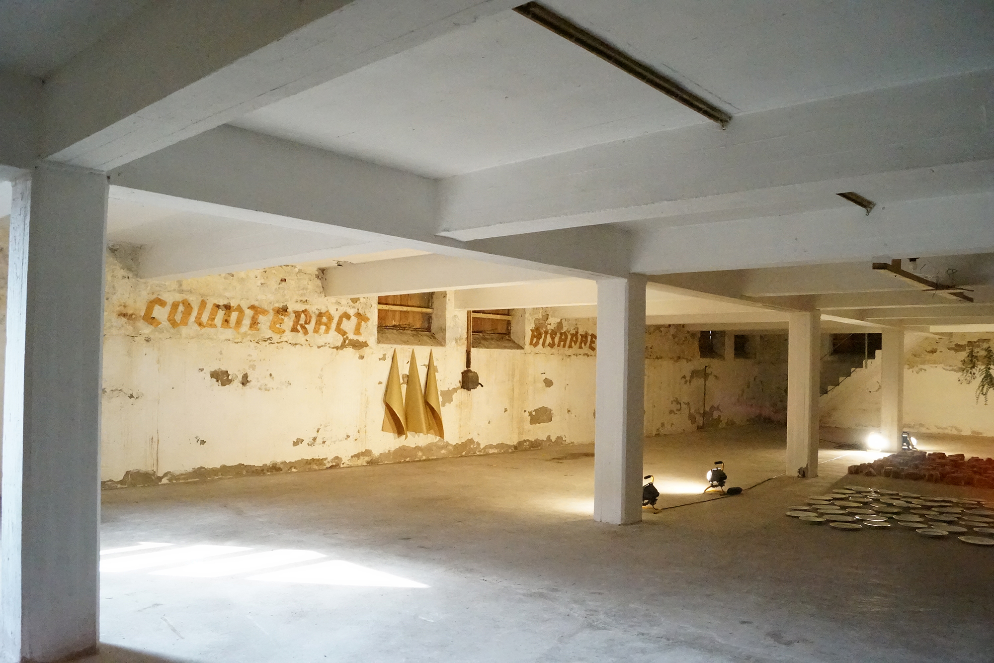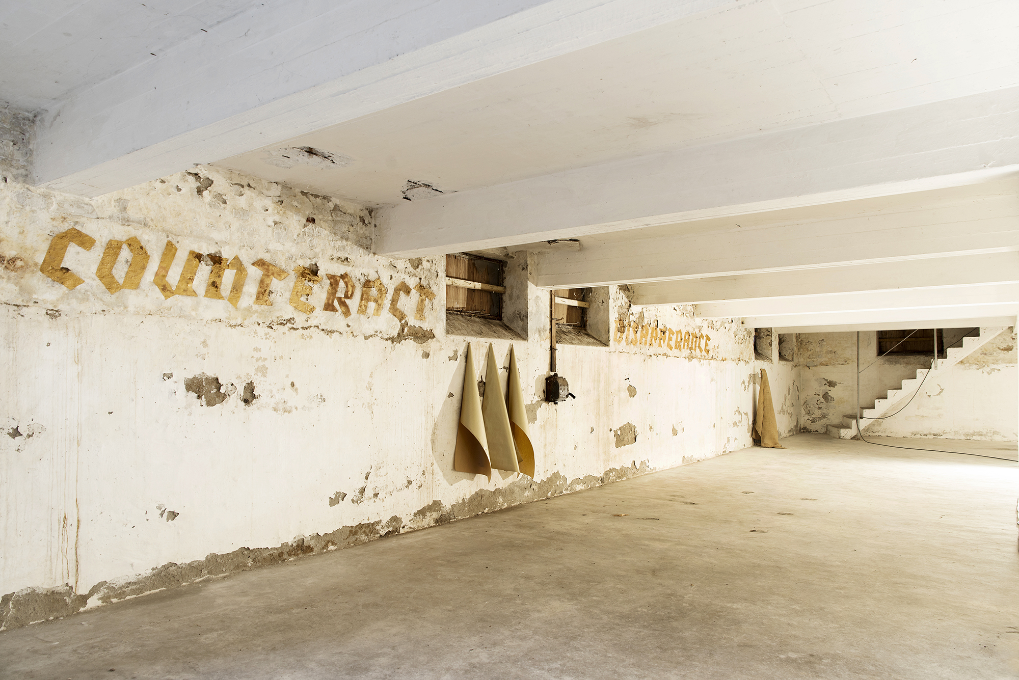 On the walls of one of the storage spaces of the former factory, the letters of the words Counteract Disappearance are applied in gold coloured spray paint. The colour and the words, although intensely applied to the mortar and lime of the walls, eventually peel, crack and fall away, reflecting the impossibility of maintaining the status quo, painting a picture of the impossibility of uphold the present and of postponing the future.