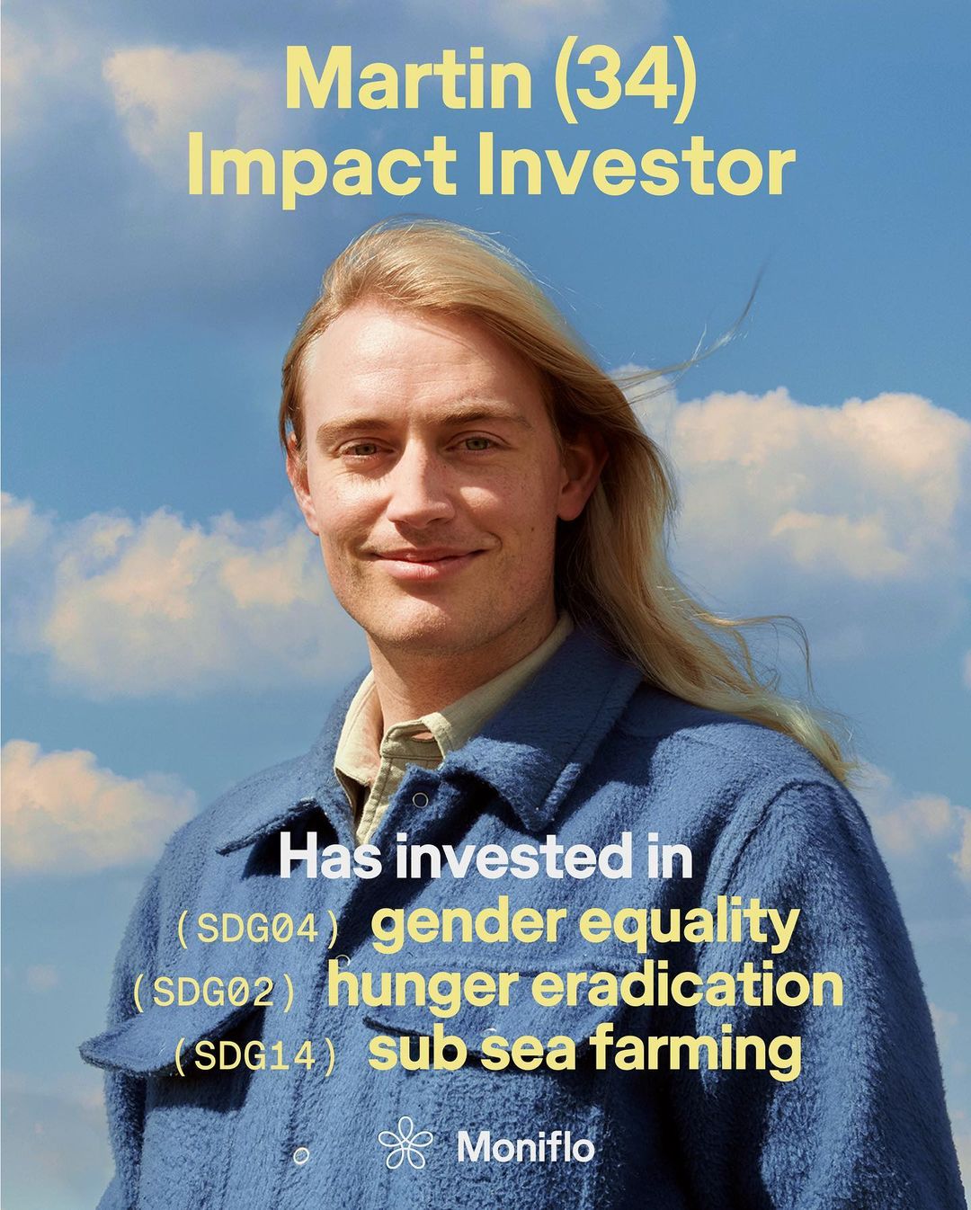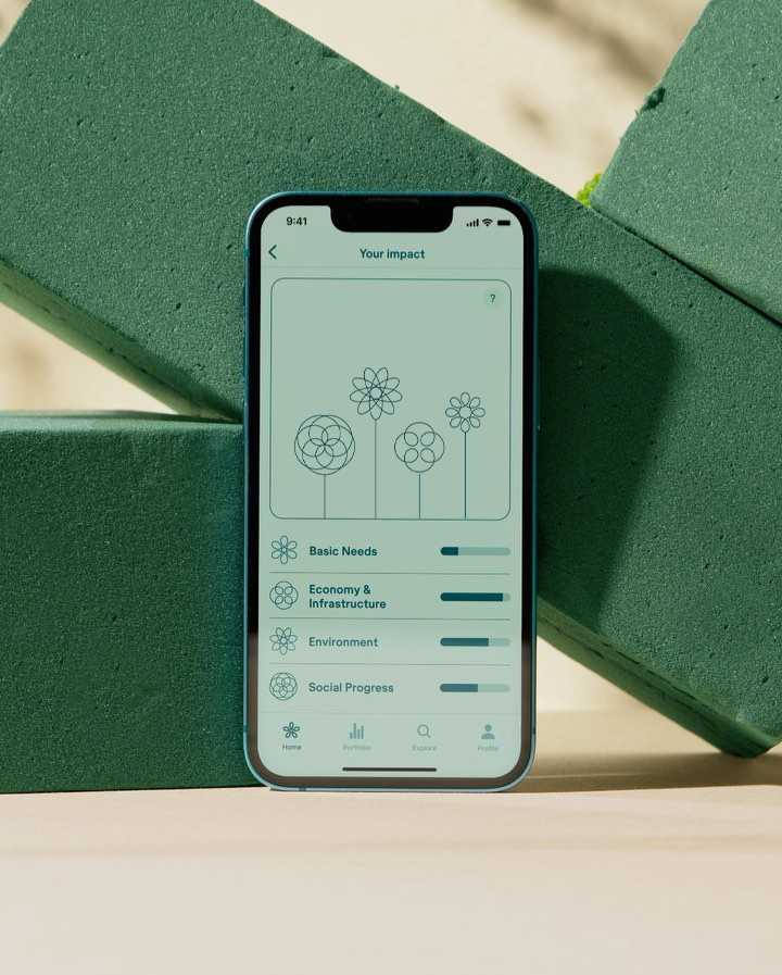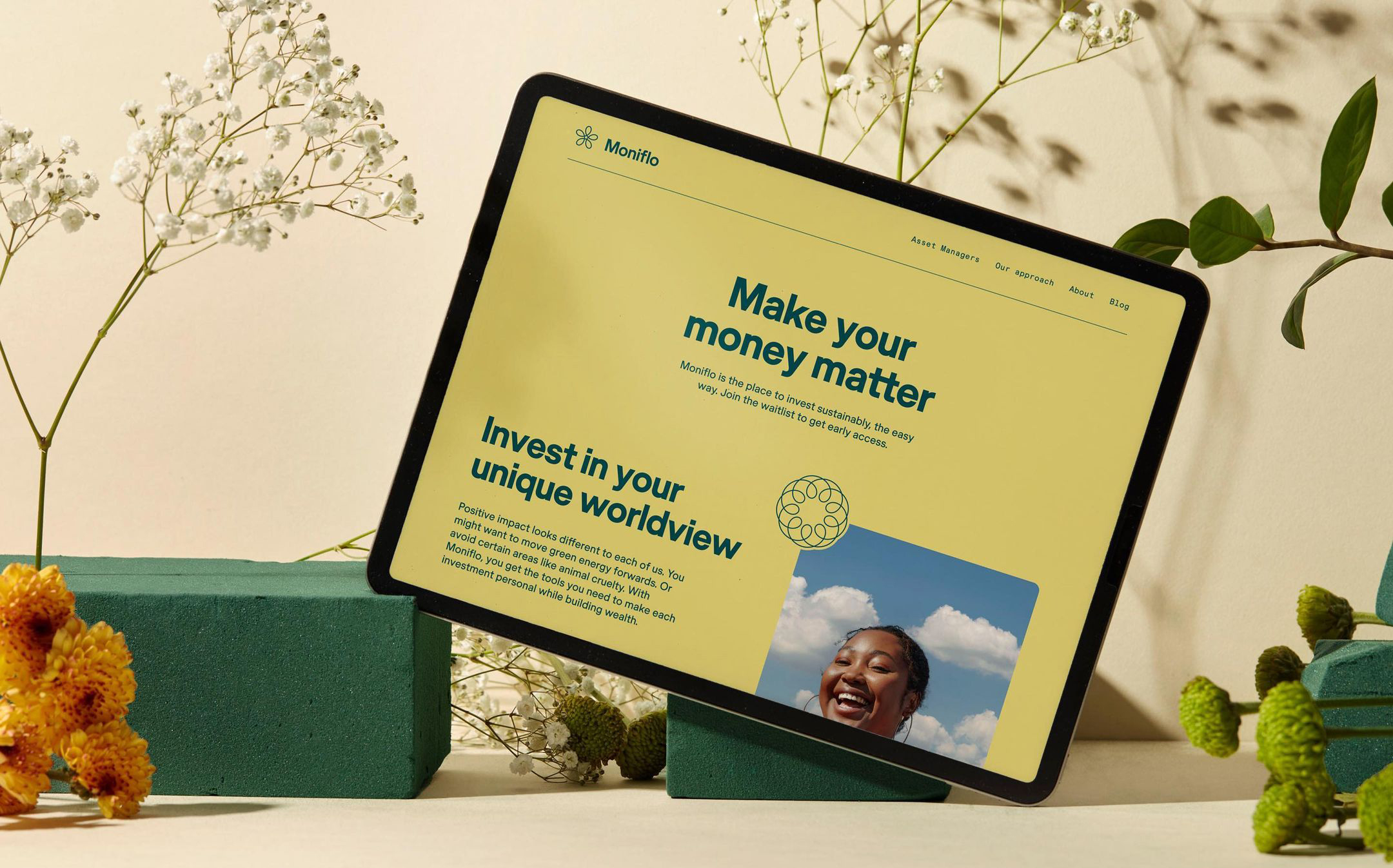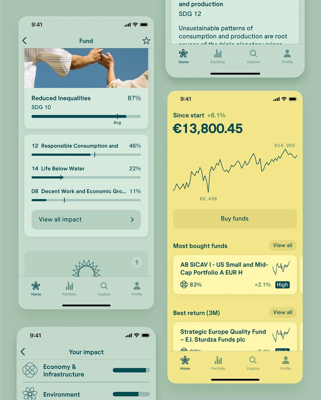 Moniflo offers simple fund investing with a focus on sustainability. By using the UN’s Sustainable Development Goals to highlight the real-world impact of your investments, you get valuable insight that can guide you towards more than just financial return. The service and identity are also designed to give the financially inexperienced a simple and accessible entrance to invest, regardless of skill or investment amount. The flower metaphor and colors signal an uplifting, sustainability-focused growth and play a prominent part in Moniflo.
