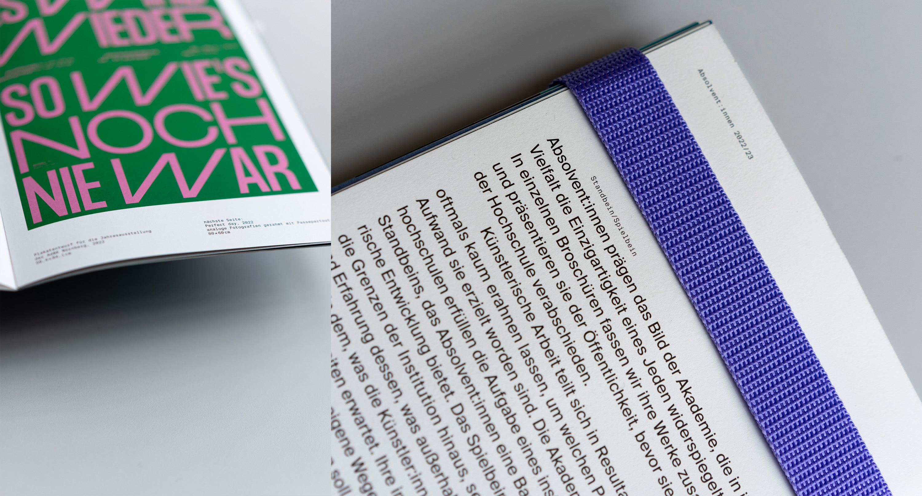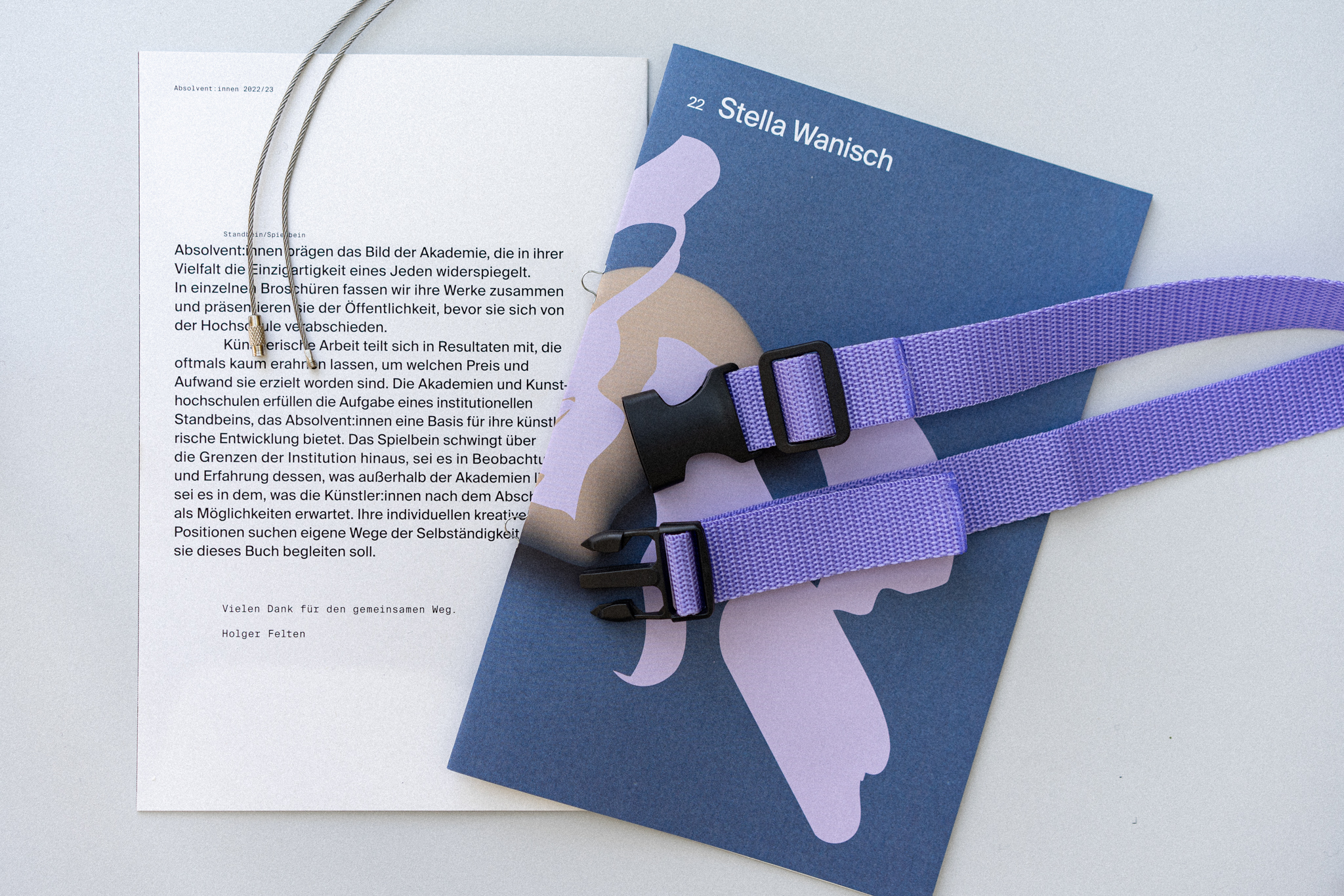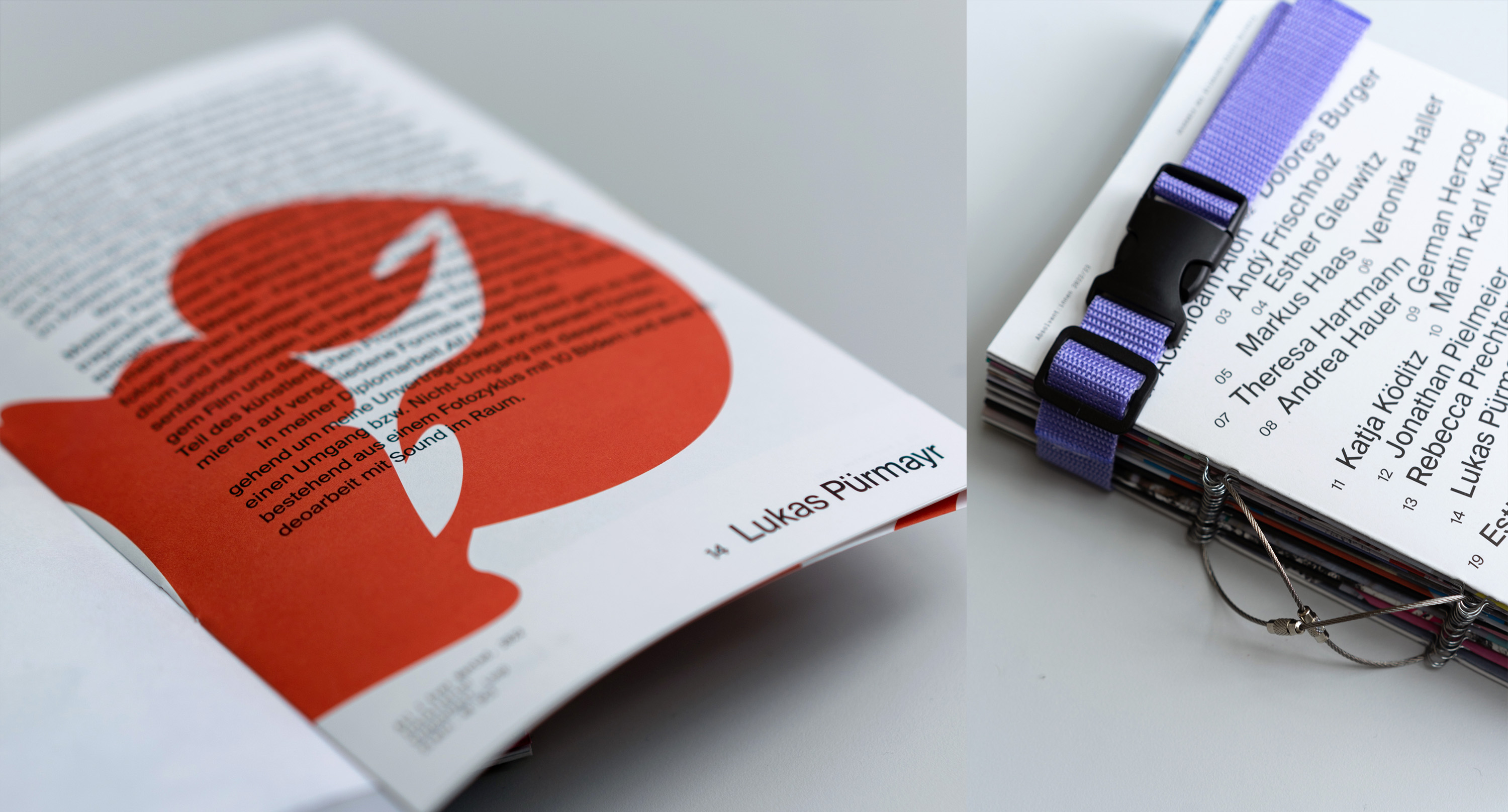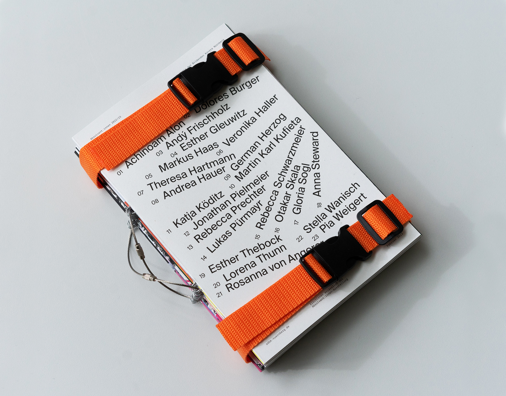 Created on the occasion of a group exhibition, the Absolvent:innen 2022/2023 (“Graduates 2022/23”) catalog contains works from graduates of all classes of the Academy of Fine Arts Nuremberg. Every graduate has their own booklet, containing works, awards, exhibitions and personal information. Bound together by straps and wire rope, these booklets together form the catalogue.