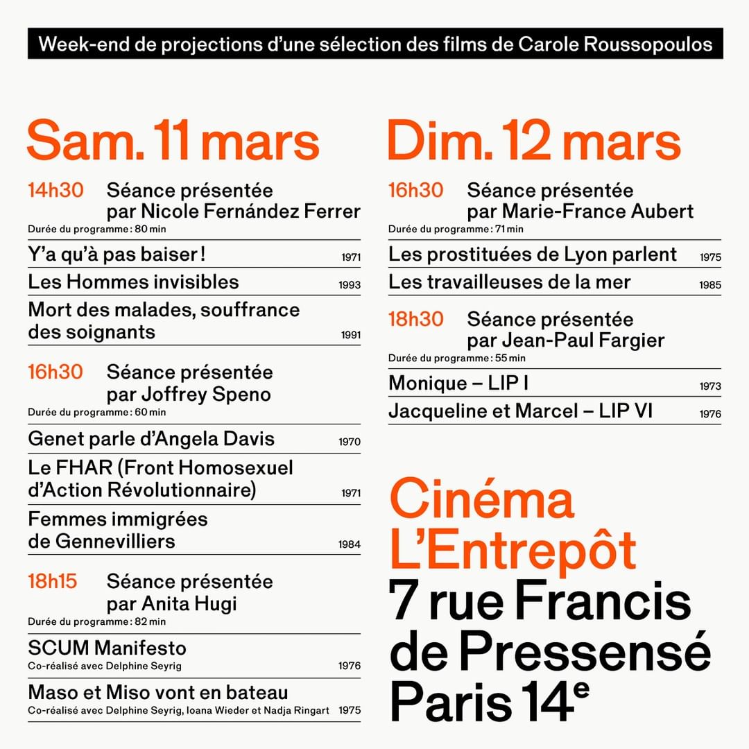 Great joy to announce several events, on March 10, 11 and 12, in tribute to Carole Roussopoulos, co-organized by the City of Paris, the Centre Audiovisuel Simone de Beauvoir, the cinema l’Entrepôt and Carole Roussopoulos’ family.