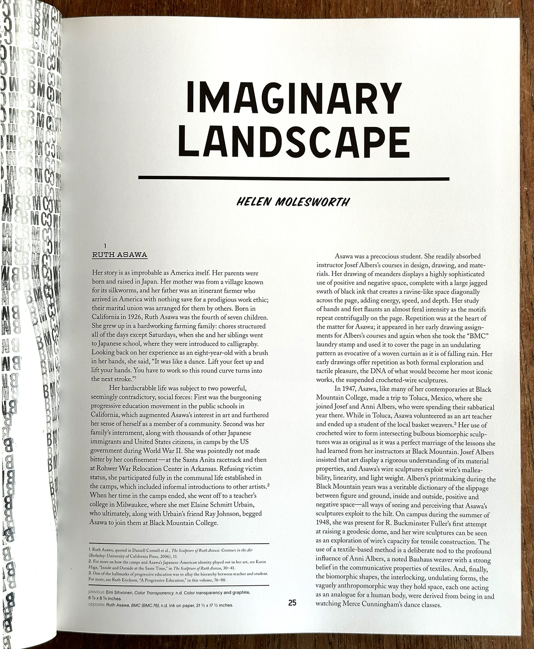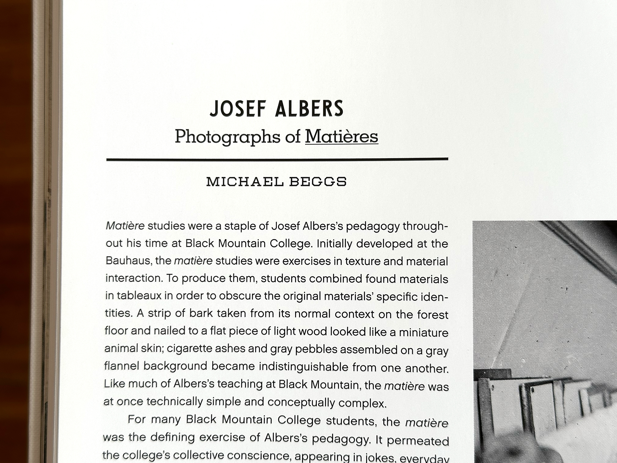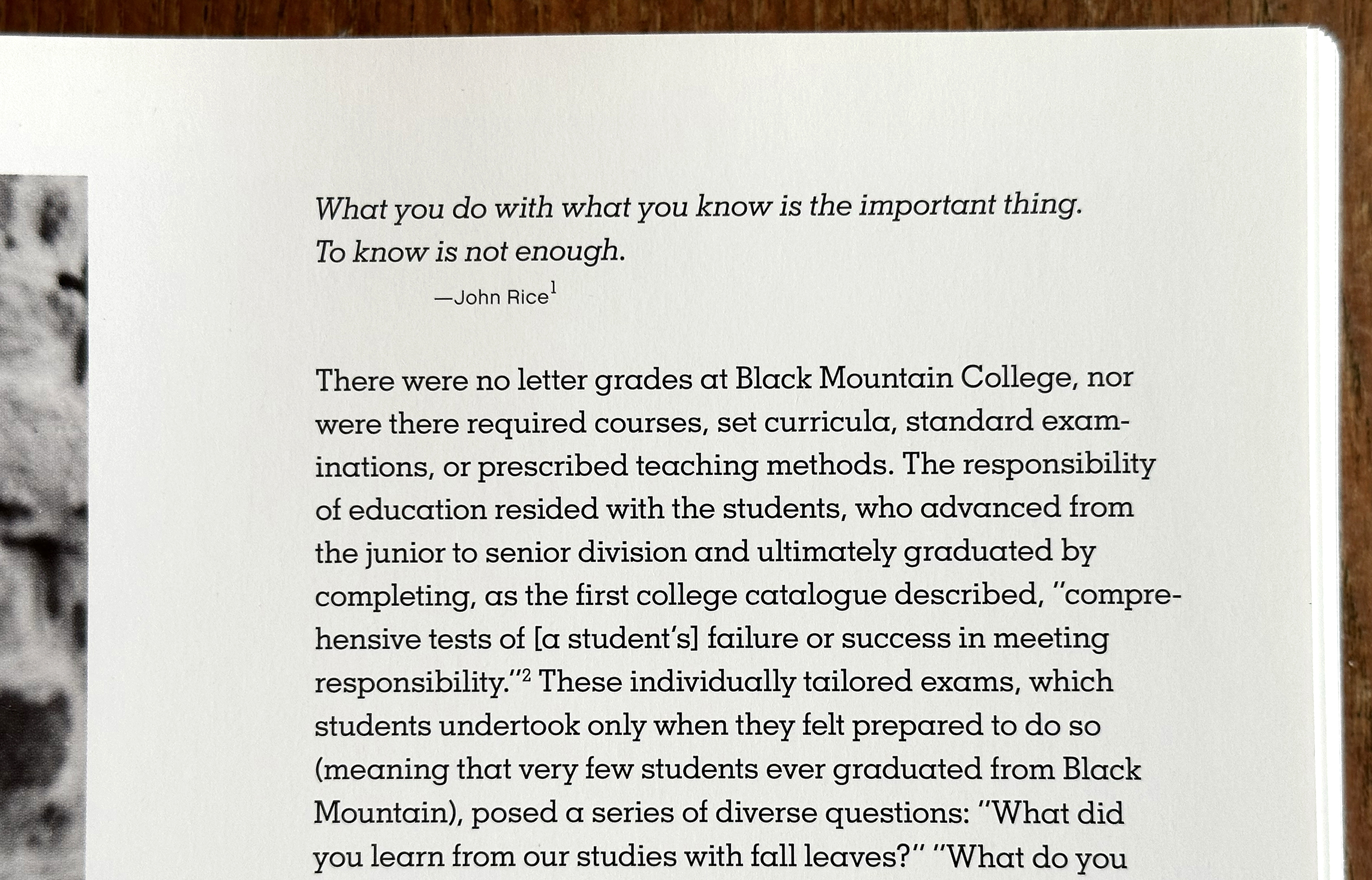 The catalogue’s eclectic typography reflects the radical, utopian, and idiosyncratic pedagogy of Black Mountain College, combining multiple typefaces — many from Jeff Levine — to surprising effect.
