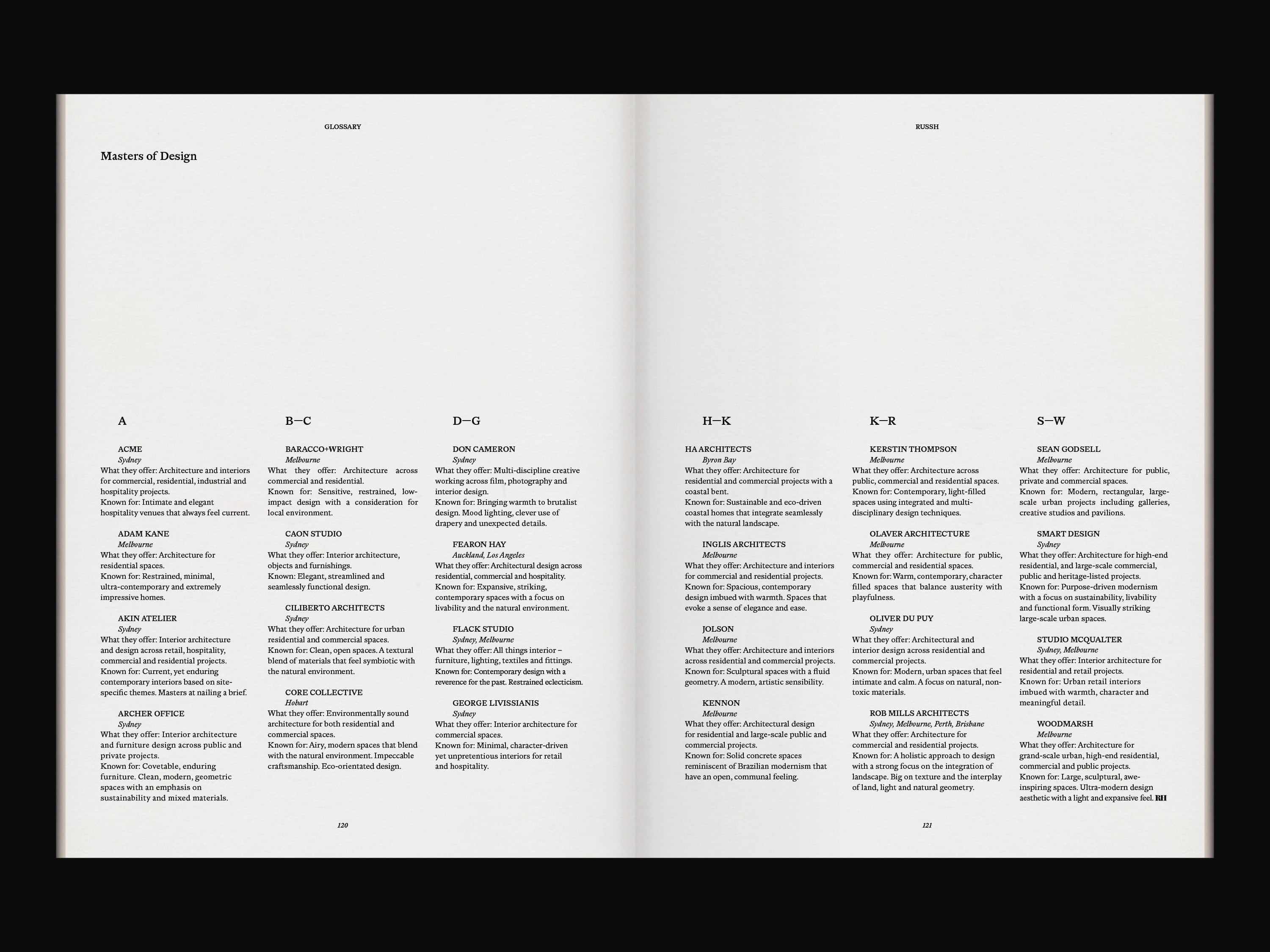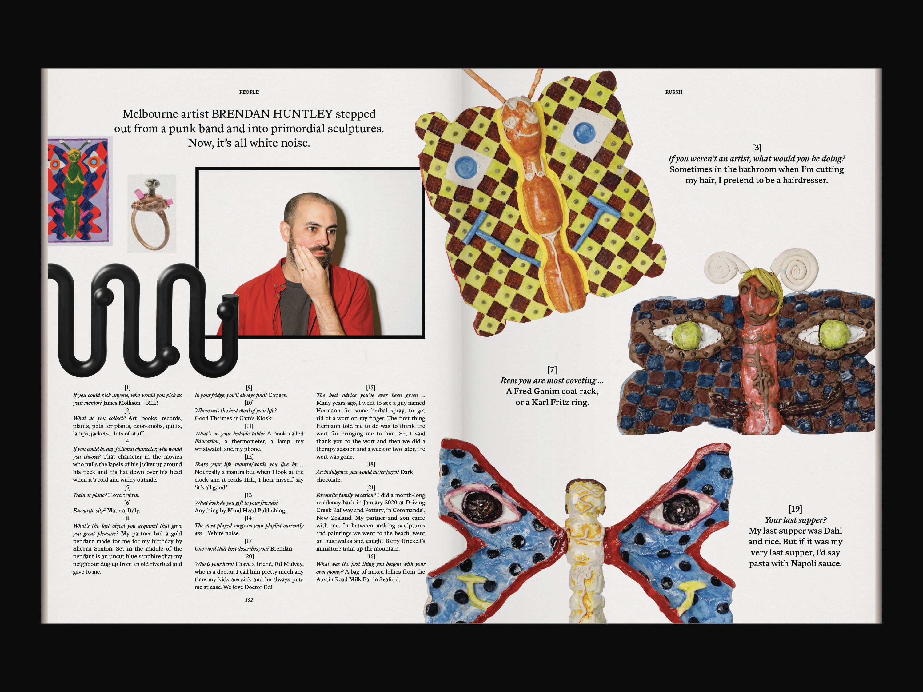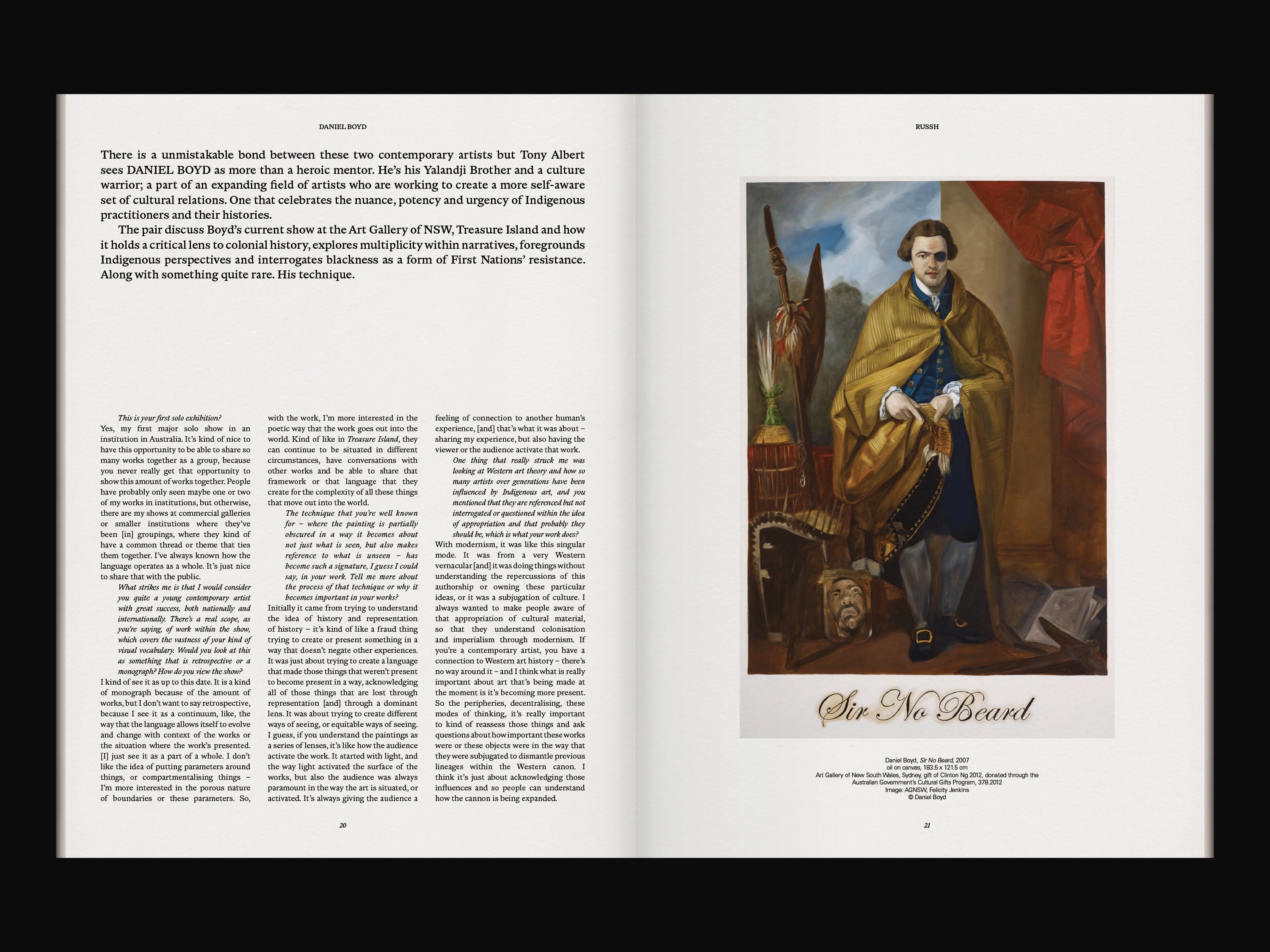 RUSSH Home is a new magazine that offers an inside look into the creative minds of individuals who reject traditional aesthetic conventions. The magazine explores the spaces and internal worlds of architects, designers, and other creatives to gain insight into the internal landscapes that shape their work and our culture. The first issue, edited by Tamsin Johnson, and art directed by TRiC Studio, features original content and intimate conversations with a diverse group of individuals, including Tony Albert, Daniel Boyd, Lucy Folk, Eny Lee Parker, Quentin Jones, Alexandra Agoston, Bill Henson, Tom Riley, Laila Gohar, Sophie Dries, Marc Leschelier, and Adrien Mesko. The cover art, Untitled, (GB), 2015, by Daniel Boyd, is a critical examination of colonial history and Indigenous perspectives.