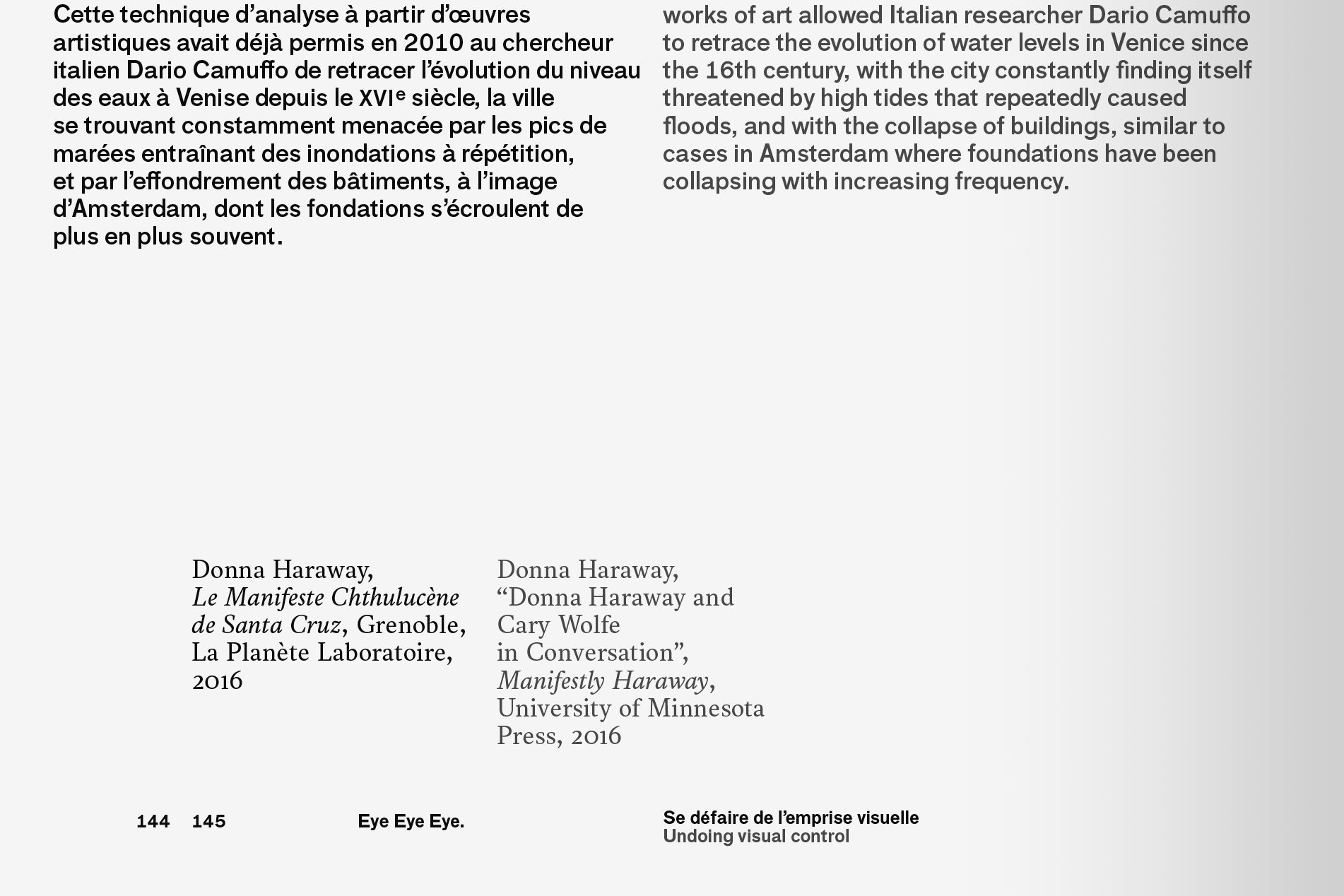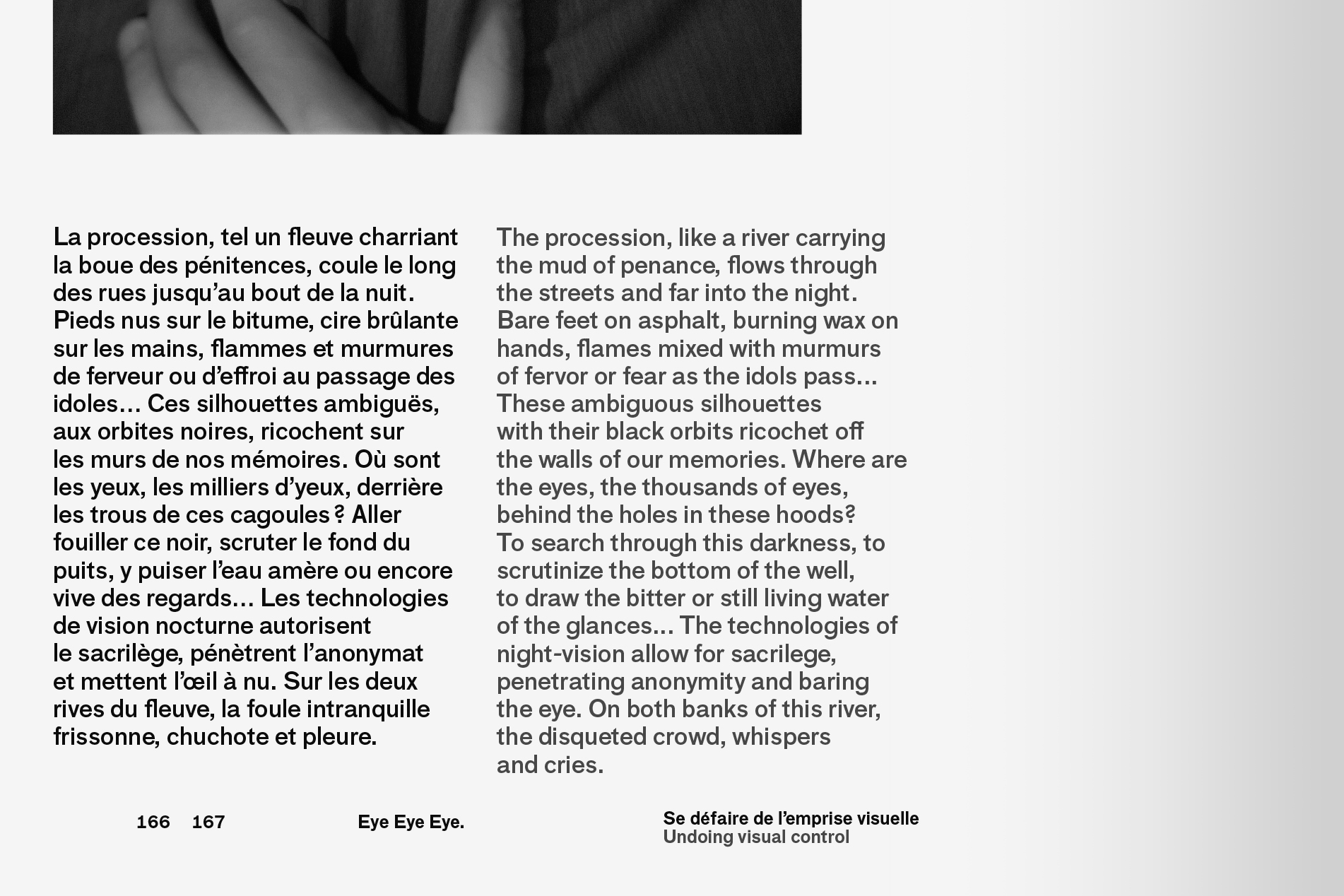 To design the book Eye Eye Eye. Undoing visual control published by Éditions 205, Bureau 205 used the typefaces Alcalá and Plaax, both designed by Damien Gautier, and F Grotesk designed by Radim Peško.