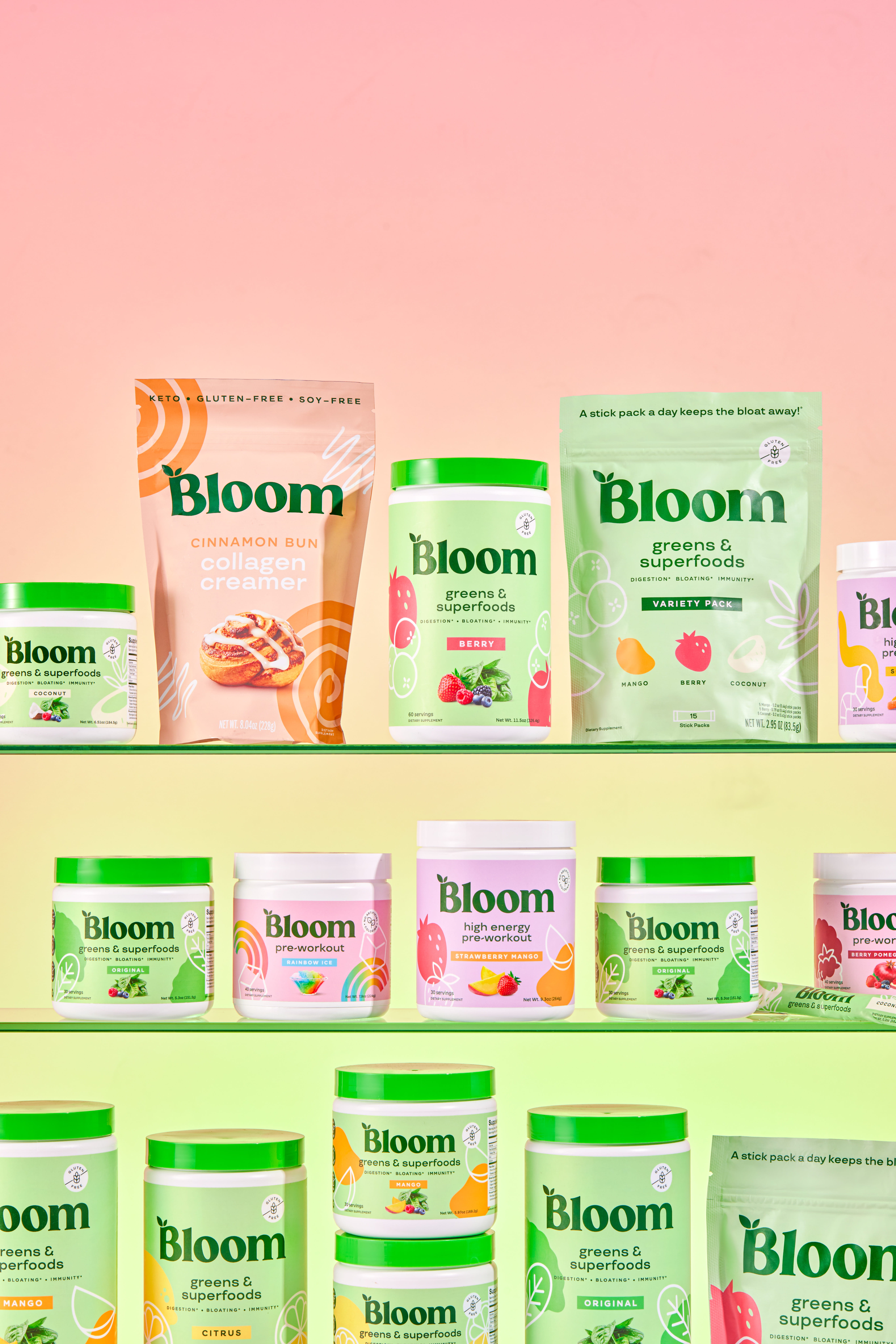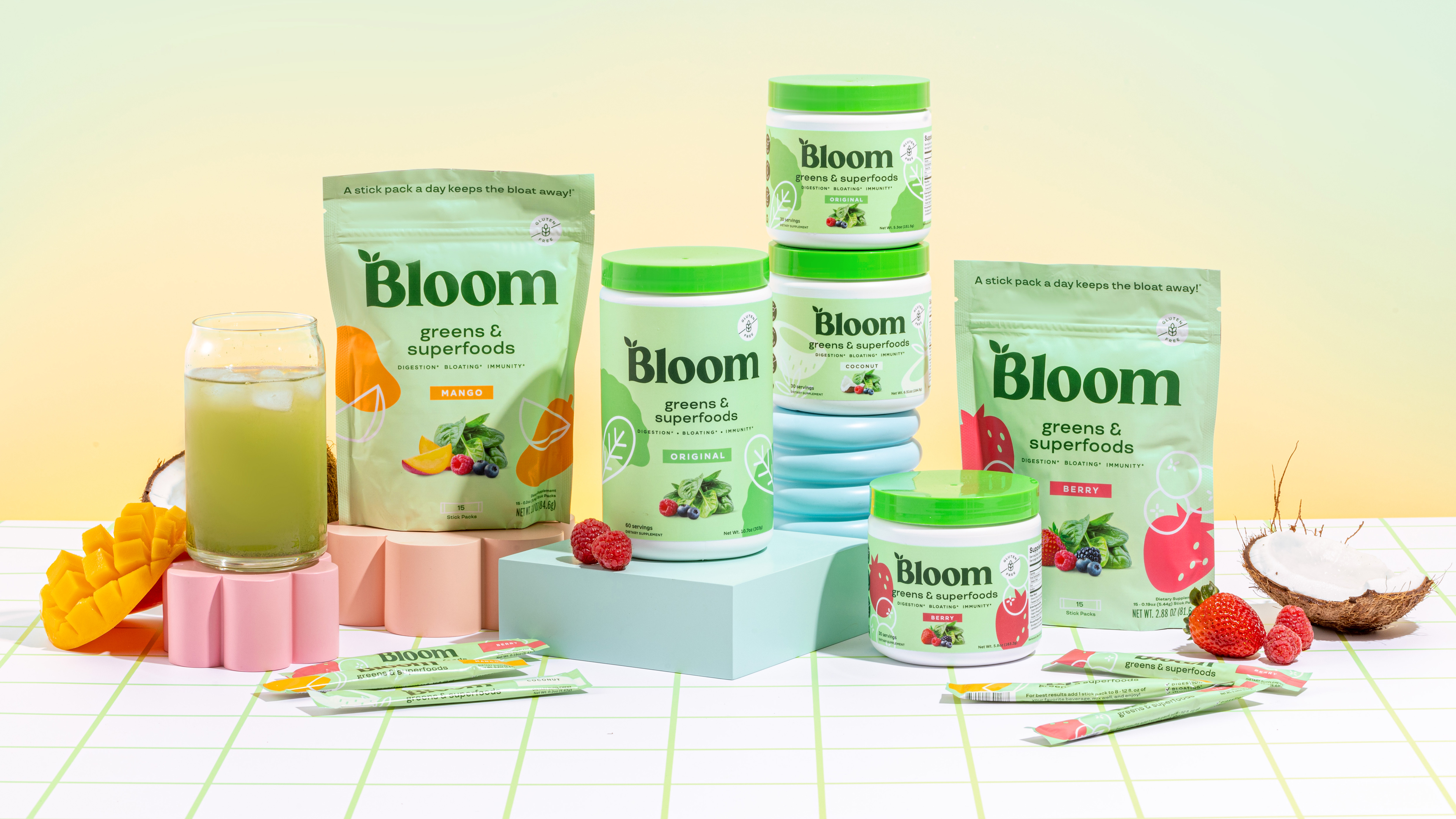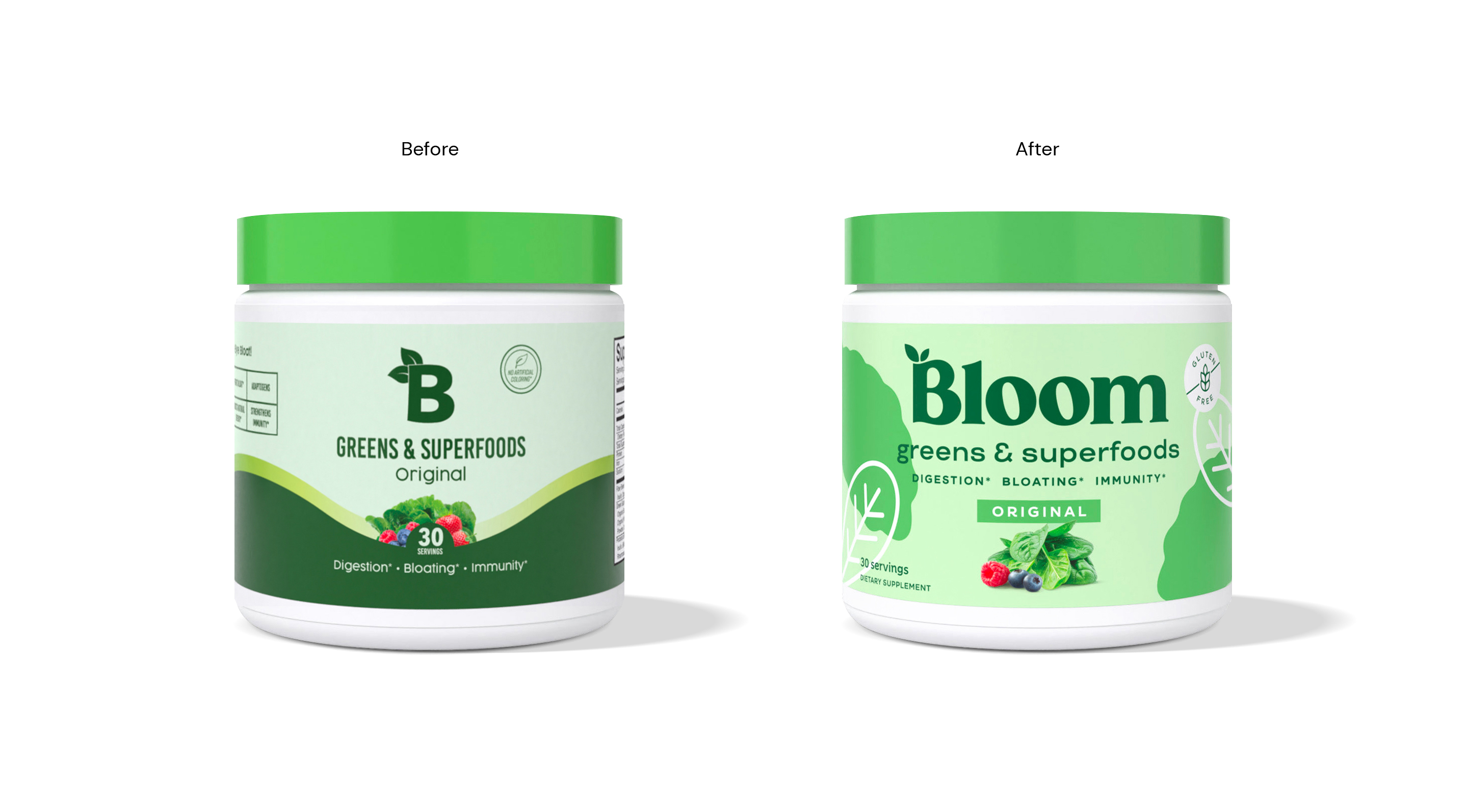 Bloom was created to help women who are intimidated by supplements (and fitness overall) meet their full potential. The branding utilizes stylized ingredient illustrations to add modernity and charm, while a cleaned-up communication hierarchy brings focus to each SKU’s unique benefit. The logomark is a custom form of the typeface Gazpacho, transitioning the existing B into a more elevated, memorable, and curvaceous “Bloom” that health-conscious females can relate to. TT Travels and Timesquare serve as the brand’s primary fonts, used for all brand messaging.