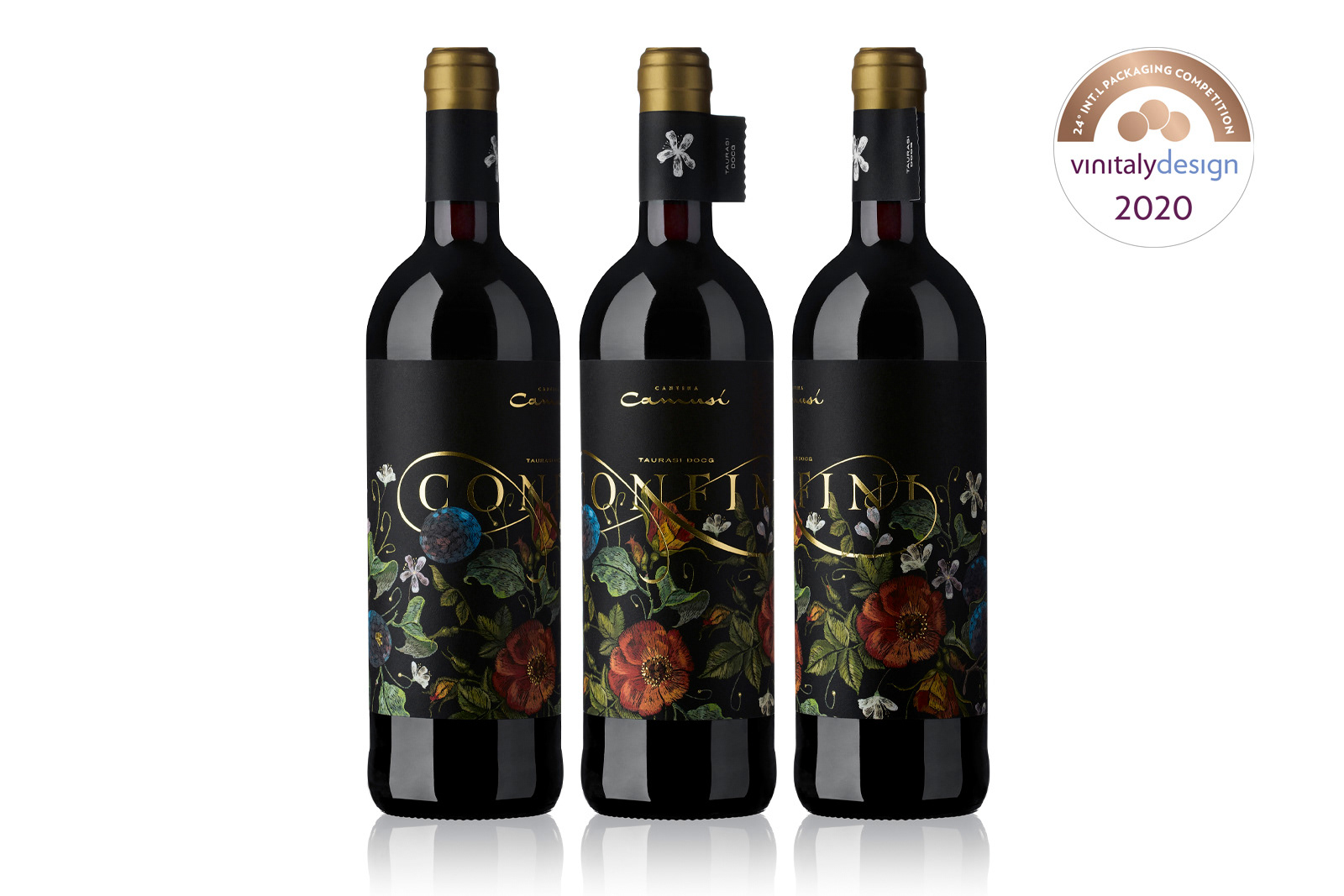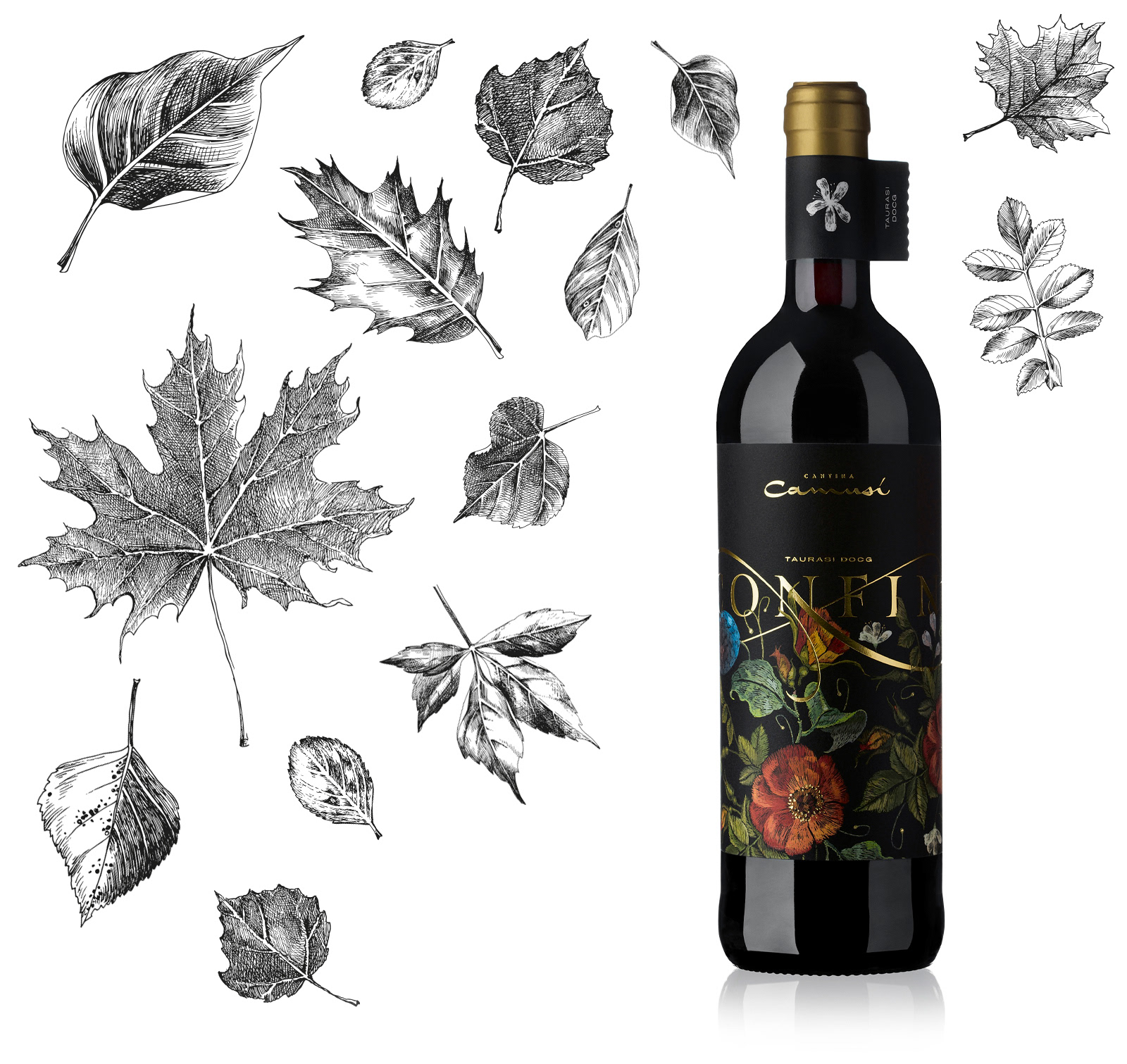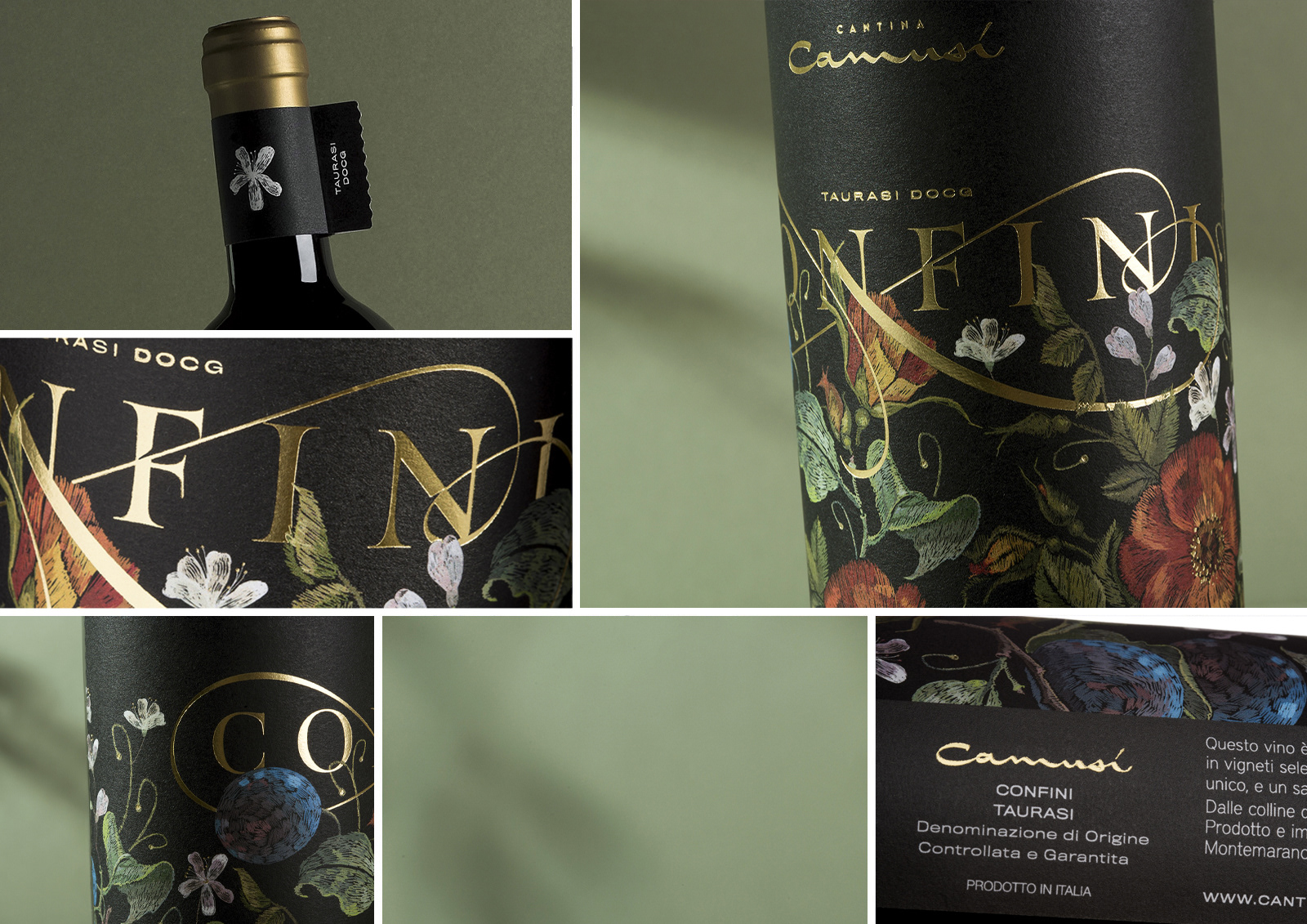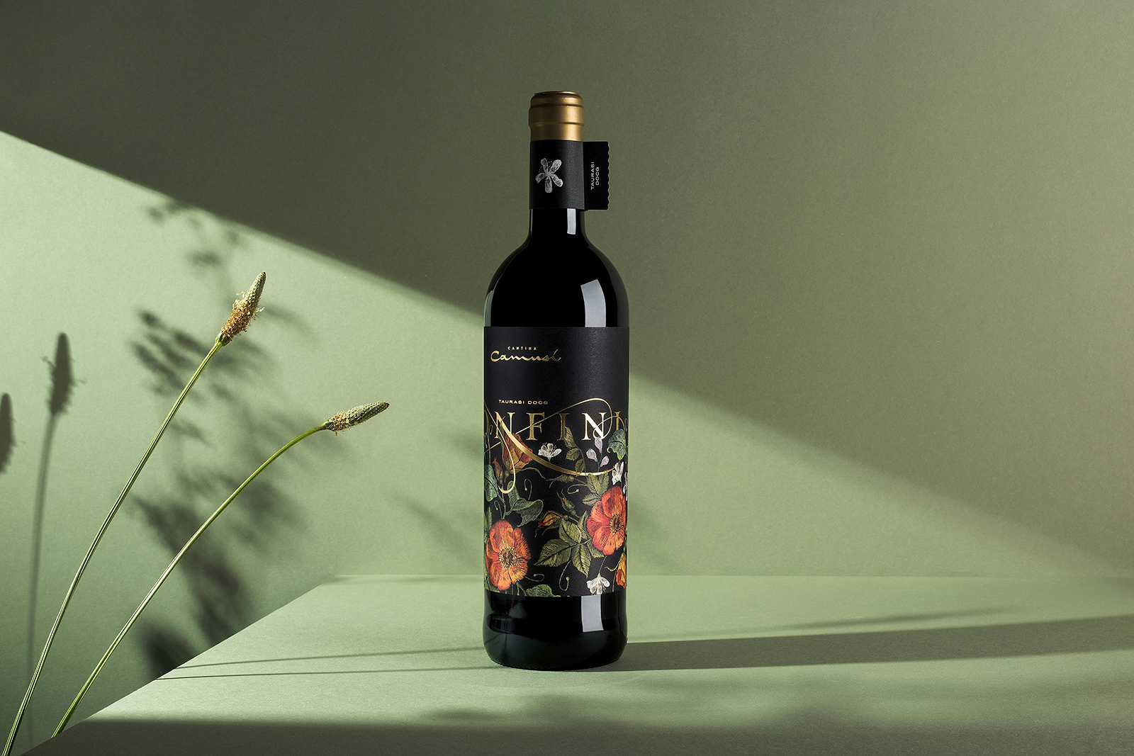 For the graphics of the label, we chose to use a floral motif embroidered with patience and devotion as our grandmothers did, with warm colors and deliberately soft contrasts to get closer to the character of the wine, which rested for three before being consumed long years in precious barrels. The label was printed on Materica Gesso ultra WS paper and ennobled with hot gold details.