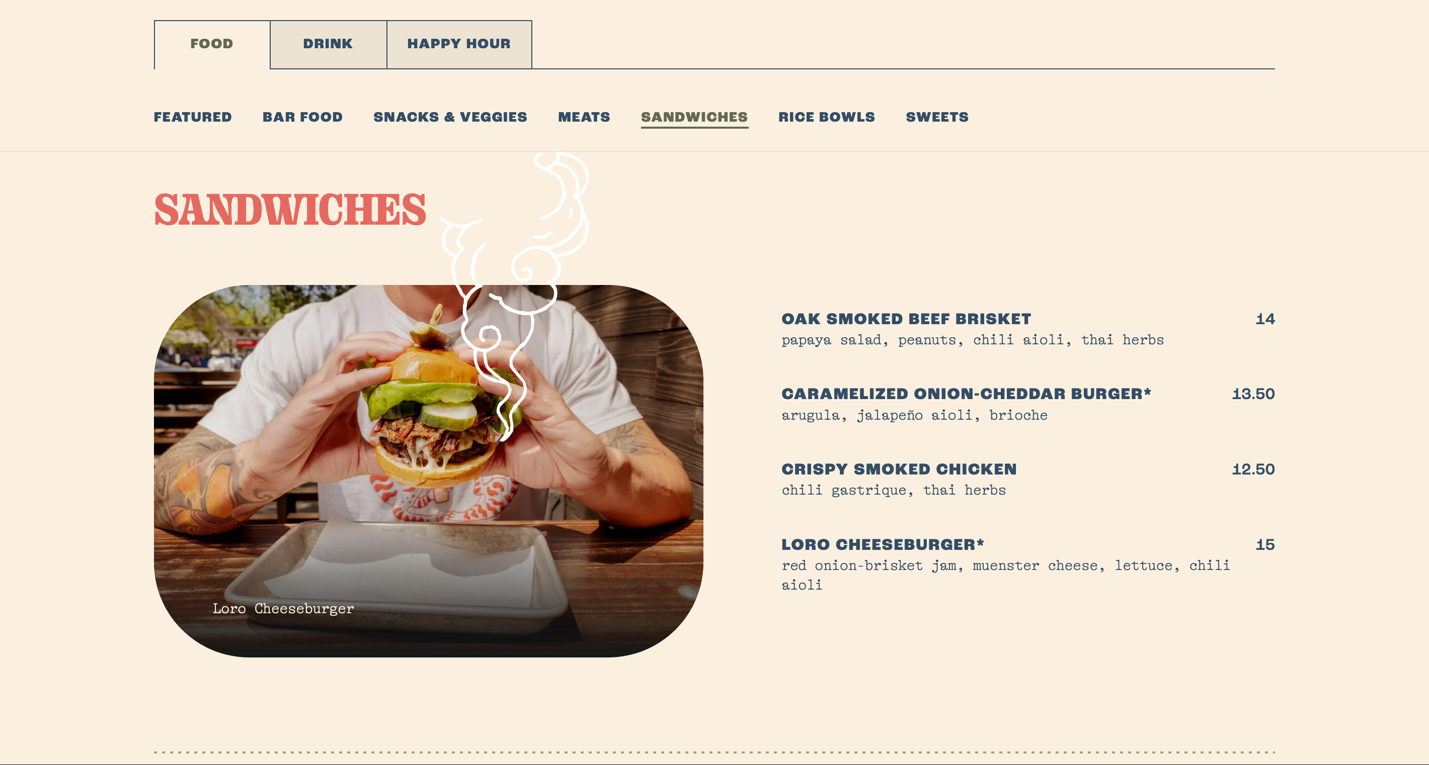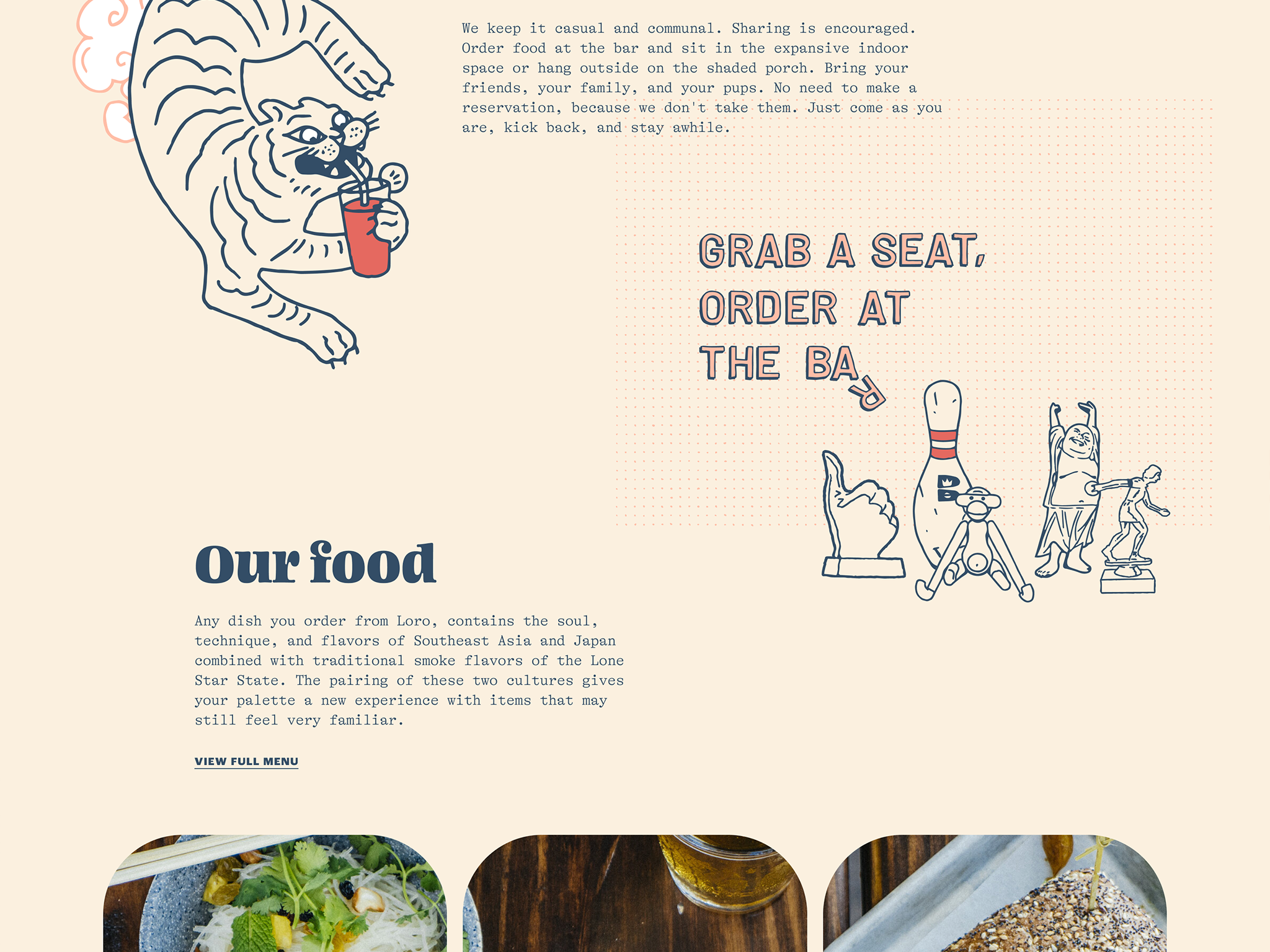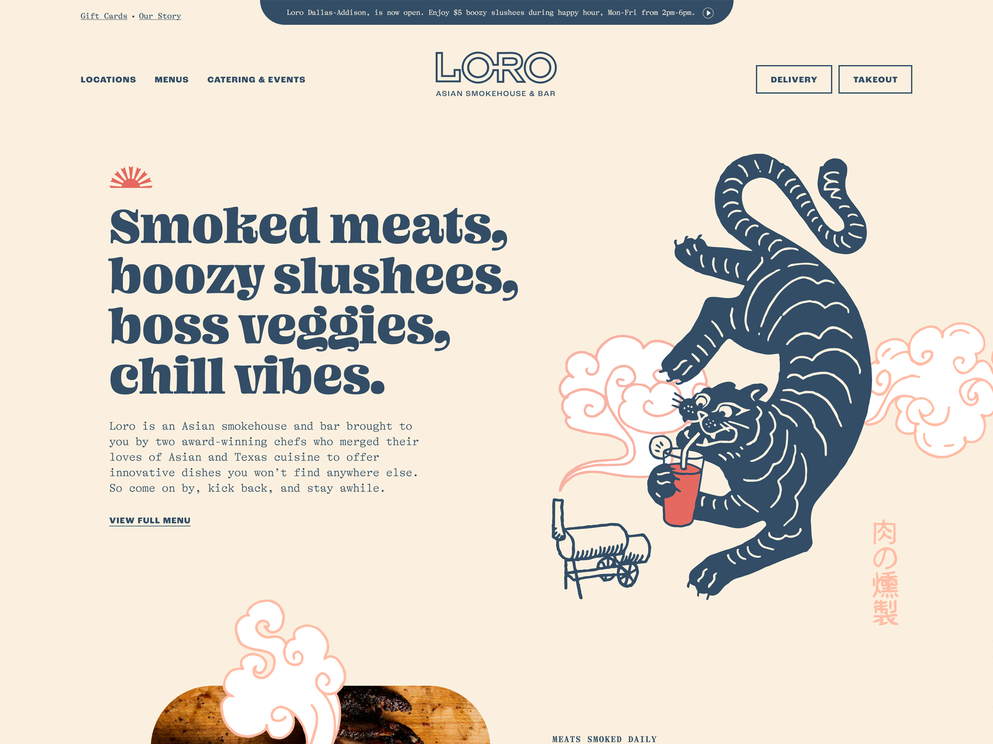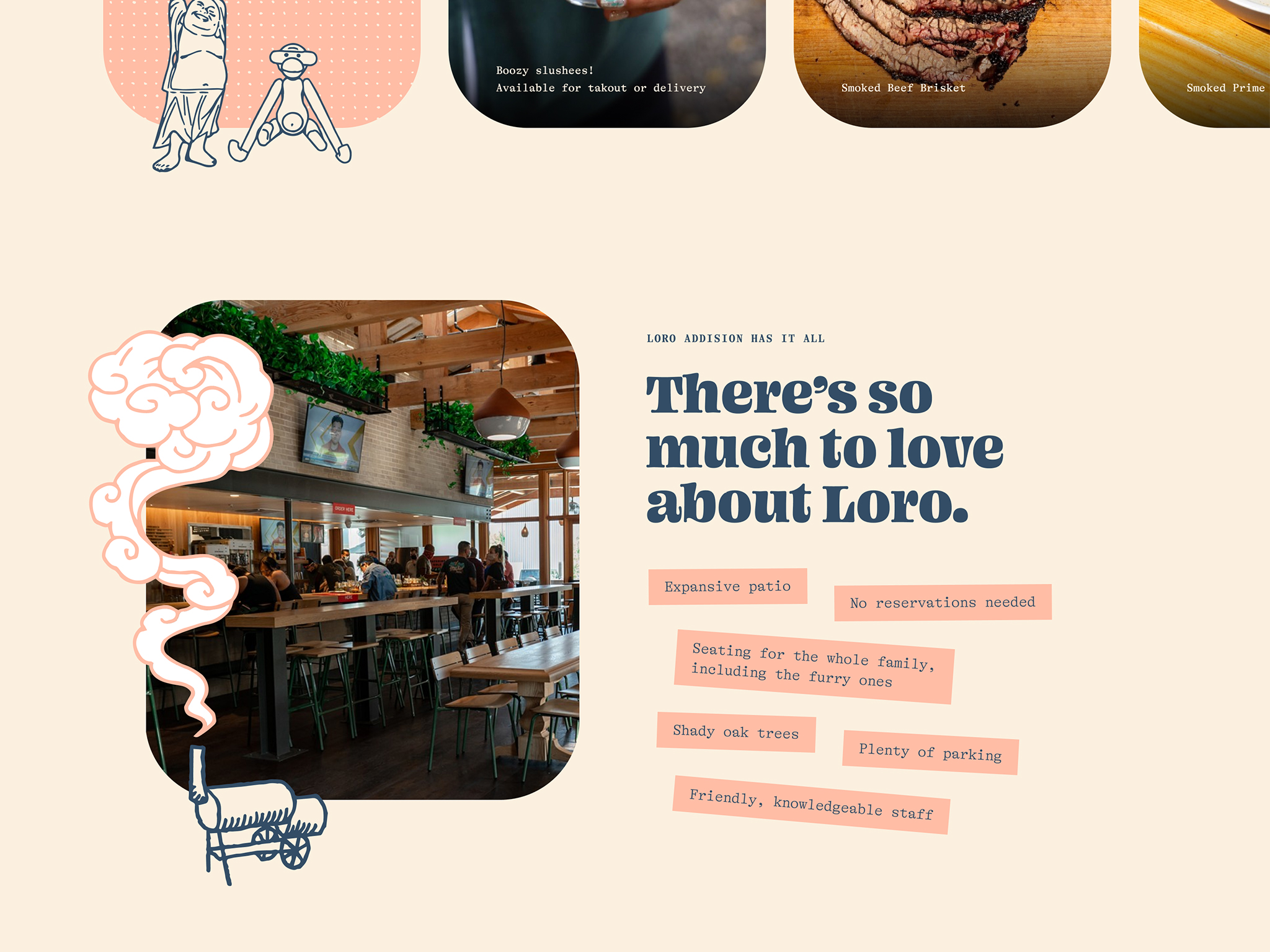 Loro is an Asian smokehouse concept by Hai Hospitality. They needed a brand facelift to better align with a newly minted brand positioning and personality. Our goal was to create a unique, quirky, and visually appetizing brand and website that would really stand on its own in the sea of Austin restaurant dining aesthetics.