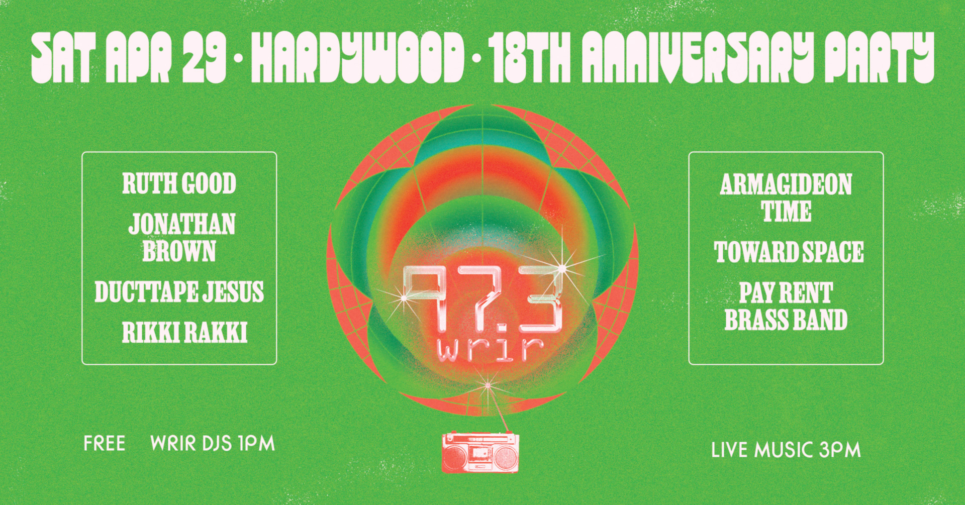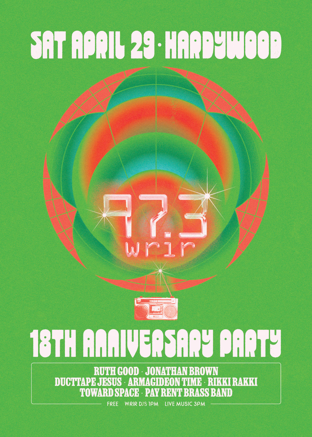 Posters for the 18th Anniversary Party of WRIR, an independent radio station from Richmond, Virgina, which will take place at Hardywood brewery. Local graphic designer Brent McCormick utilized Gayot New for the headline copy, with band names set in Job Clarendon, and additional show details set in ITC Ronda. “97.3 wrir” is OCR-A with a chrome effect.