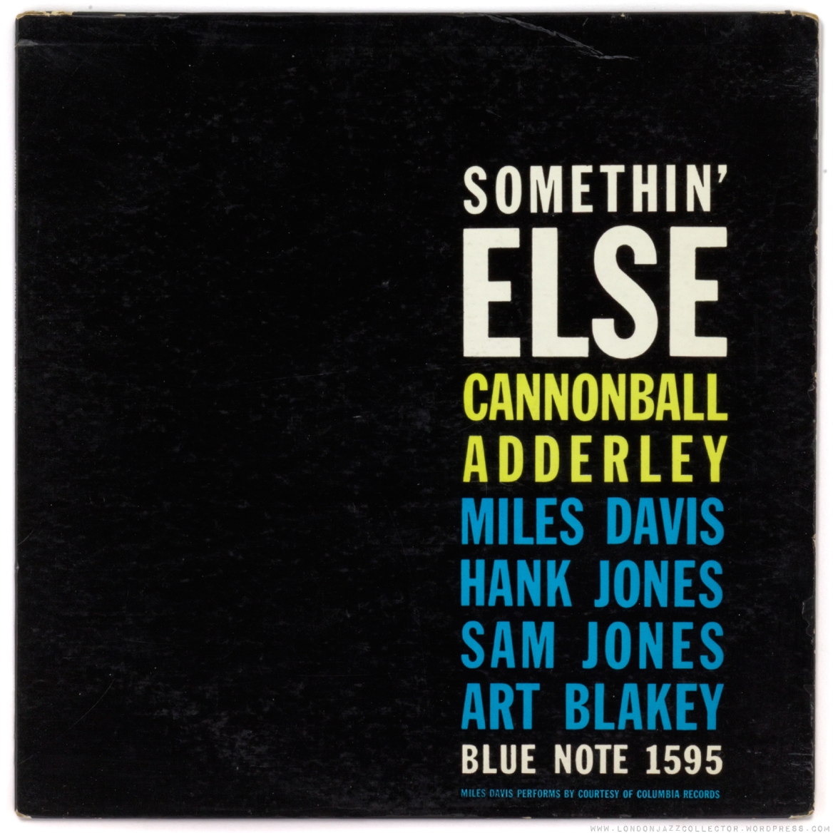Ahead of The Beatles’ White Album by a full decade, Somethin’ Else by Cannonball Adderley features only a plain black background, allowing the typography to take center stage. All text is set in all-caps Franklin Gothic extra-condensed, with the album title and catalog number in white, artist name in yellow, and side musicians in blue.