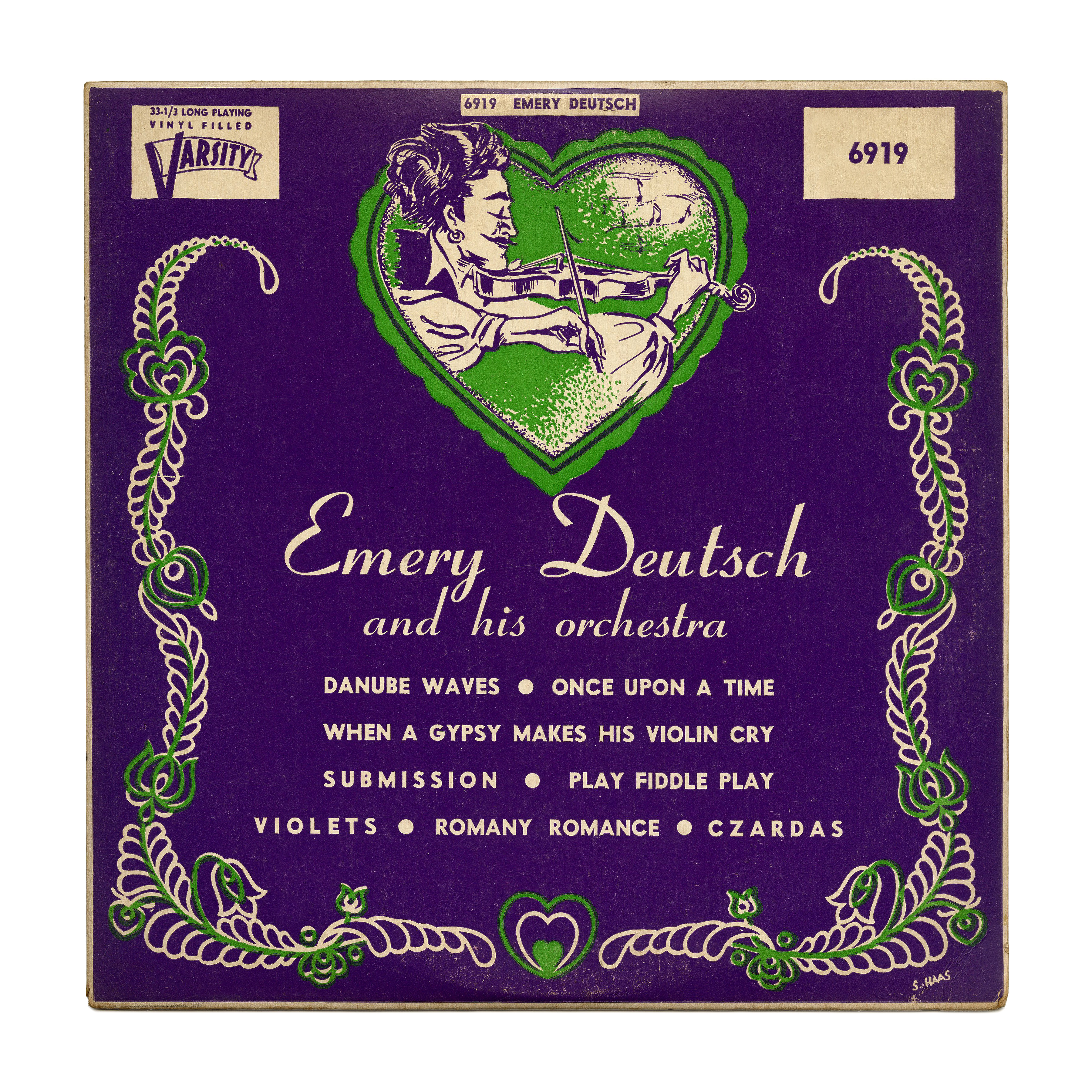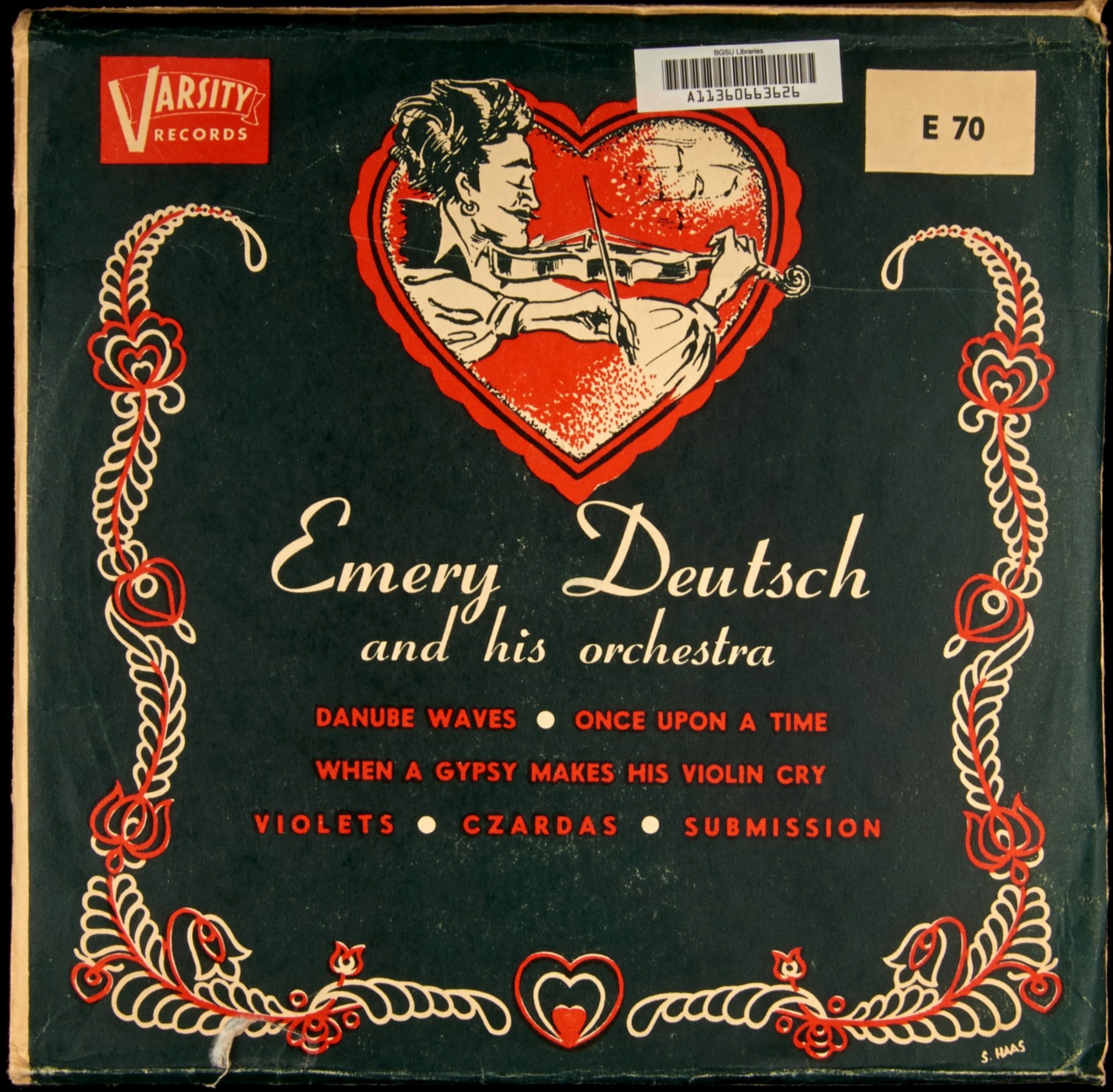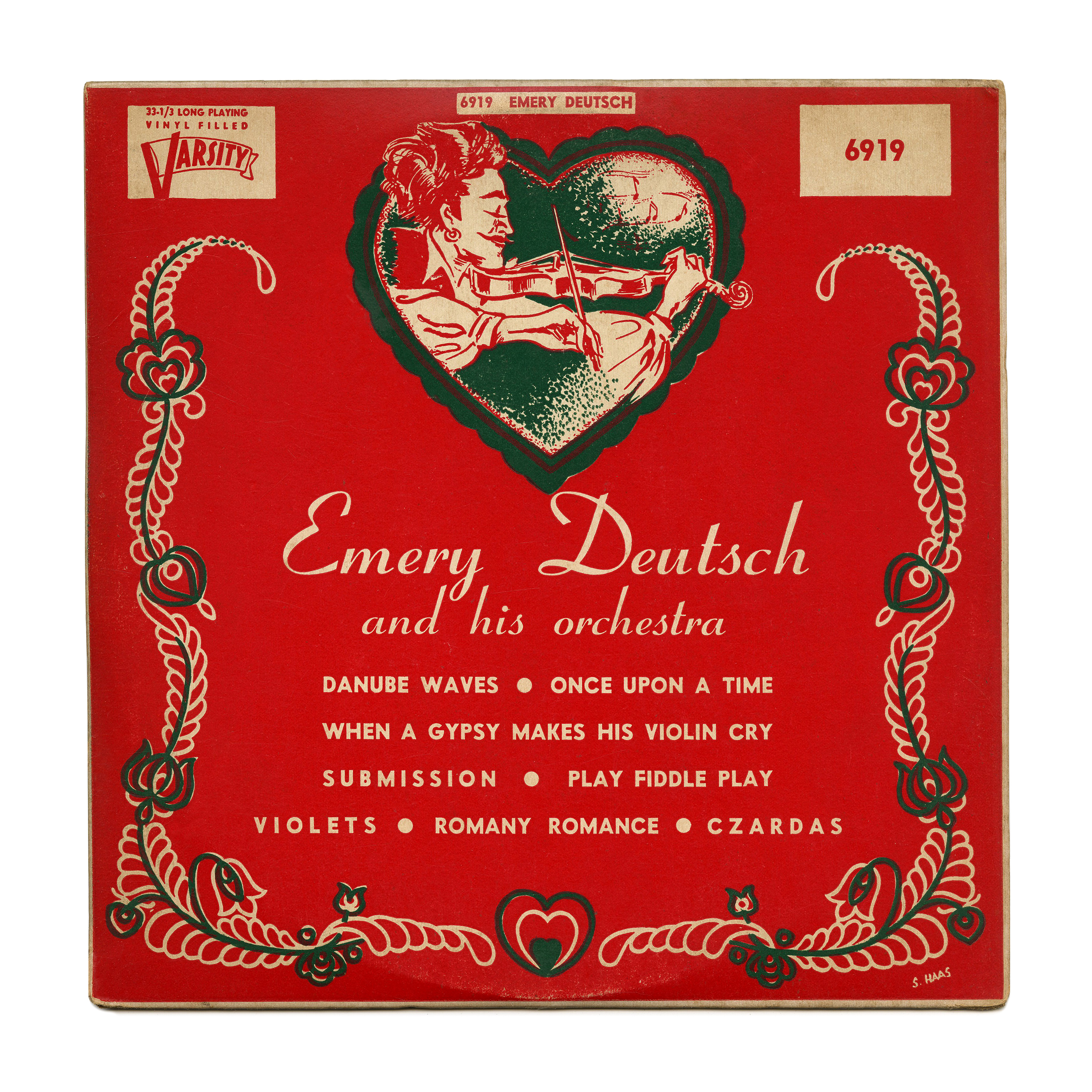 Coronet Bold and Vogue Extra Bold are the typefaces used by Stephen Haas for the cover of an undated record (late 1940s?) by Emery Deutsch and his orchestra, released by Varsity Records. There were several versions of this record, with the same basic sleeve design, but different colors.