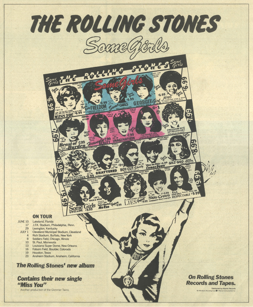 “The Rolling Stones” is set in Flash Bold, and “Some Girls” is Brush Script. A wide variety of other typefaces are used in the advertising copy. “AFRO” might be Filmotype Homer with alternates. The bold scripty caps used for “WIZ-WIG” are from an unidentified source – Bold Mercantile Italic is in the same ballpark [edit: they appear to be derived from Kalligraphia, see comments].