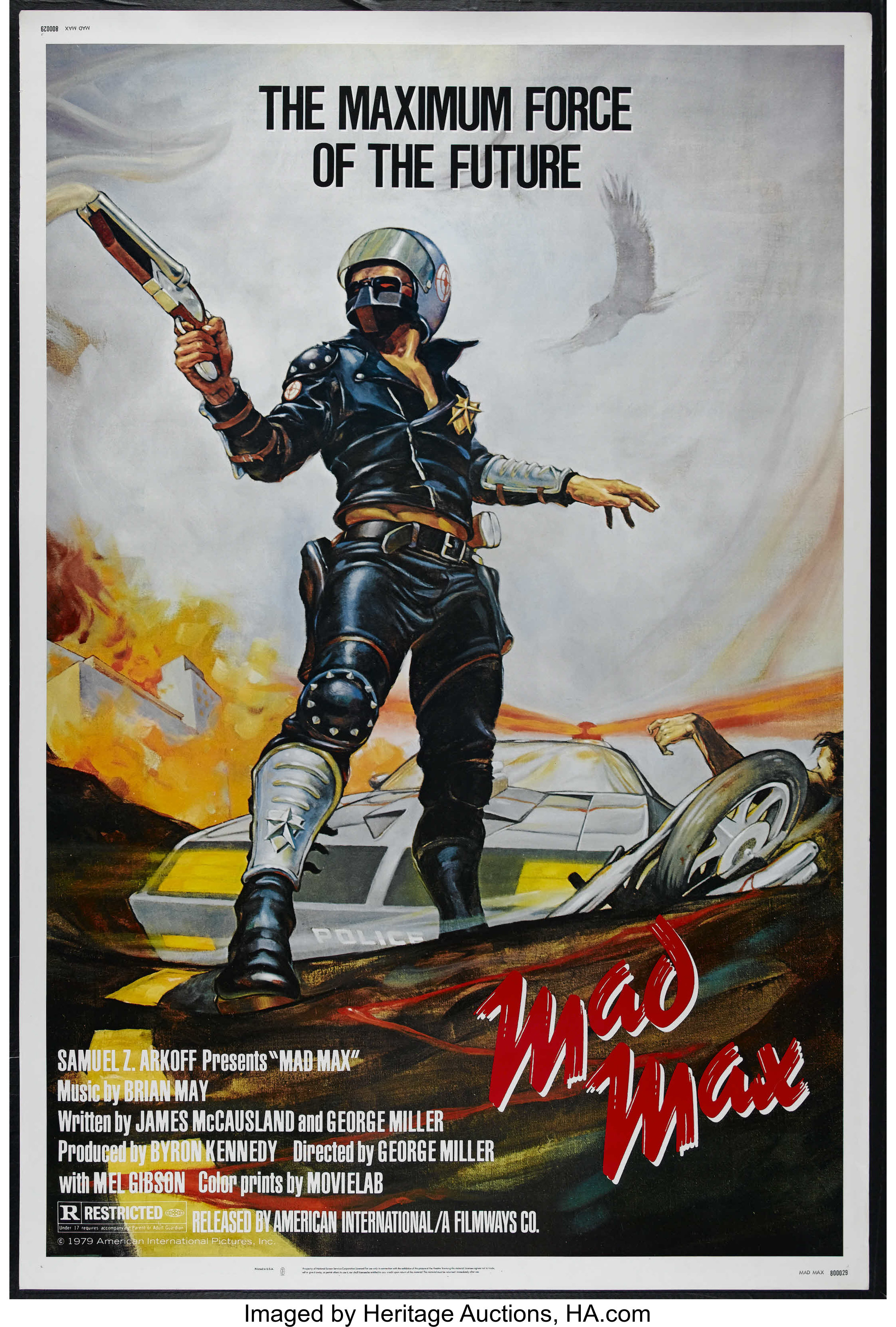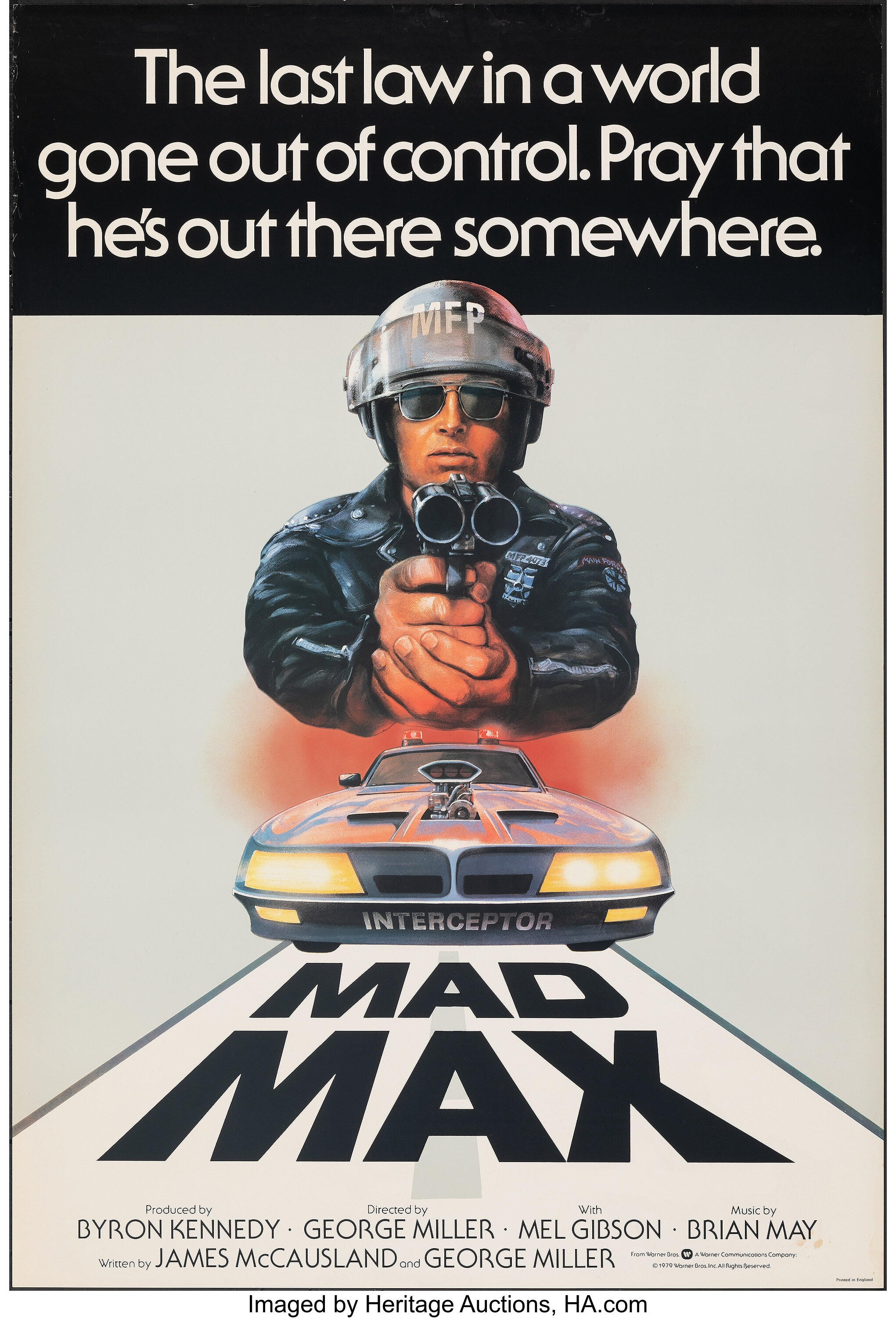 Movie posters for the 1979 Australian science fiction film Mad Max, directed by George Miller. Starring Mel Gibson as Max Rockatansky, a rogue cop, out for the blood of those who murdered his wife and child. It is the first film in the Mad Max series.