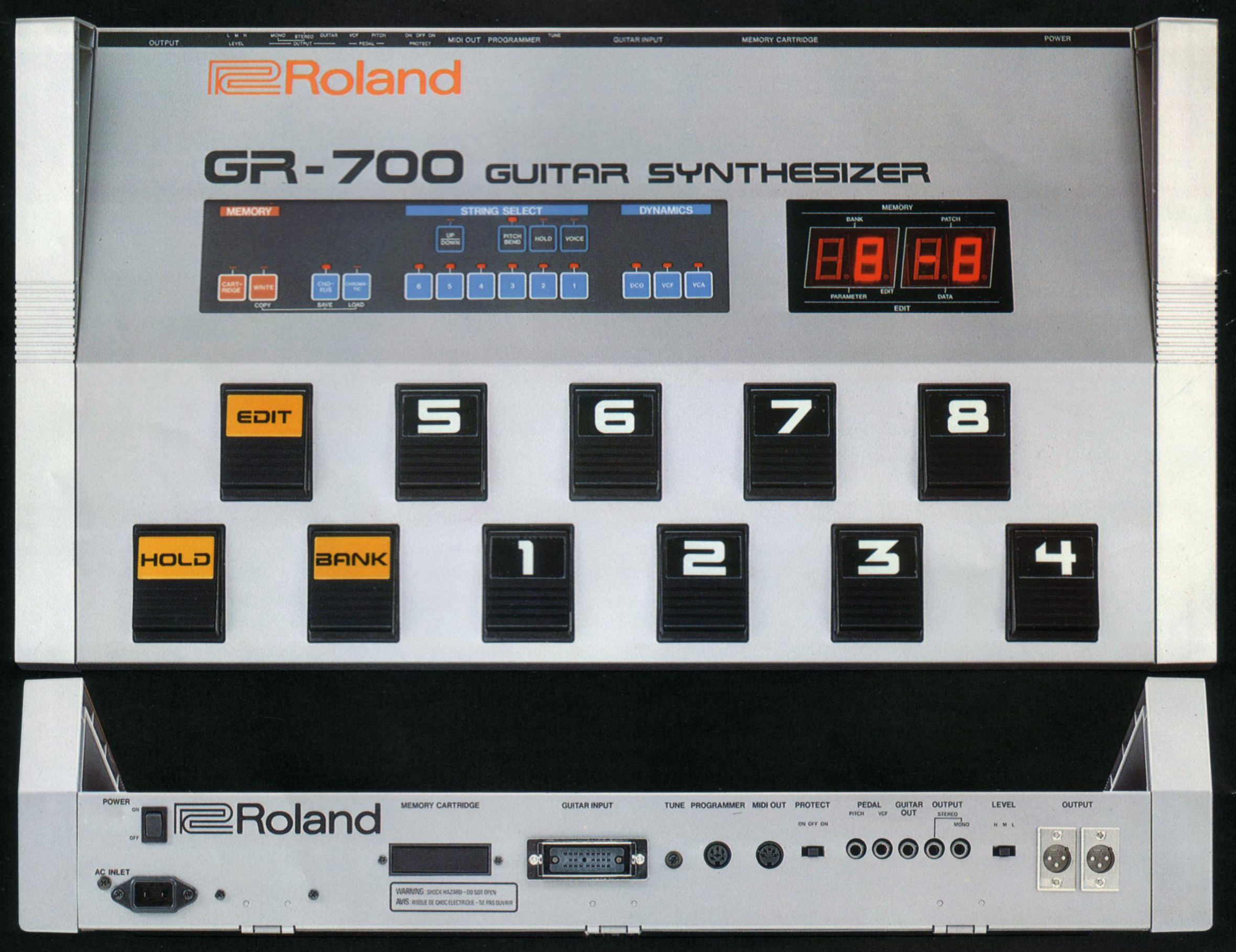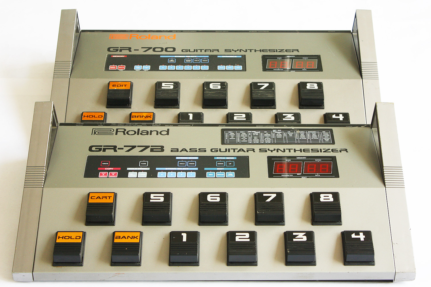 The GR-700 Guitar Synthesizer, G-707 Guitar Controller, released in late 1984, and the GR-77B Bass Guitar Synthesizer, released around a year later, from the Roland Corporation.