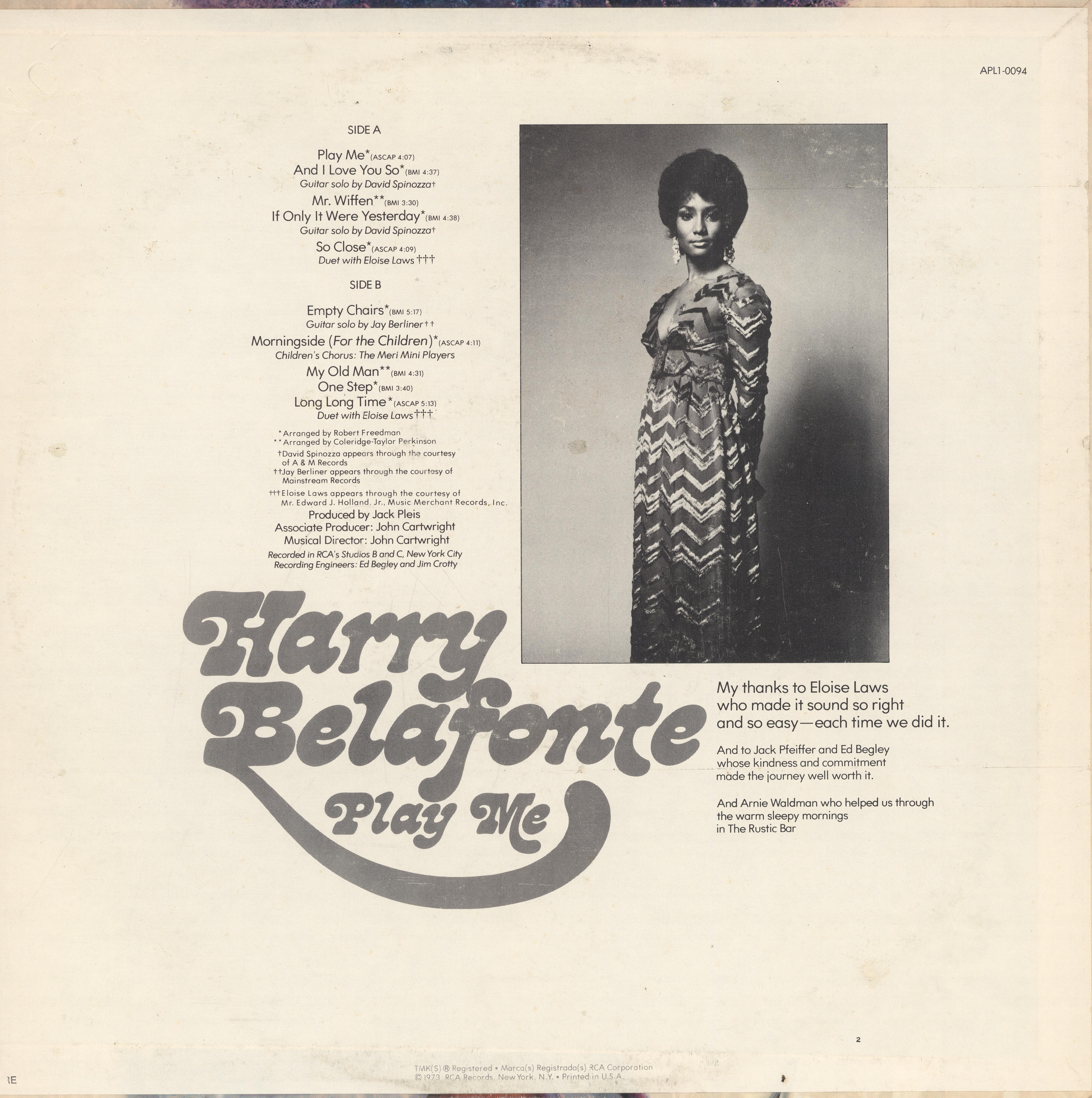 Cooper Nouveau Swash 10 is the typeface chosen for Play Me from 1973, Harry Belafonte’s final studio album for RCA Records. Dave West’s chubby script is used with a custom added swash. The cover illustration is by Mae Cann. No designer is credited.