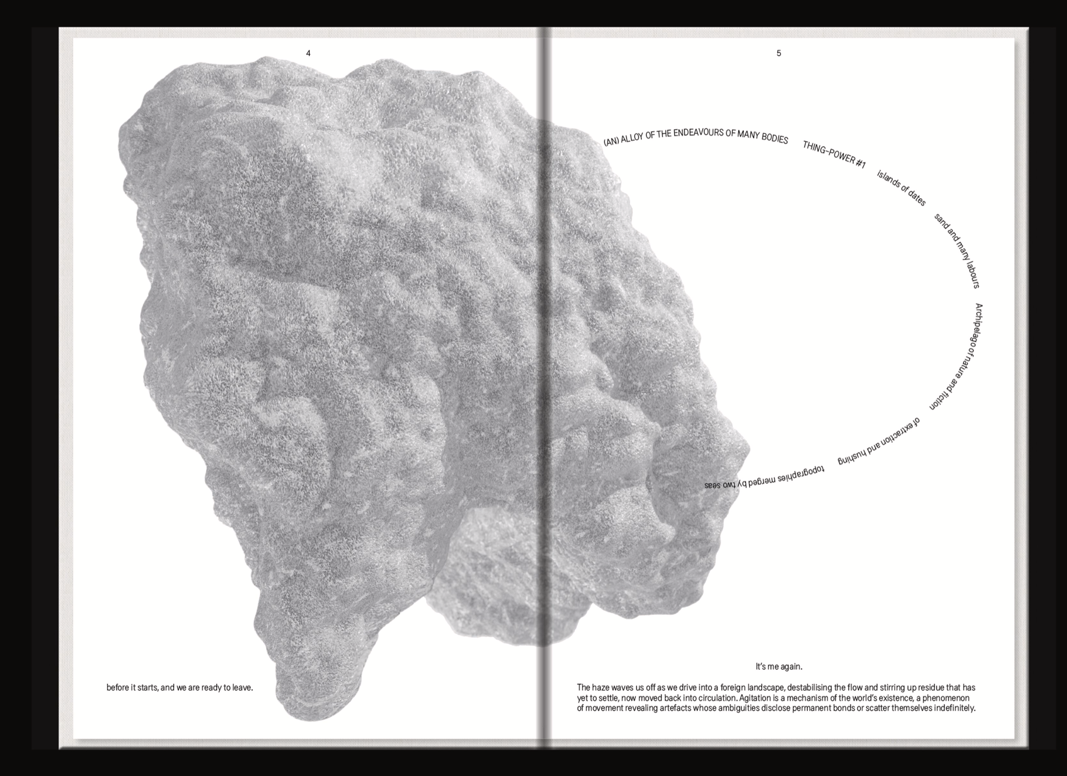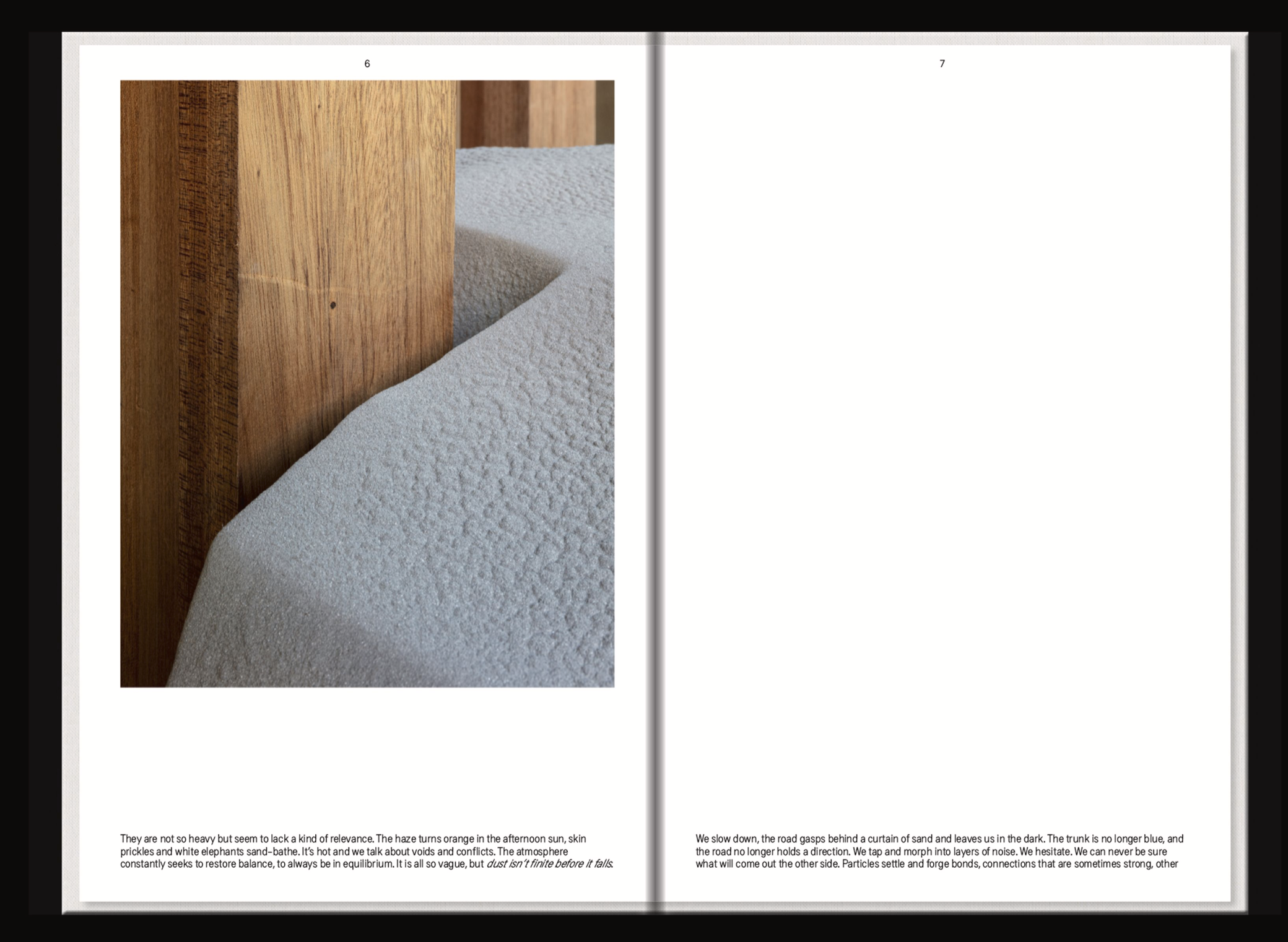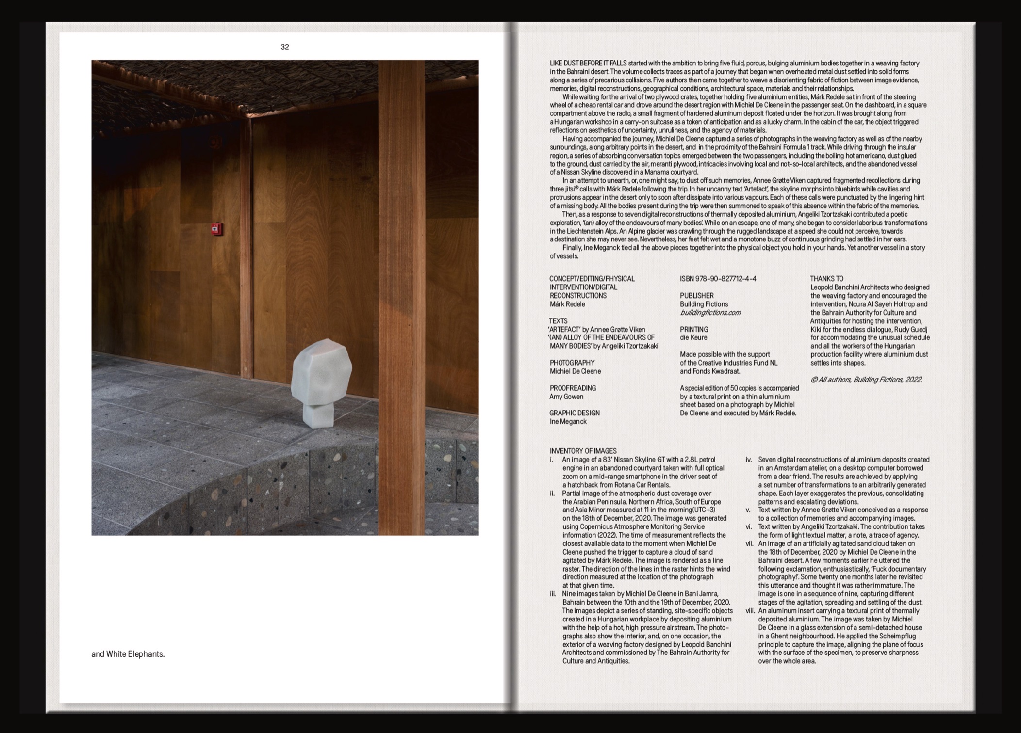 Like Dust Before It Falls started with the ambition to bring five fluid, porous, bulging aluminium bodies together in a weaving factory in the Bahraini desert. The volume collects traces as part of a journey that began when overheated metal dust settled into solid forms along a series of precarious collisions. Five authors then came together to weave a disorienting fabric of fiction between image evidence of aluminium bodies, memories, digital reconstructions, geographical conditions, architectural space, materials and their relationships.