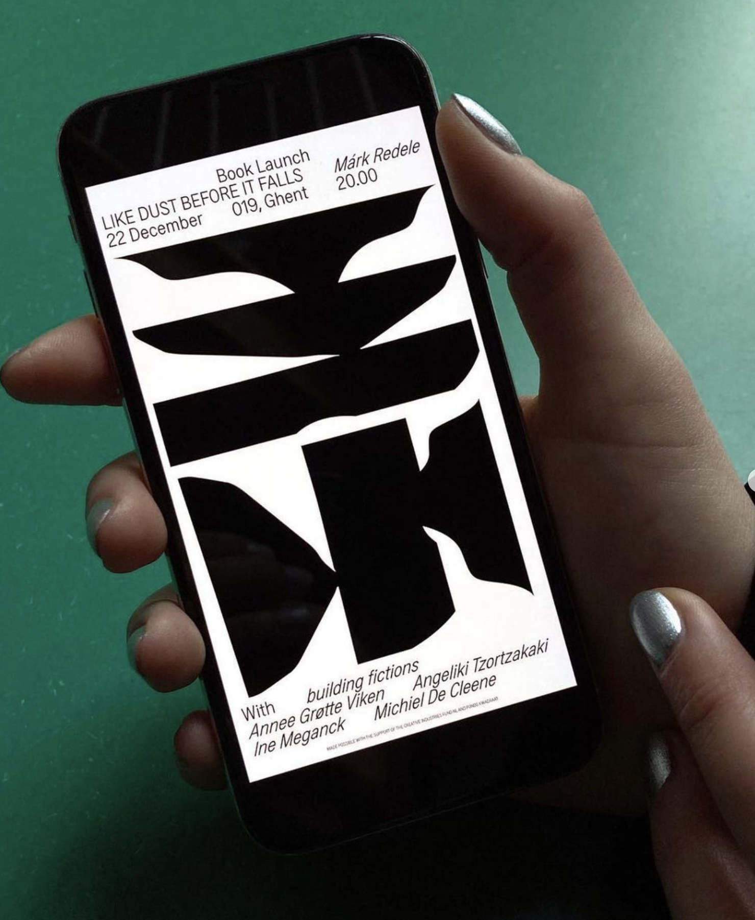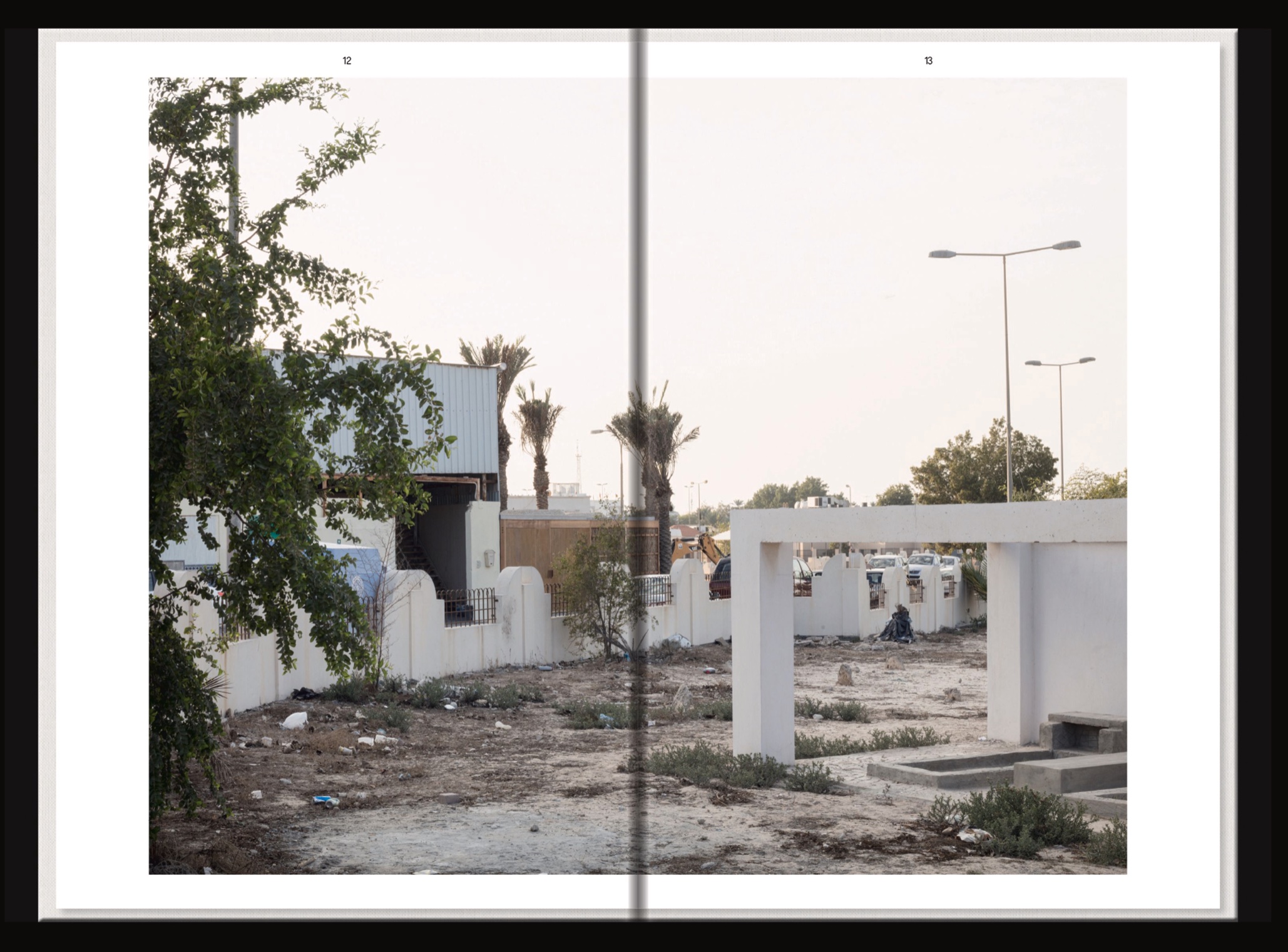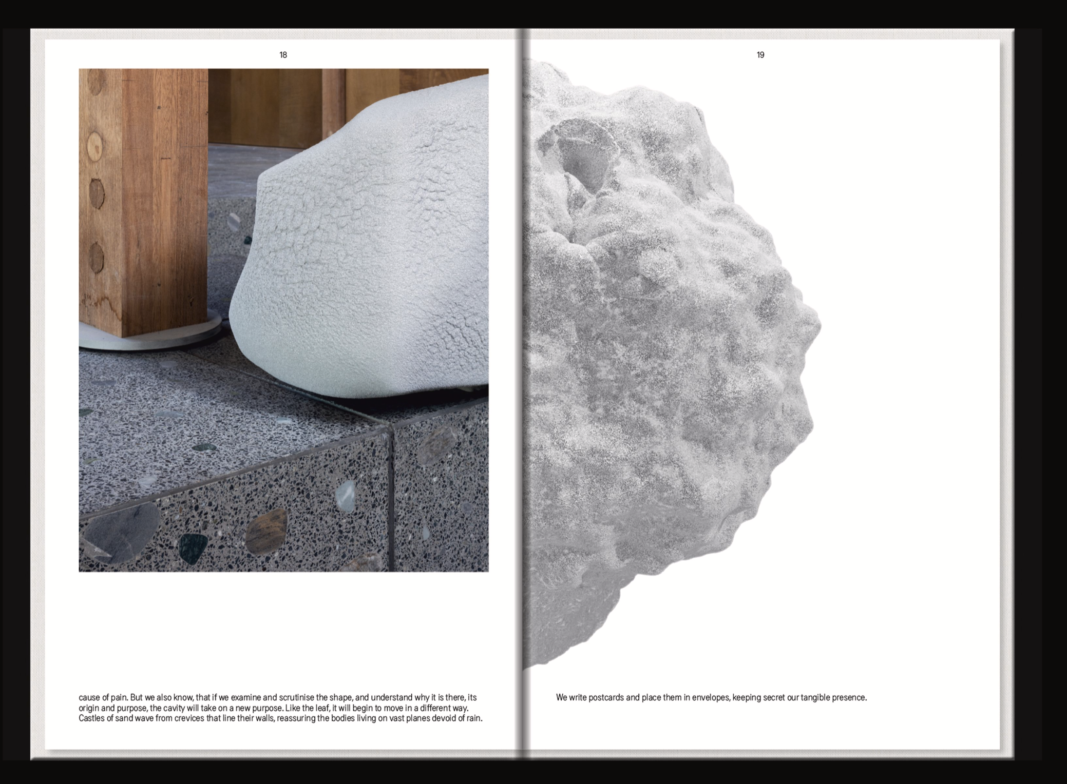 Like Dust Before It Falls started with the ambition to bring five fluid, porous, bulging aluminium bodies together in a weaving factory in the Bahraini desert. The volume collects traces as part of a journey that began when overheated metal dust settled into solid forms along a series of precarious collisions. Five authors then came together to weave a disorienting fabric of fiction between image evidence of aluminium bodies, memories, digital reconstructions, geographical conditions, architectural space, materials and their relationships.