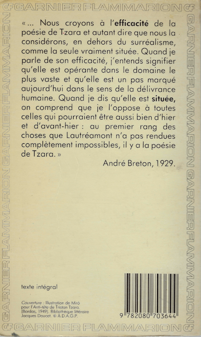 The illustration is by Joan Miró and was originally made for the cover of another book by Tzara called l’Anti-tête (published by Bordas in 1949).