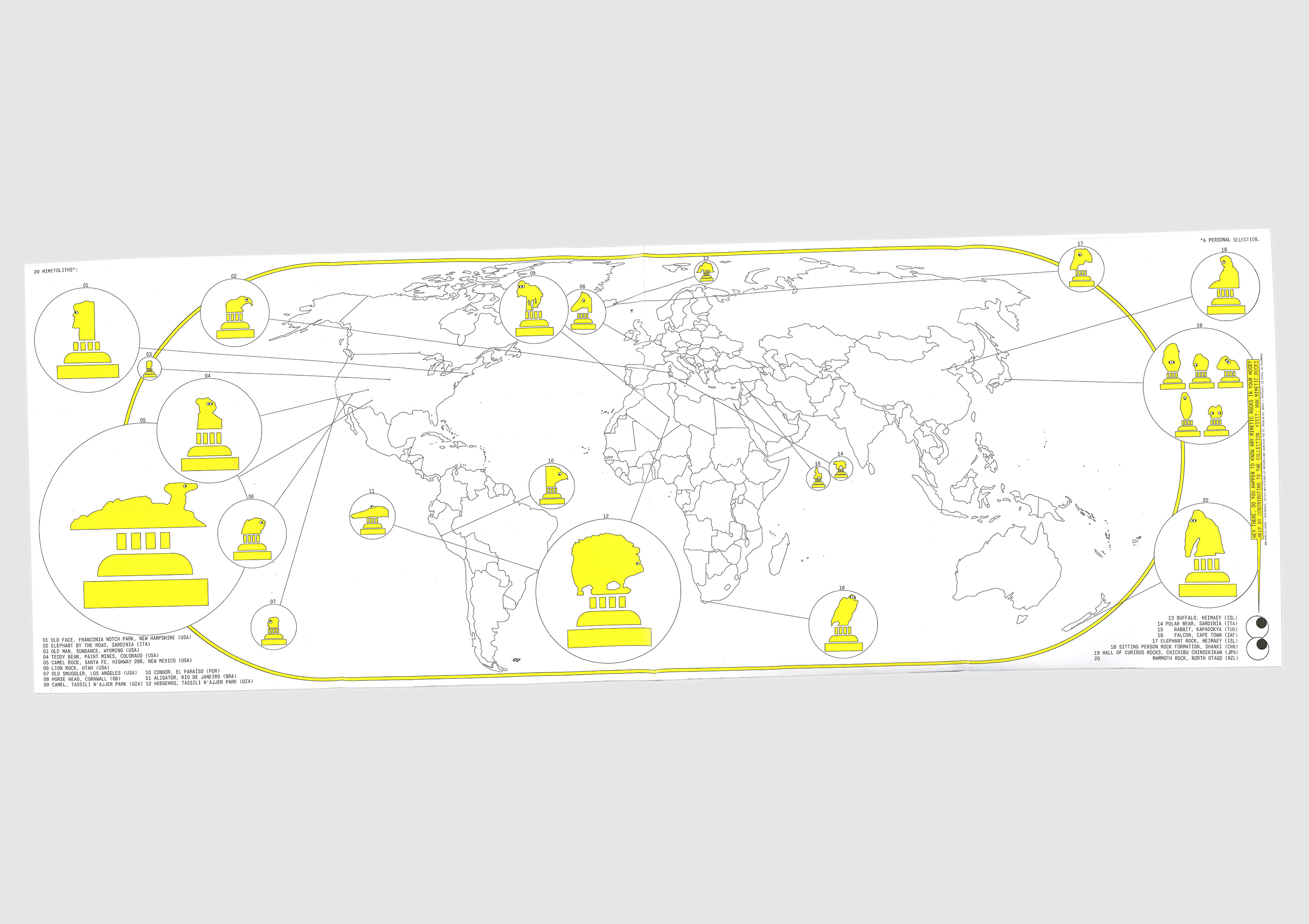 The Mimetic Rocks Map portrays a selection of rock formations that resemble animals, mystic creatures or human faces. It’s an invitation to go on a rock spotting tour – the mimetic rock as a tourist destination, something one sends as a postcard, like an image of Tour Eiffel or the Colosseum. The typefaces used are G2 Erika Mono and the yet to be released G2 Airdancer (working title: Columnbus).