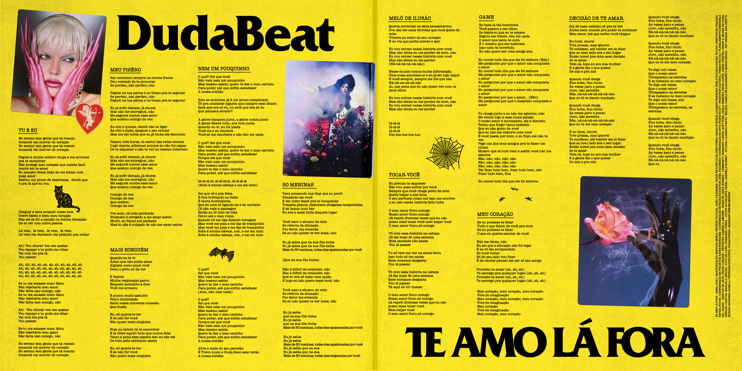 Duda Beat’s second studio album Te Amo Lá Fora was released in 2021, mixing pop music with Brazilian beats. The project had the creative direction of Marcelo Jarosz, who is known for exploring different textures and surreal elements in his work.