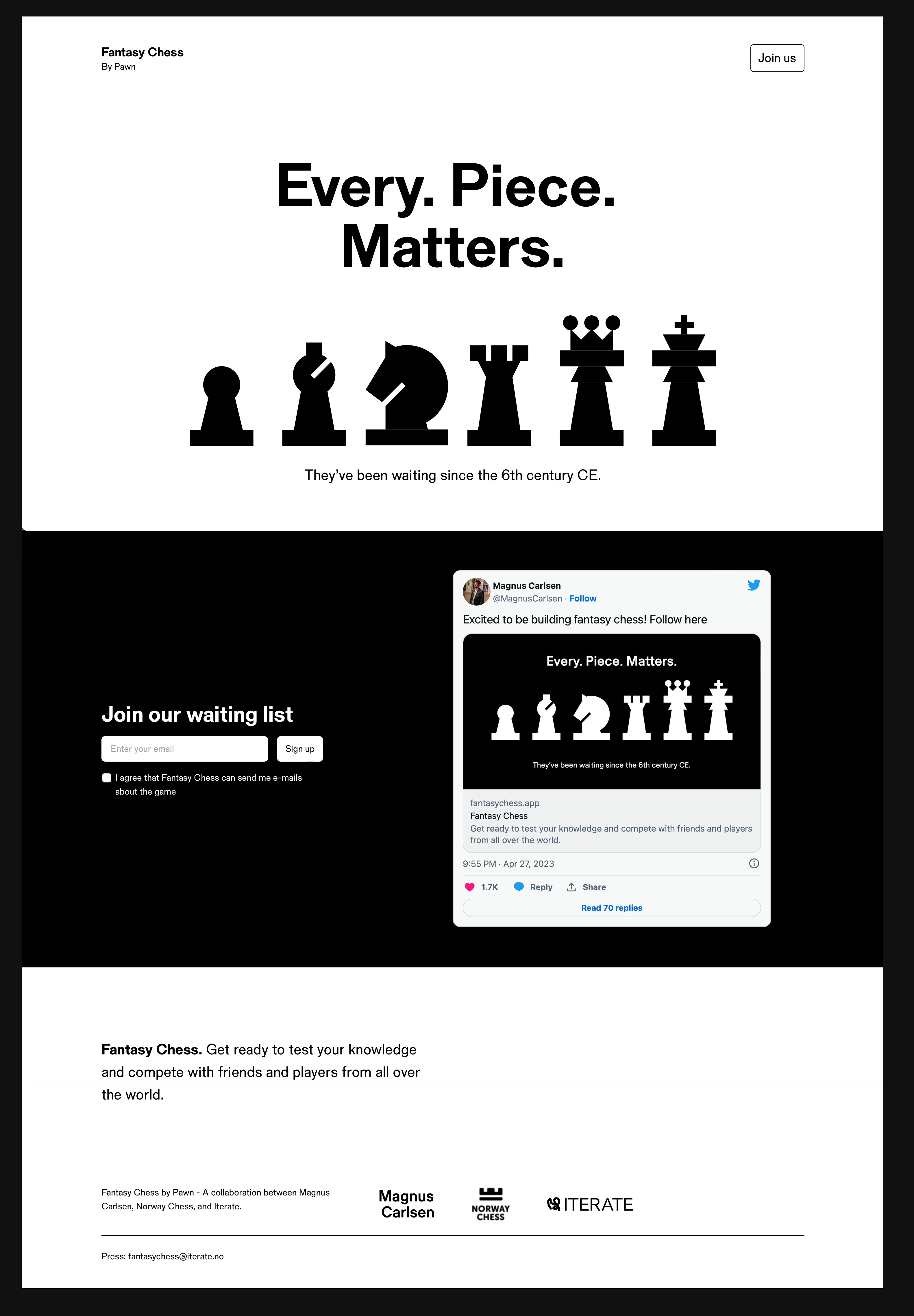 Norwegian chess grandmaster Magnus Carlsen, Iterate, and Norway Chess have announced their new joint venture named Pawn. Pawn is a fantasy-type game, known from other sports like football. The sign up website is set in the Regular and Bold weight of Store Norske Nord.