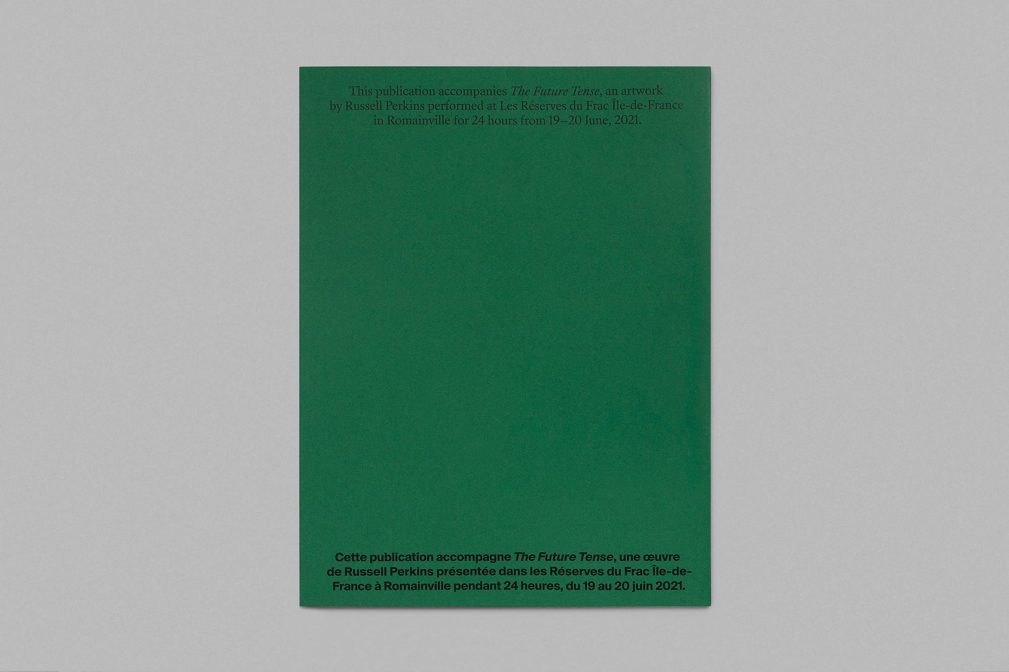 The Future Tense is a sound installation by the American artist Russell Perkins which took place at Les Réserves du Frac Île-de-France in Romainville for 24 hours from 19 to 20 June 2021. The artist worked with the first movement of Johannes Ockeghem’s requiem (1420–1459), the oldest surviving polyphonic funeral mass. With the help of artificial intelligence and GPS movement data recorded during the first year of the Covid-19 pandemic, the piece, and with it the labour of grieving, got extended indefinitely, without ever reaching a harmonic resolution. Perkins’ highly conceptual artwork is made accessible through the publication which includes two essays by Anabelle Lacroix and Lucas Morin and was published in English and French by Fondation Fiminco. The design of the publication, in particular the experimental typesetting, reflects crucial themes within Perkins’ sound installation by referring to cathedrals, polyphony, fragmentation, repetition, choirs, and space for mourning.