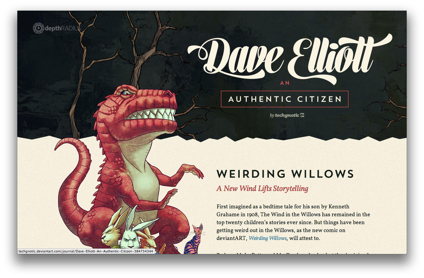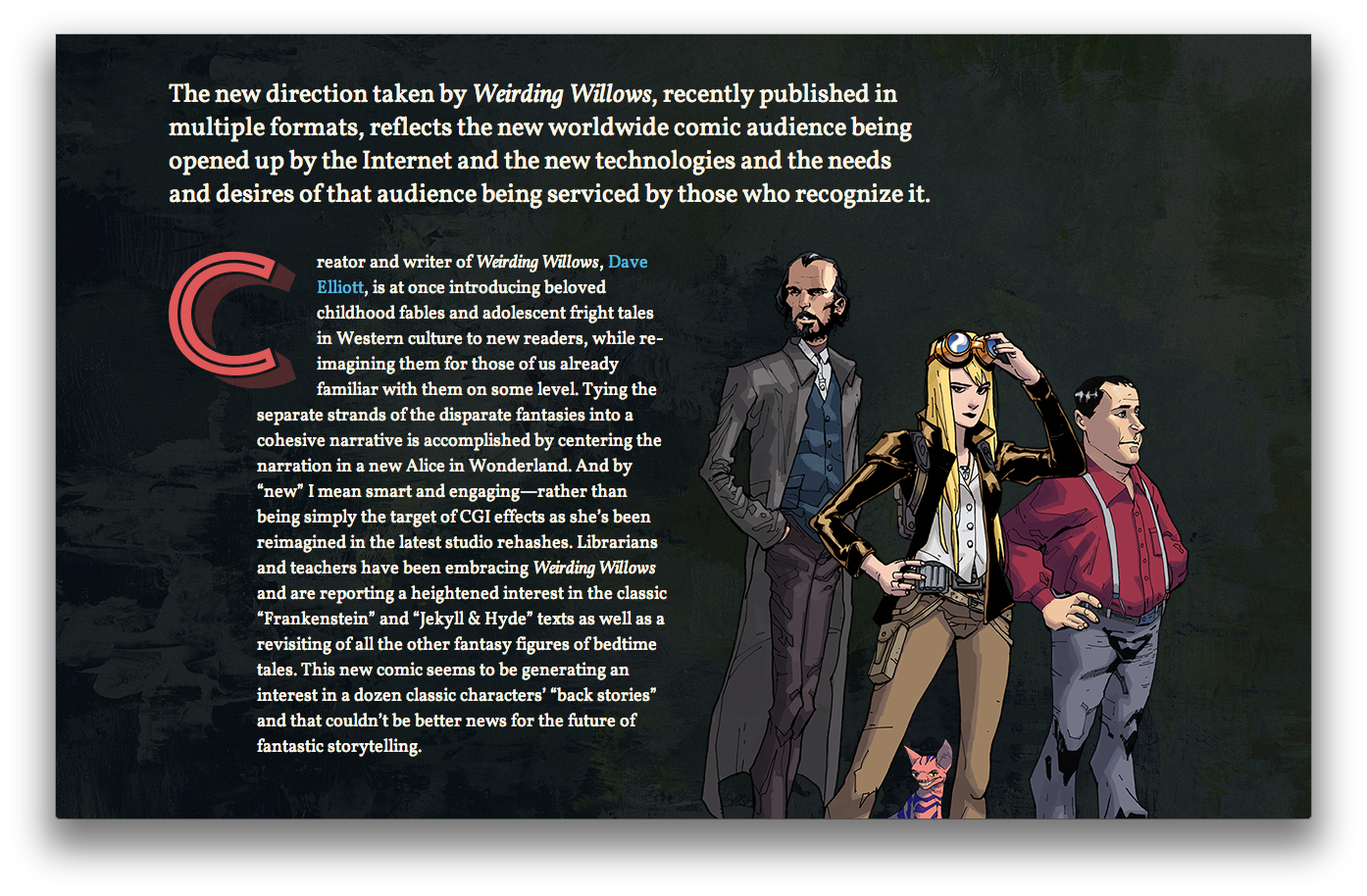 Weirding Willows, a new wind lifts storytelling. First imagined as a bedtime tale for his son by Kenneth Grahame in 1908, The Wind in the Willows has remained in the top twenty children’s stories ever since. But things have been getting weird out in the Willows, as the new comic on deviantART, Weirding Willows, will attest to. Badger, Mole, Ratty and Mr. Toad are back… but they’re joined by Alice, Frankenstein’s Monster, Mowgli, The White Rabbit, Peter Rabbit and Benjamin Bunny as they defend the world from the Wicked Witch of the West, Doctor Moreau, the Mad Hatter, Mister Hyde and the Queen of Hearts (not to mention the flying nightmare monkeys from Wizard of Oz.)