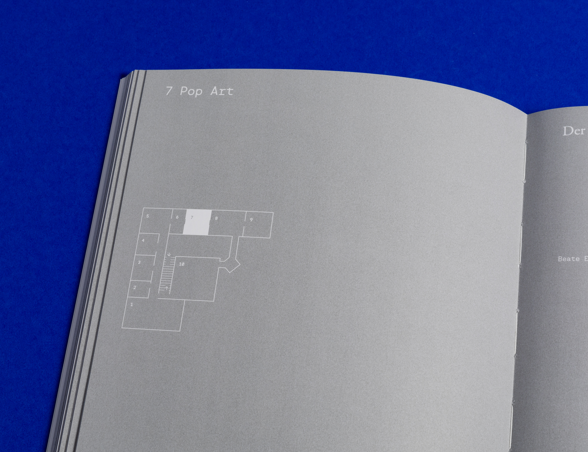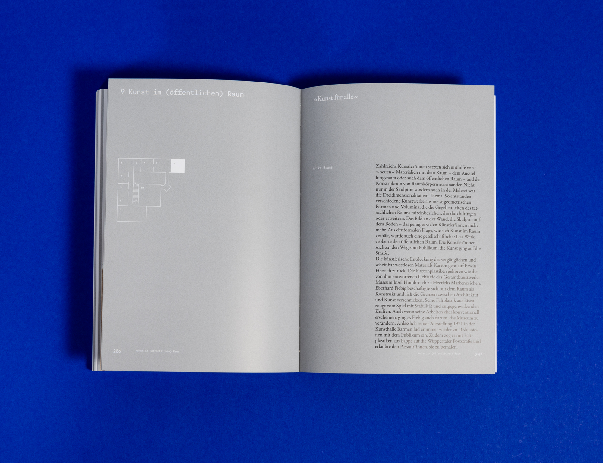 There is a focus on the exhibition’s room shots, which gives the reader a good idea of how the artworks are presented. These are introduced to the respective sub-themes by floor plans of the entire exhibition. The reduced work details are set in the design grid in the room photographs.
