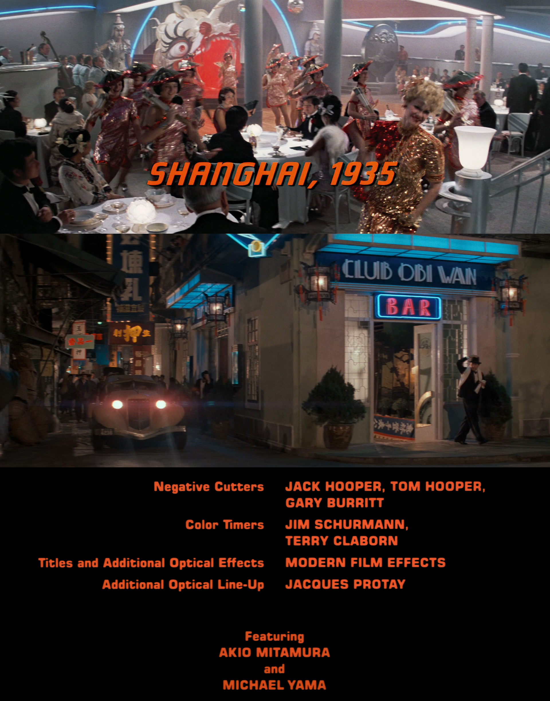 The film’s title sequence features credits set in a faux italic Bauer Topic (see Steile Futura). The Club Obi Wan signage is based on Zig Zag, an art deco alphabet design by Marcia Loeb that is shown in New Art Deco Alphabets (Dover, New York, 1975). The end credits are set in Eurostile. Titles are by Modern Film Effects.