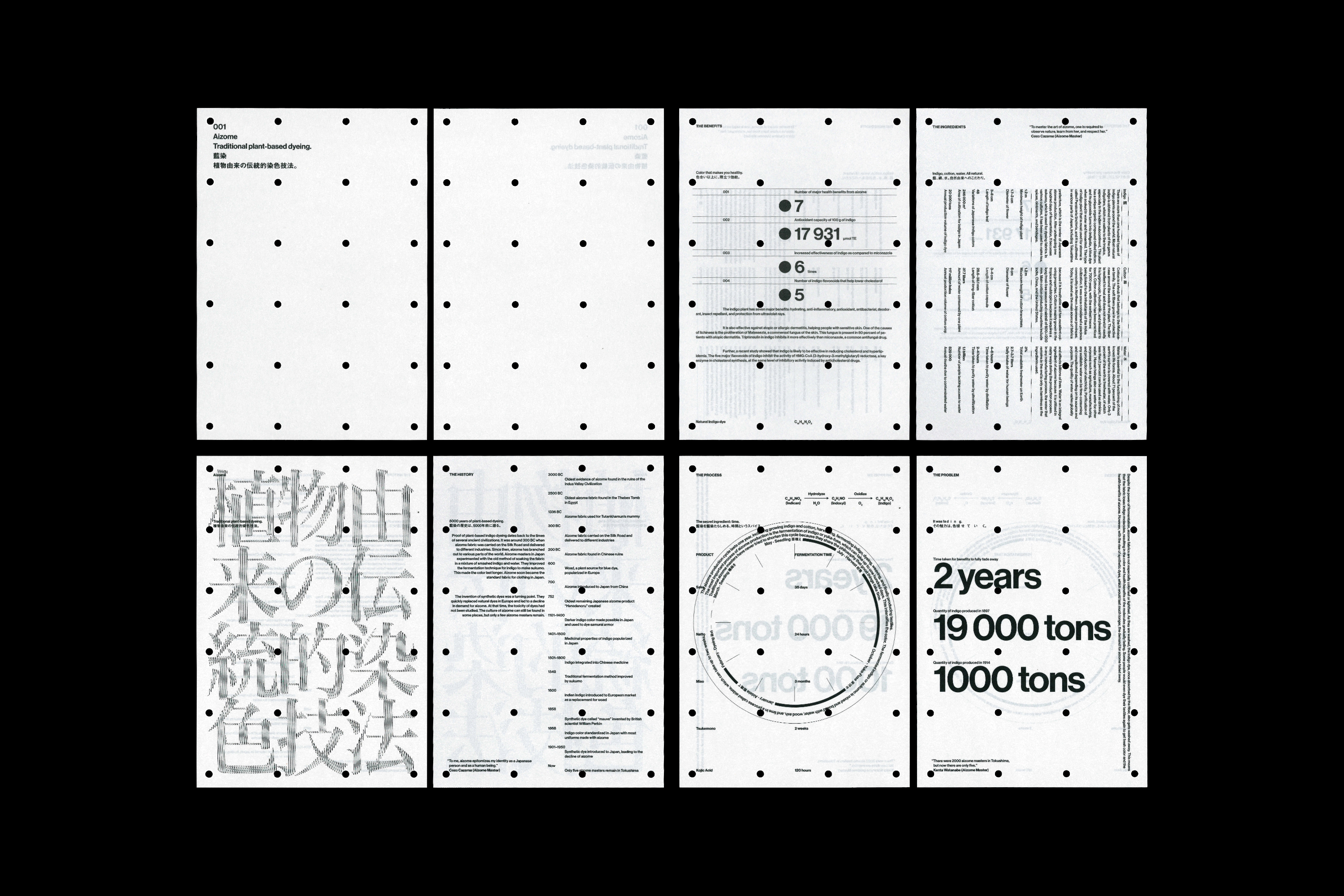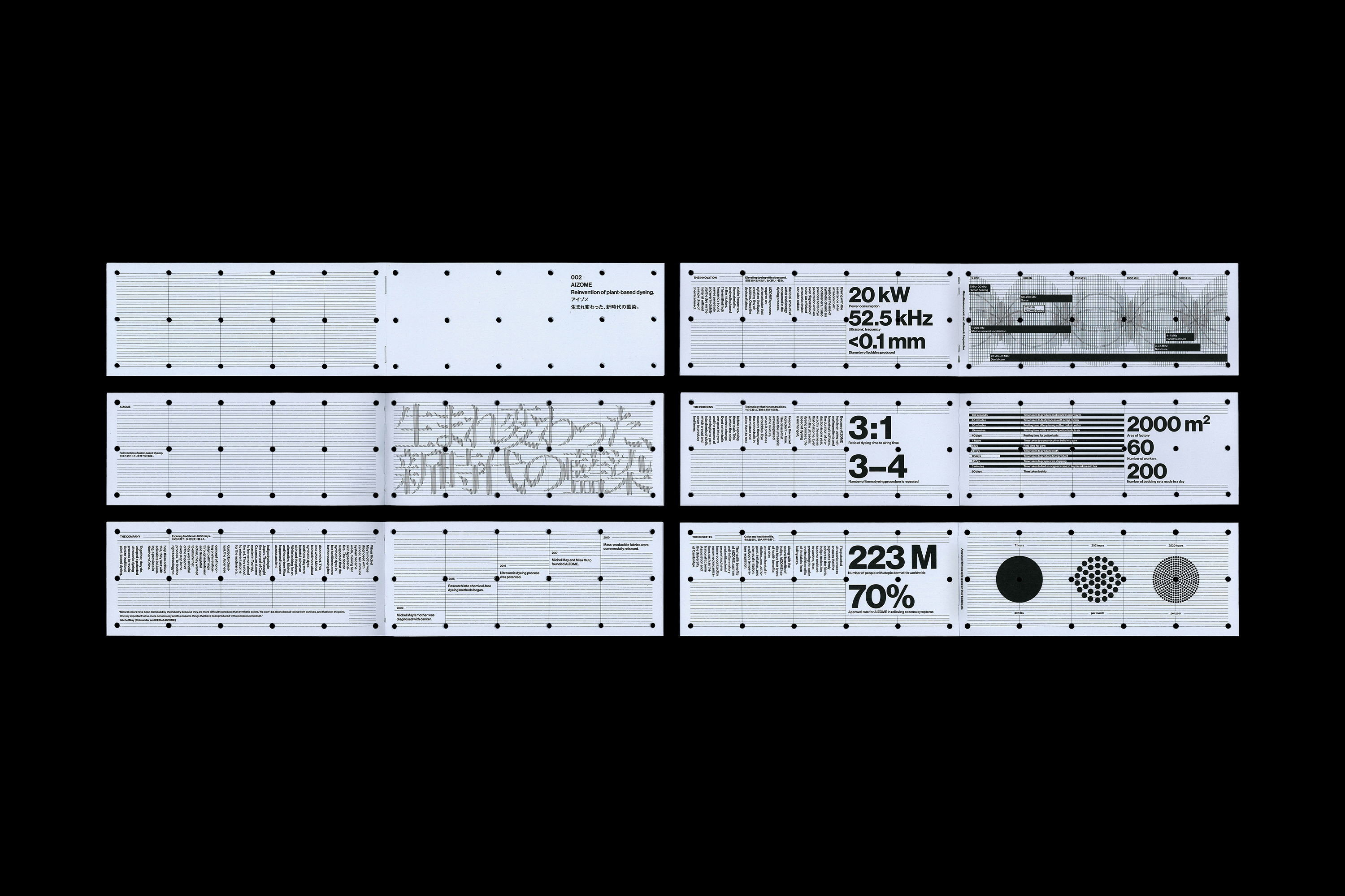 We use three different typefaces: Neue Haas Grotesk for English text, paired with Midashi Gothic Pro MB31 for Japanese text – two timeless typefaces, matching AIZOME’s reinvention of traditional aizome dyeing. For titles, we created our own, custom Ultra One type. We used the traditional Mincho type Hiragino Mincho Pro W6 as a base to reflect the rich history of the ancient Japanese dyeing tradition. We then used p5.js to generate frequency waves on top, which represent ultrasound, which is the core of AIZOME’s innovative dyeing technology.