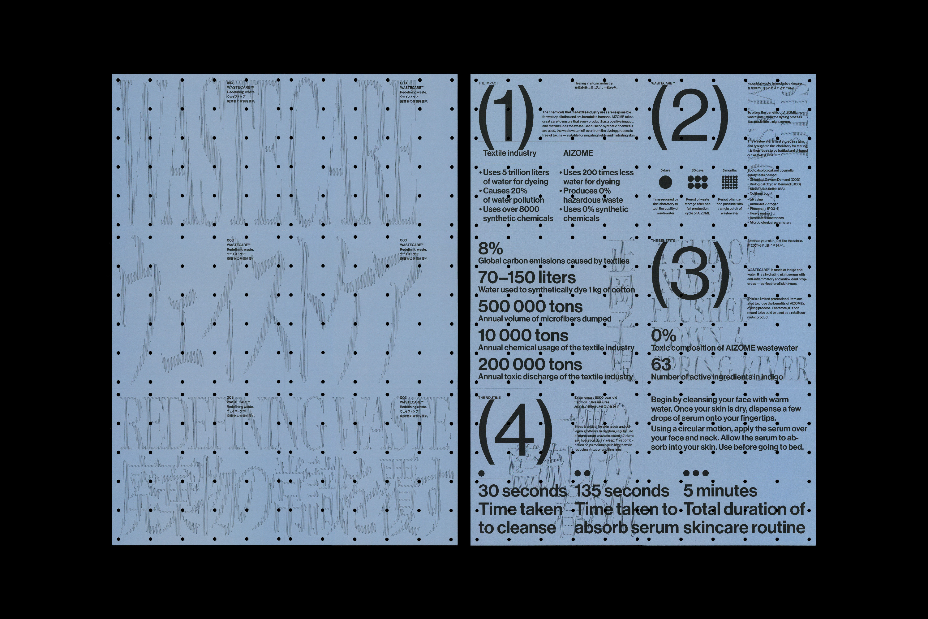 The use of synthetic chemicals in textile production harms the environment, workers, and wearers. To solve this, Japanese startup AIZOME developed an innovative dyeing method that uses only water, medicinal plants, and ultrasound. Because of that, not only do the textiles come with additional health benefits – but even the wastewater. So to demonstrate the quality of AIZOME’s textiles, we bottled the wastewater, branded it as a premium skincare product, and sent it to key opinion leaders in the textile industry.