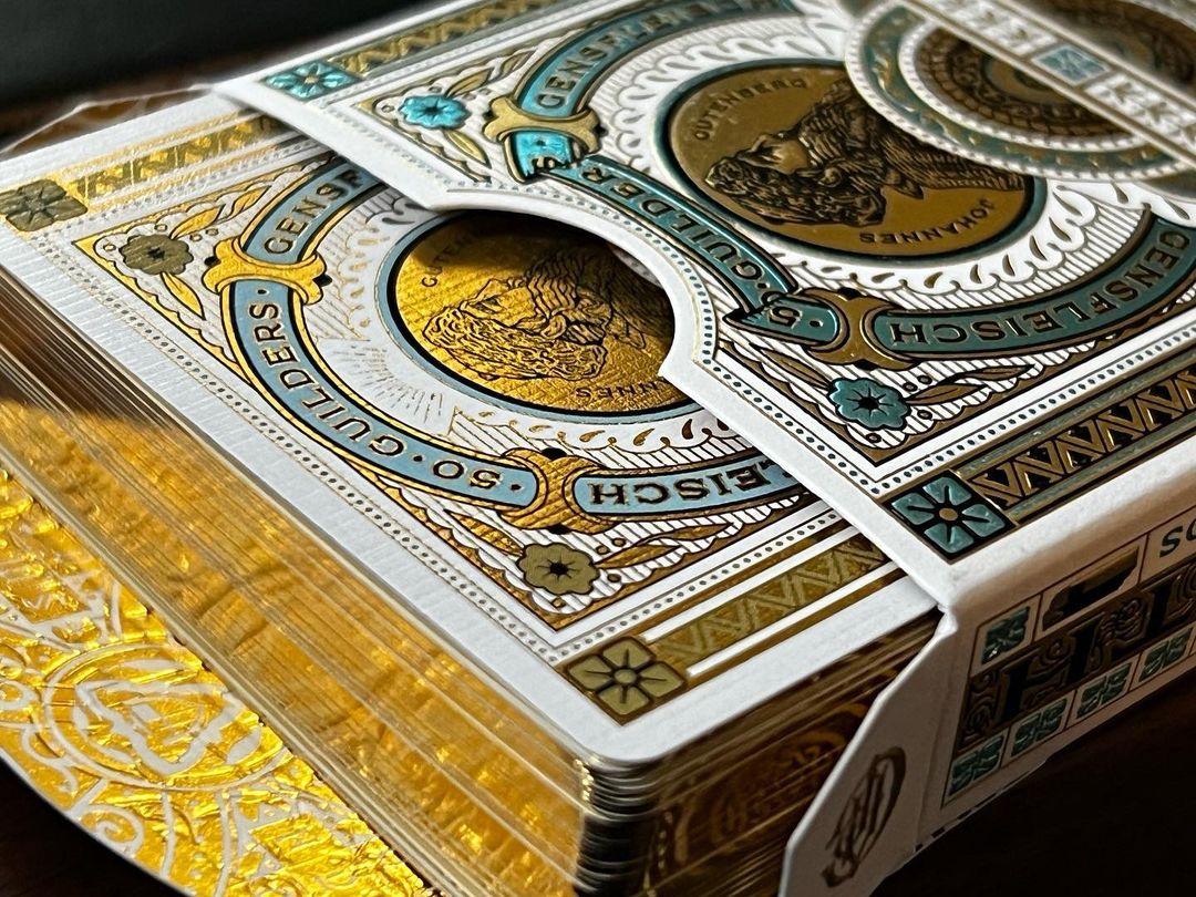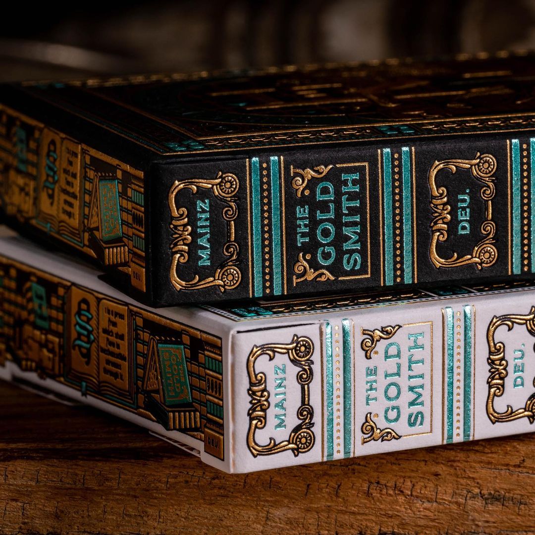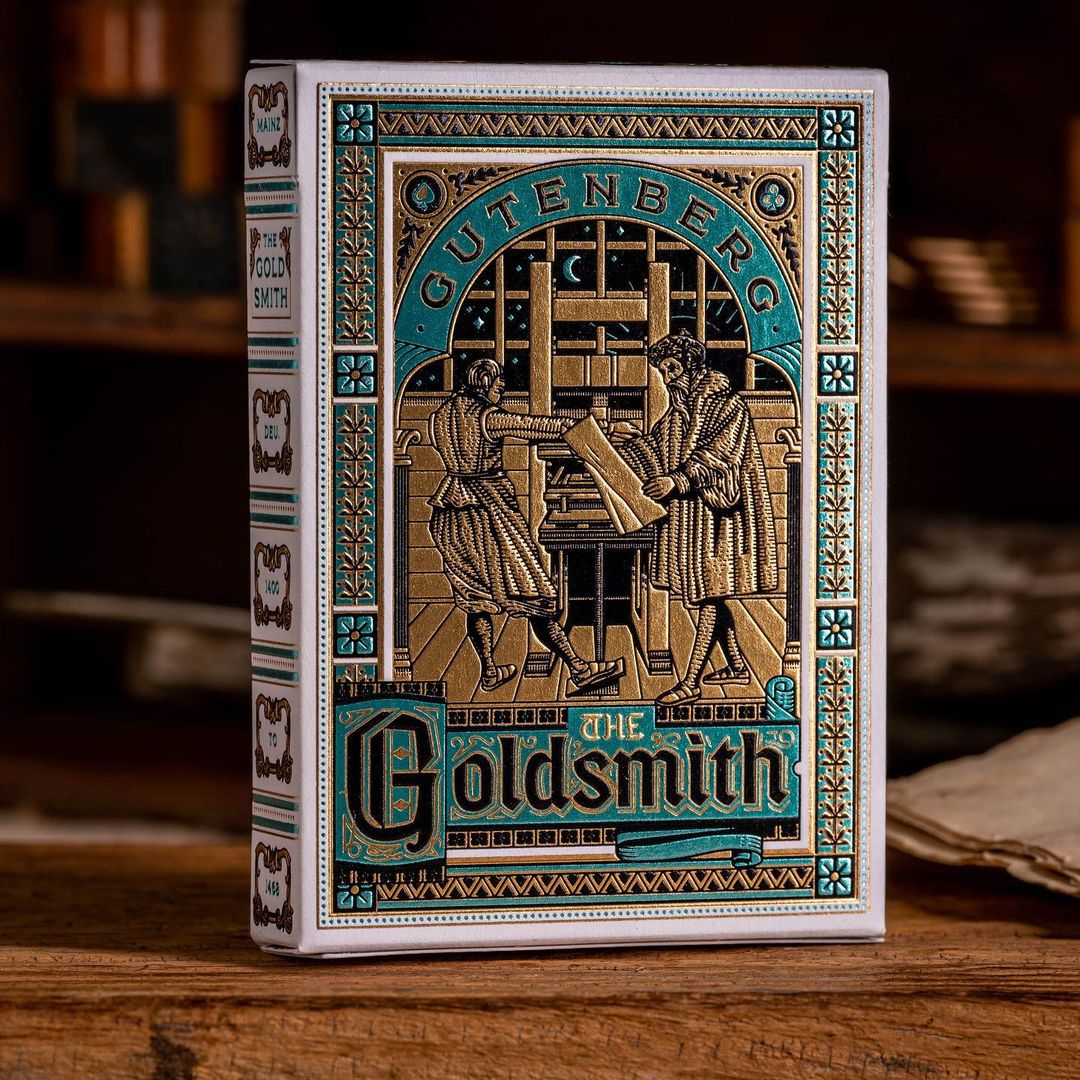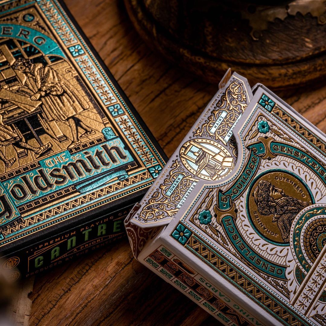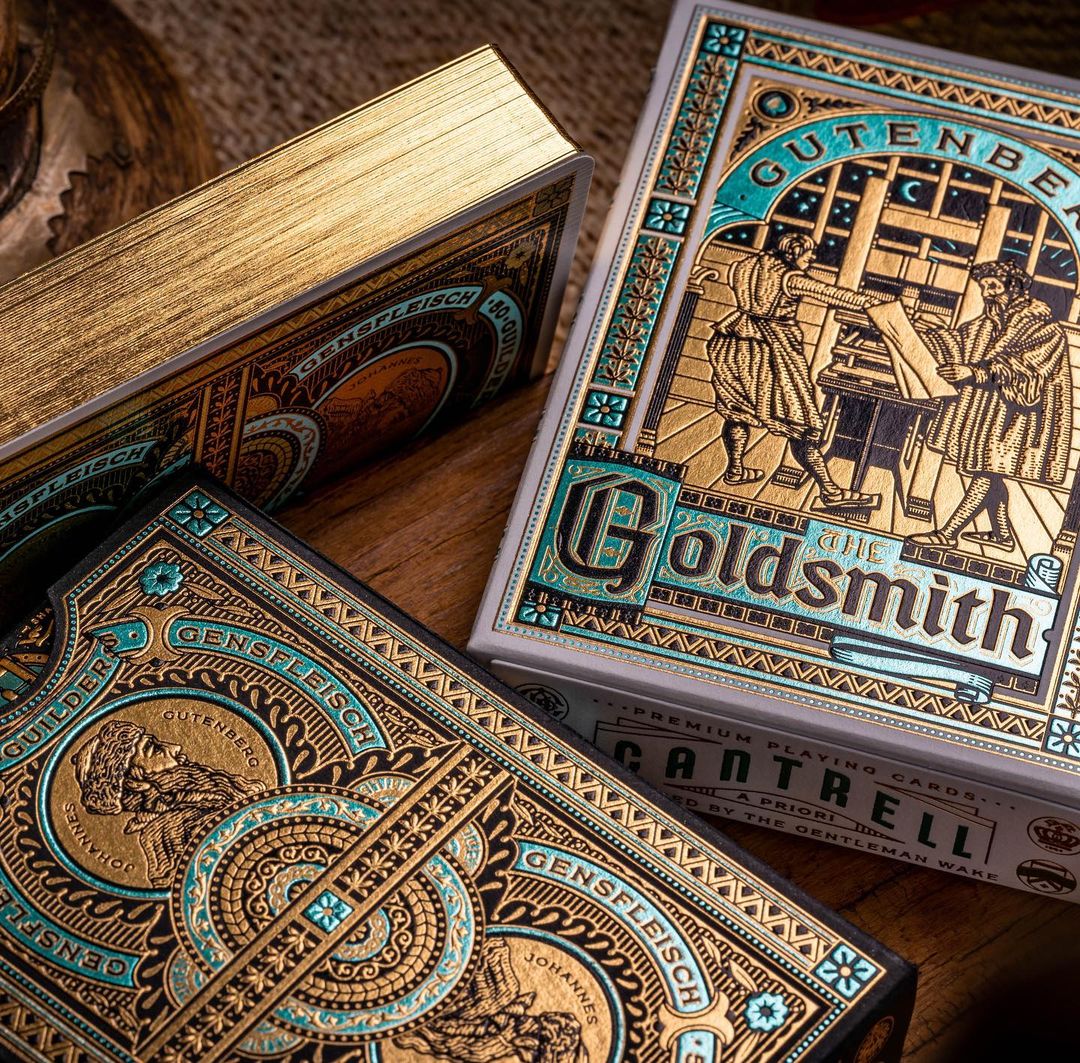 Cantrell A Priori (CAP) is a product line by The Gentleman Wake, a producer of luxury playing cards. Together with designer Kevin Cantrell, they produce themed decks. The Goldsmith tells the story of Johannes Gutenberg. The design uses two typefaces from Typeverything: Cottonhouse and Misfits.