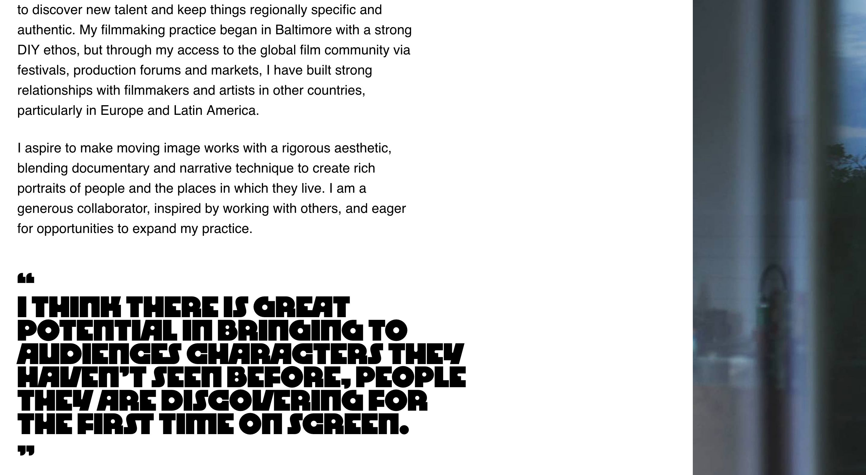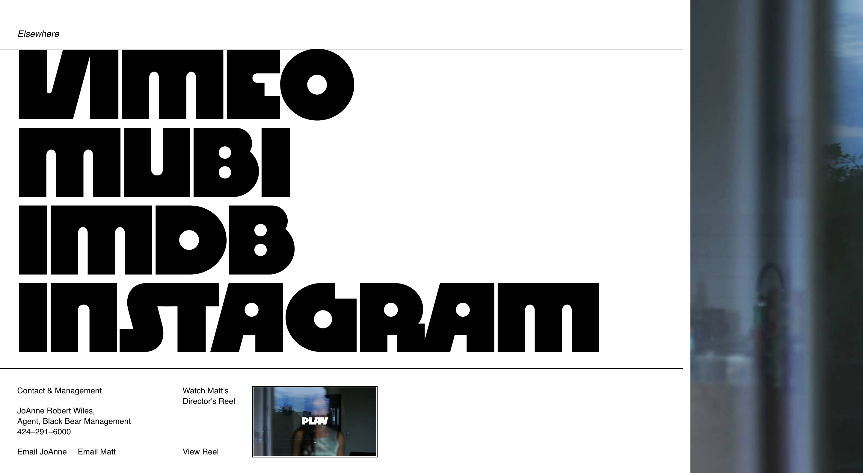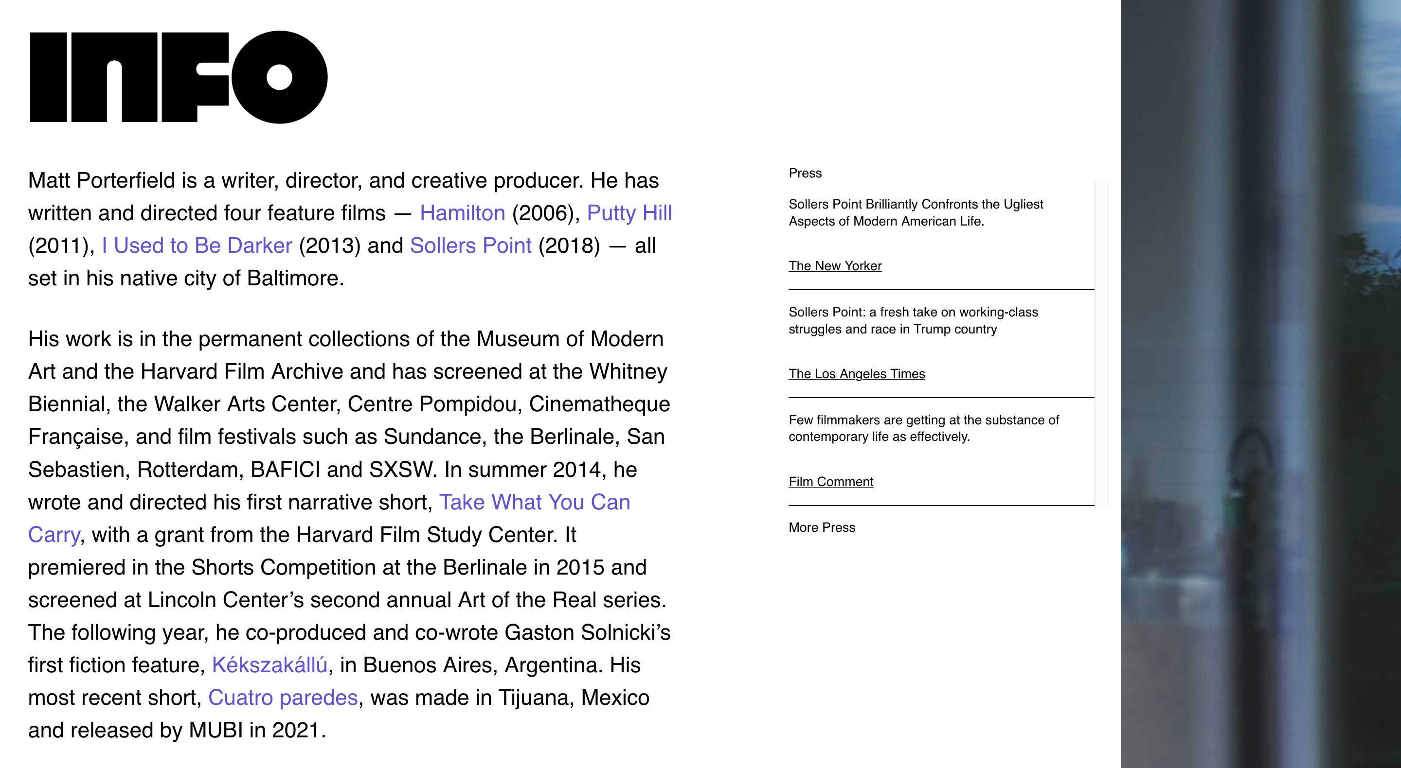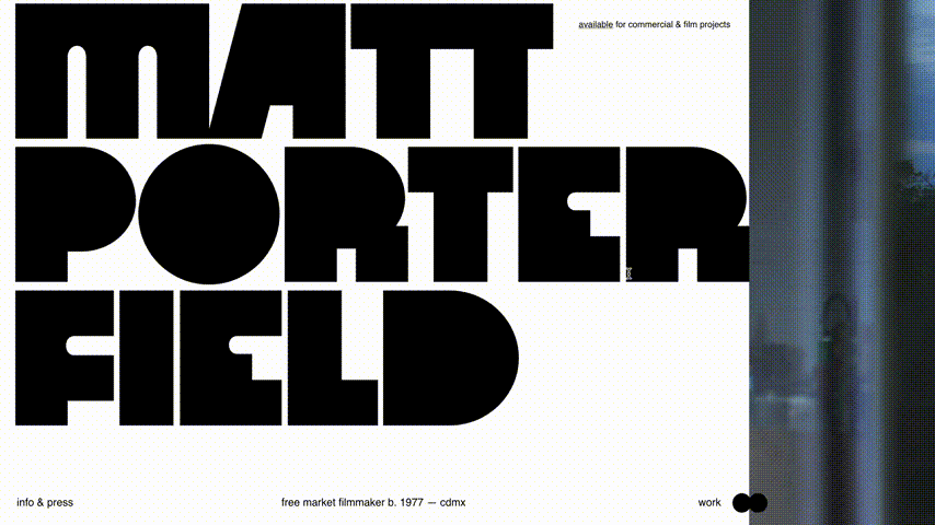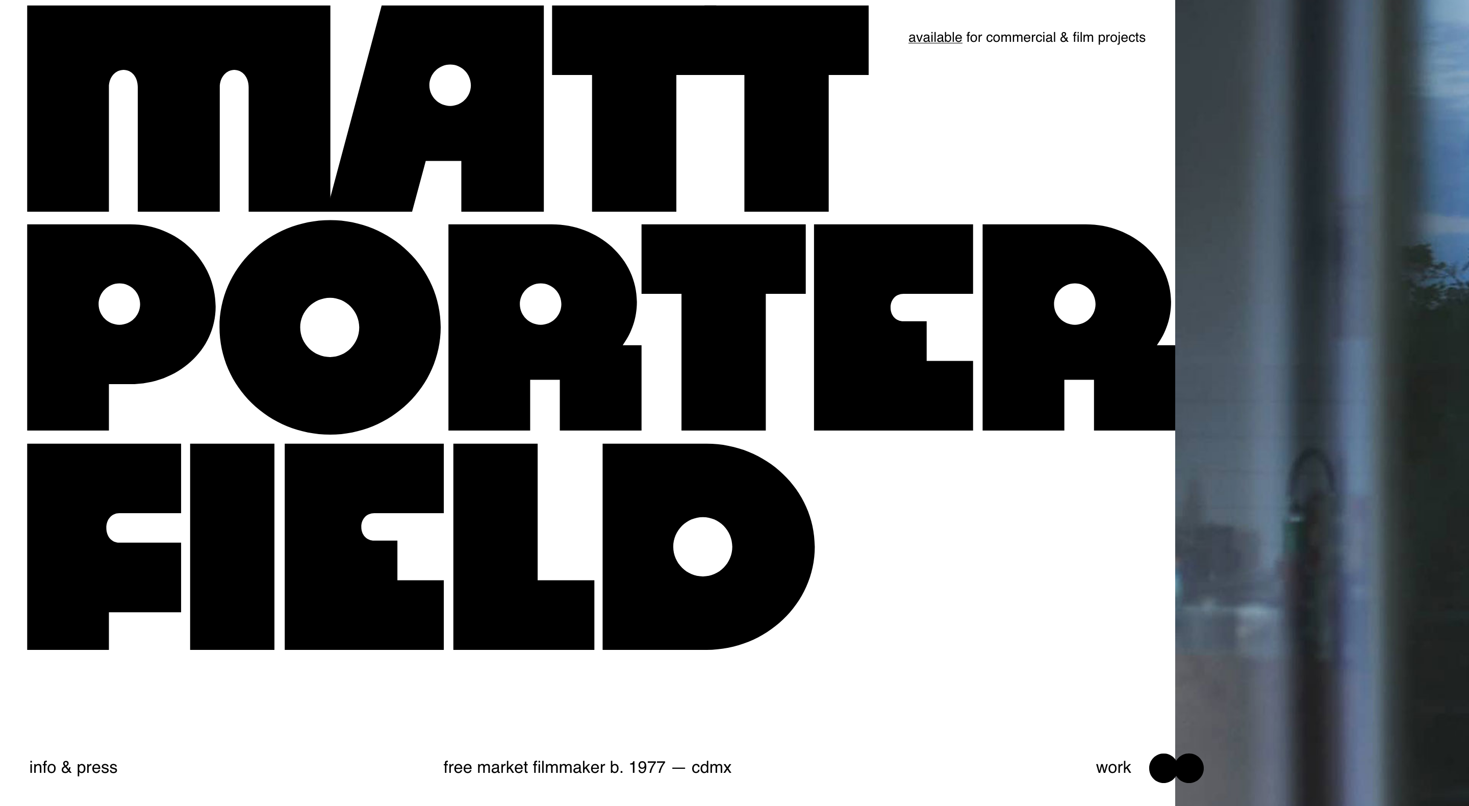 Matt Porterfield is a writer, director, and creative producer hailing from Baltimore and currently based in Mexico City. Drexler, a digital creative studio from his hometown, designed Porterfield’s portfolio website, combining Helvetica for text with all-caps Megazoid for titles. They incorporated some hover effects that hide and reveal the circular counters in DJR’s celebration of “the awkwardness of raw geometry”.