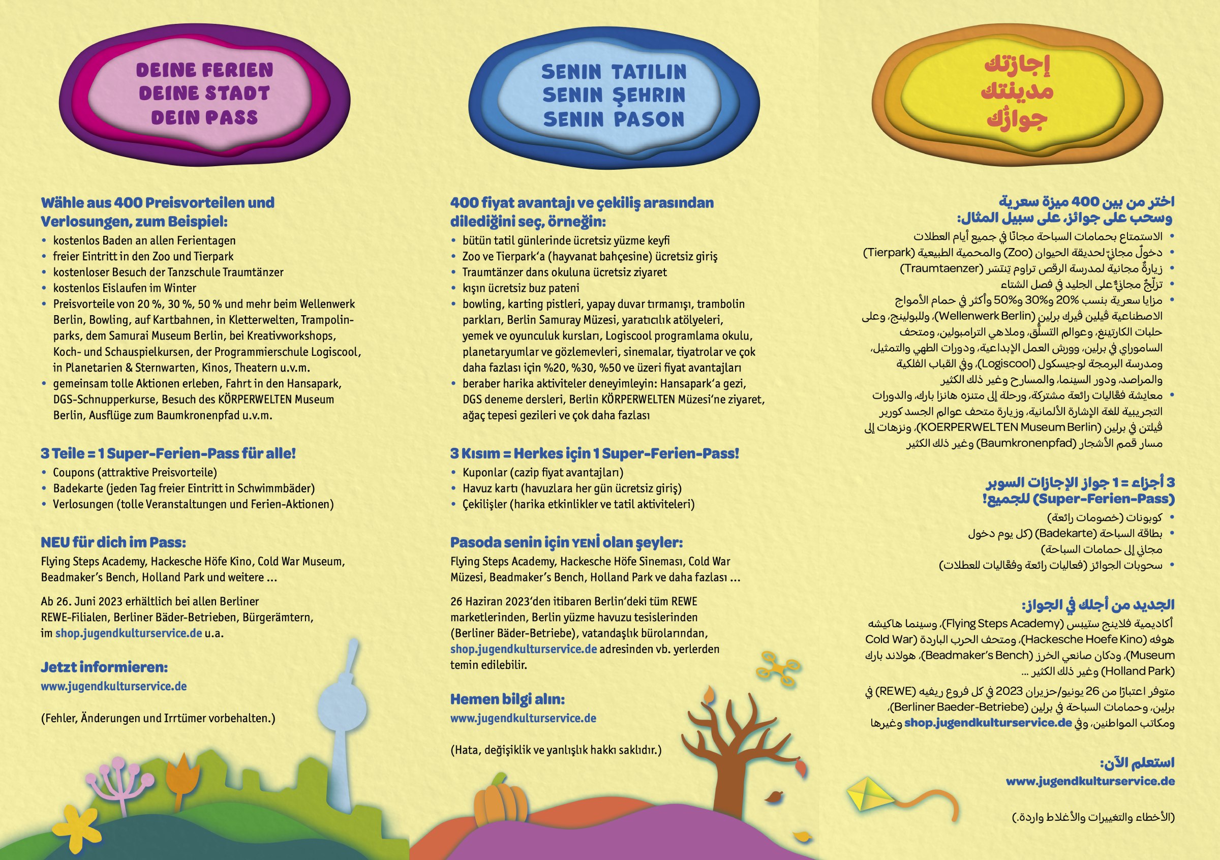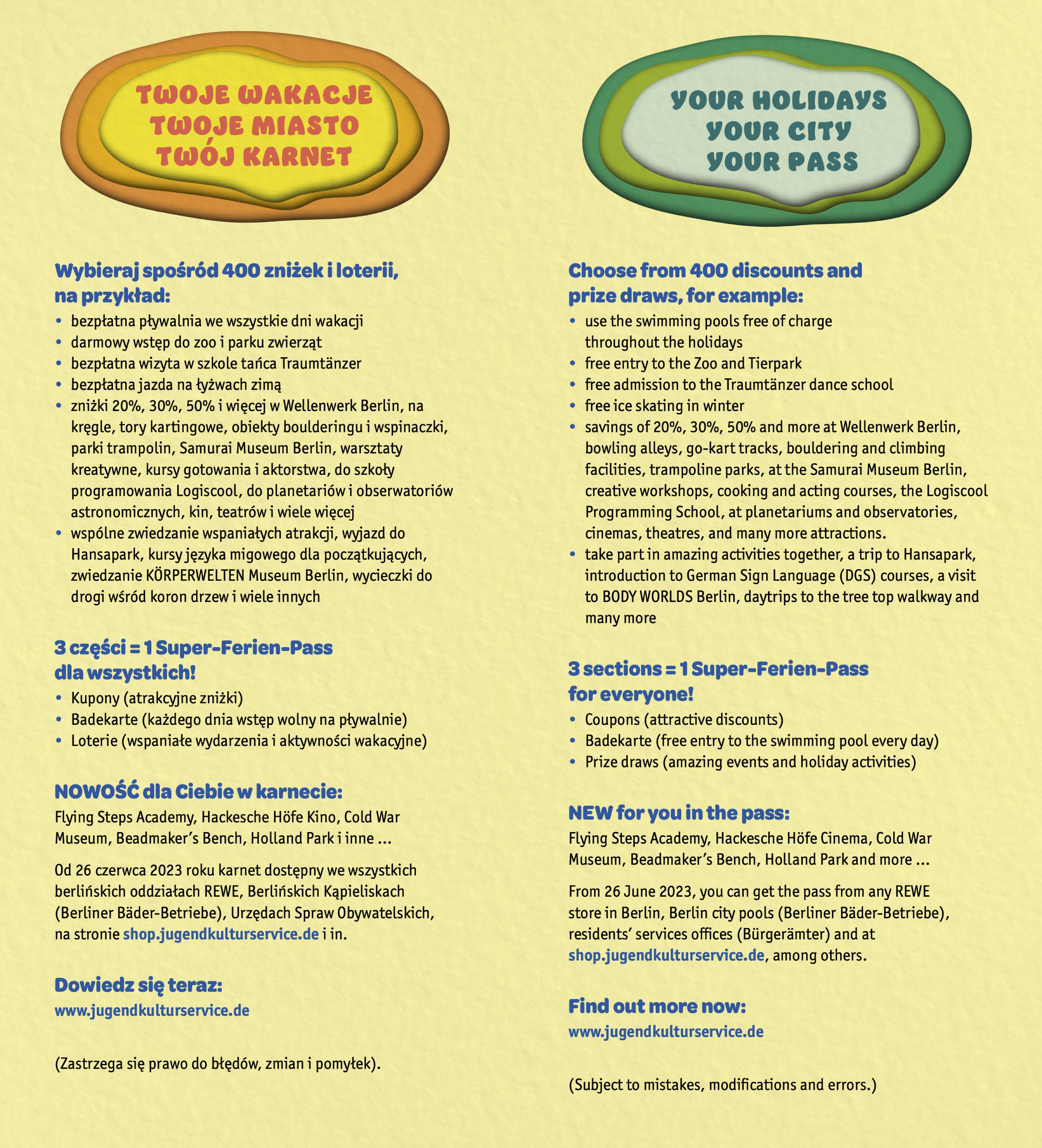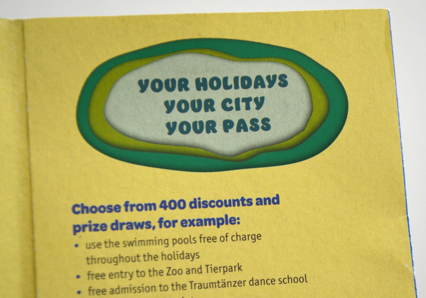 The Super-Ferien-Pass, or Super Holiday Pass, is a booklet full of savings coupons, a swimming card, and exclusive raffles; including for free or discounted admission to the zoos, museums, cinemas, workshops, sports events, and more. It is issued by JugendKulturService, a non-profit funded by the Berlin Senate and Medienboard Berlin-Brandenburg.
