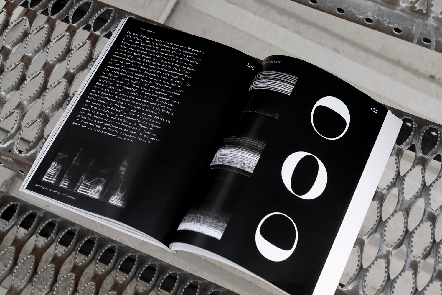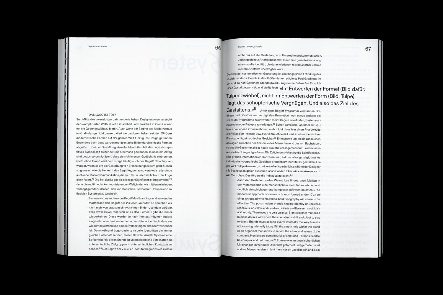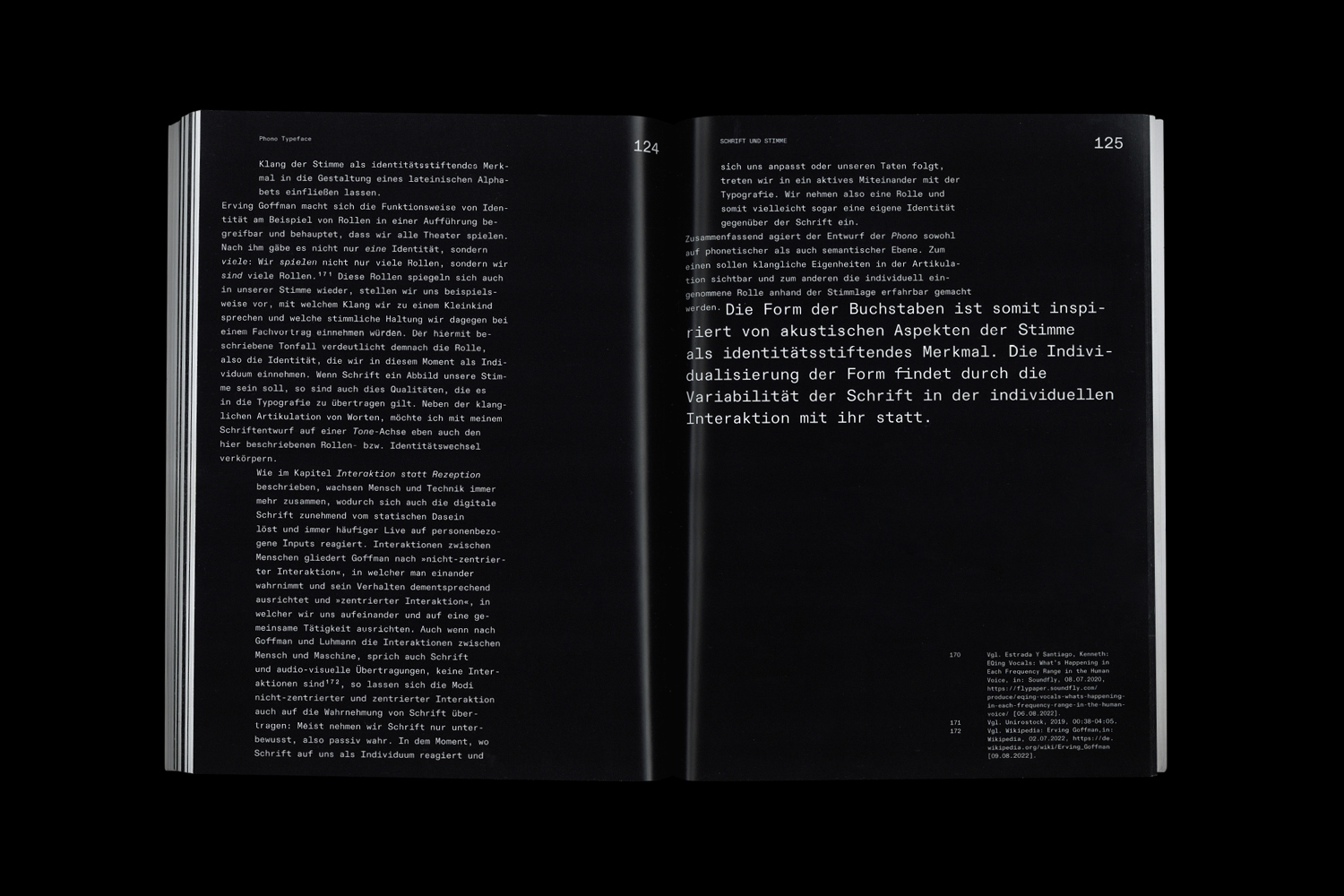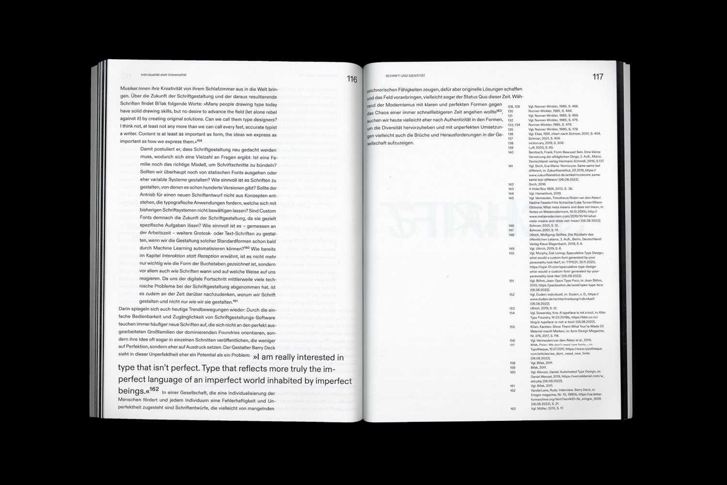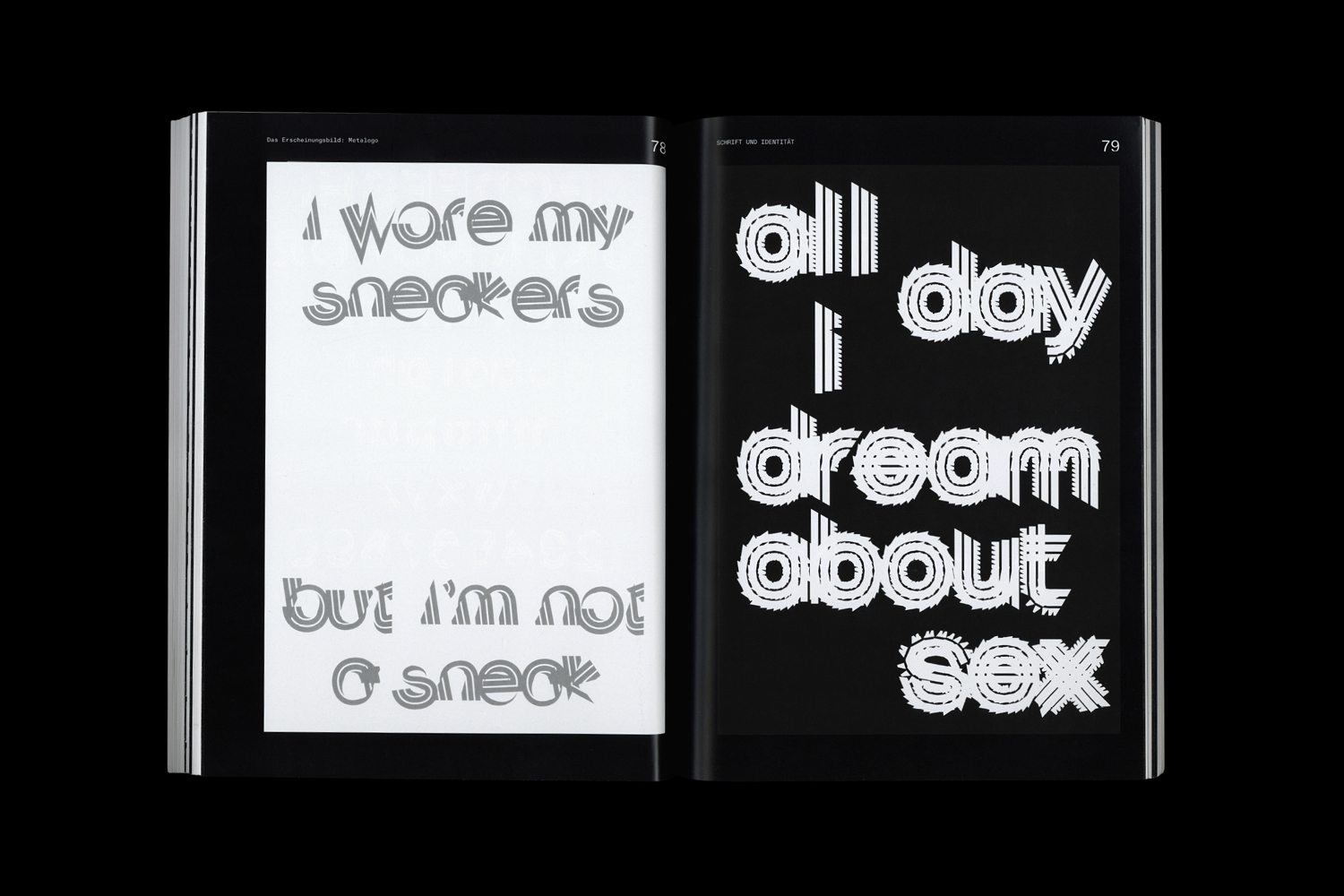 Type Follows Identity uses the Diatype and Diatype Mono typefaces from Dinamo. While the theoretical part of the thesis is set in Diatype, the practical part with its descriptions of typographic experimental arrangements (black pages) is set in Diatype Mono. The title, chapter separators and headings also use a mixture of Diatype and handwritten letters by the designer.