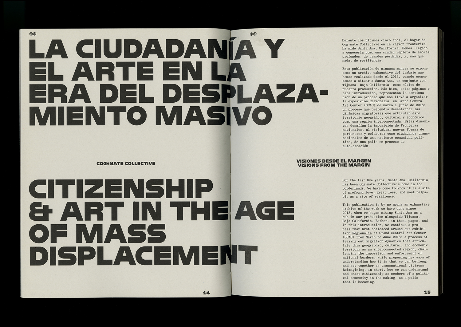 Regionalia, a bilingual catalogue, documents the research, projects, and culminating exhibition generated during Cog•nate Collective’s artist residency at Grand Central Arts Center. The 128-page catalogue includes an additional 32-page insert drawn from public conversations that took place throughout the exhibition. Designed by Stephen Serrato of ELLA, with assistance by Roberto Rodriguez, the publication contains texts by Cog•nate Collective, Christian Zúñiga, and a dialogue between the artists and Karen Stocker. Regionalia is co-published with Grand Central Art Center, Santa Ana.