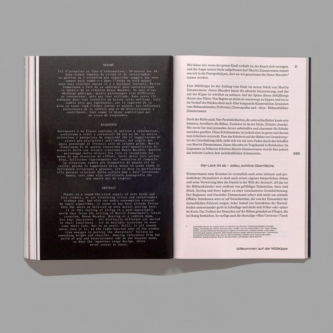 Schweizer Grand Prix Darstellende Künste / Hans-Reinhart-Ring 2021 Contributed by Source Type on Mar 2nd, 2024. Artwork published in 2022. Source: www.adelinemollard.ch Adeline Mollard. License: All Rights Reserved. Publication for the Swiss Grand Prix Performing Arts / Hans-Reinhart-Ring 2021 by the Federal Office of Culture in cooperation with the Swiss Society for Theater Culture (SGTK). Source: www.adelinemollard.ch License: All Rights Reserved. Source: www.adelinemollard.ch License: All Rights Reserved. Source: www.adelinemollard.ch License: All Rights Reserved. Typefaces More about Chroma STGet Chroma STMore about LL Bradford MonoGet LL Bradford Mono Formats Books (6463) Topics Performing Arts (982) Designers/Agencies Adeline Mollard (8) Tagged withSwiss Culture Awards (5)Swiss Federal Office of Culture (BAK) (9)Swiss Society for Theater Culture (SGTK) (1)hardcovers (1396)book covers (5804)book interiors (3612)typeface combinations (3888)monospaced (1217)multilingual (2582)French (language) (2495)Italian (language) (587)English (language) (2398)German (language) (2480)center-aligned text (1878)justified text (1042)footnotes (311)pre-release uses (696) Artwork location Switzerland (1108) Zürich (304) In SetsSource Type (Source Type) (12)Designs by Women (Fonts In Use Staff) (3517)Type Designs by Women (Fonts In Use Staff) (1854)Materials (Lucas Bevilaqua) (202)Book Design (Lucas Bevilaqua) (1370) Post a comment Name Email – will not be published Website Your response Submit Comment More LL Bradford Mono in use COURAGE by LOS YORK2024LOS YORKContributed by WELTKERN® Typefaces Adidas Marathon magazine2022Malmsten HellbergContributed by Stefania Malmsten CellarSpace2022Swear WordsContributed by NaN Staff Pick Sponsor More in Performing Arts 52nd Dimitria Festivalc. 2017Dimitris PapazoglouContributed by Grilli Type Noć s gostima poster, ADU2024Sara DumančićContributed by Inès Davodeau Macbeth, National Theatre Livec. 2018National Theatre’s Graphic Design StudioContributed by Benjamin Warner Teatar &TD logo and posters (1970–1973)c. 1970Mihajlo ArsovskiContributed by Florian Hardwig Staff Pick More in Books The Hollow Hills by Mary Stewart (William Morrow)1973Lawrence RatzkinContributed by Florian Hardwig Staff Pick Arthur van Schendel – Angiolino en de Lente 1943Boosten en StolsContributed by Matthijs Sluiter Assignment in Eternity and Beyond This Horizon by Robert A. Heinlein, Signet1964unknownPhoto(s) by Make It Old on Flickr. The Second Sex by Simone de Beauvoir (Bantam)1970unknownContributed by D Jones More Fonts In Use Moon Boots – First Landing album art, singles, merchandise and tour graphicsc. 2017Big ActiveMarkus BagåContributed by Gareth Hague Staff Pick Schach Landesverband Oberösterreichc. 2022Gruppe am ParkContributed by Oudin Romain Staff Pick Jean Lurçat 25 booklet and posters2017Manuel Weselymm, mPatrick BittnerContributed by Manuel Wesely Staff Pick English Pronunciation Illustrated by John Trim (Cambridge University Press, 1975)1975Ken Garland & AssociatesPeter KneeboneContributed by Florian Hardwig Staff Pick