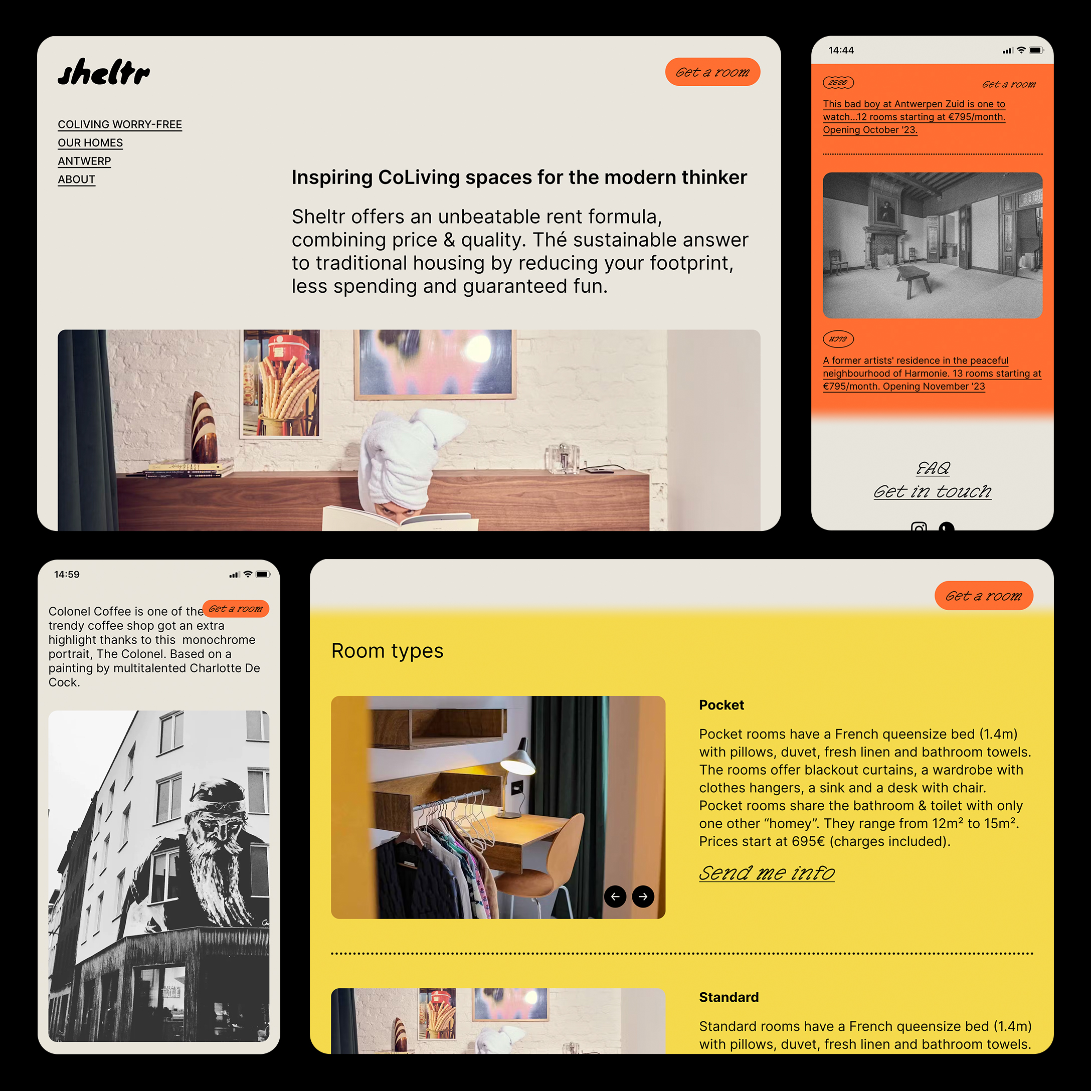 We chose G2 Ciao as the brand typeface. This quirky details of this non-traditional face by Gruppo Due provides a unique character. The distinctive numerals were perfect to subtly incorporate the brand identity in Sheltr’s signage. This allowed us to create a typographic key addressing the various locations while retaining the privacy of their location.