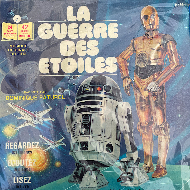 The chubby forms of Churchward Marianna make Star Wars look a lot less martial and dangerous. This audiobook with original music by John Williams was narrated by Dominique Paturel (1931–2022), who is best known as the French dubbing voice of Larry Hagman (as J.R. Ewing in Dallas) and Michael Caine. The 7″ record comes with a 24-page color booklet. It was released by Buena Vista Records in Canada in 1979 or 1980. Shown here is a slightly later French pressing.