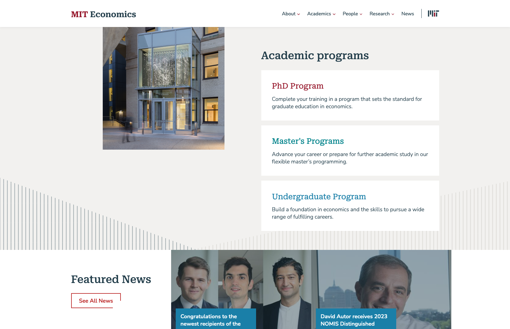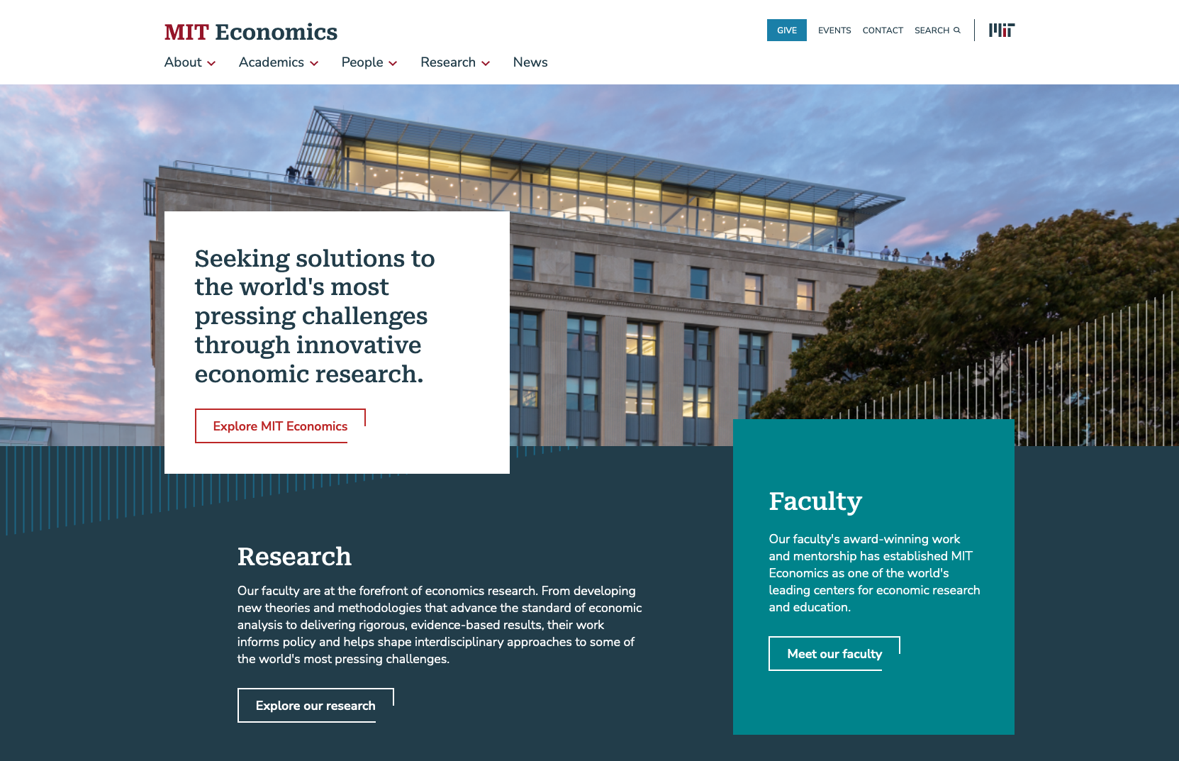 Since 2023, Roboto Serif is used for the MIT Economics logo as well as for headlines on the website. It is paired with Nunito Sans for text.