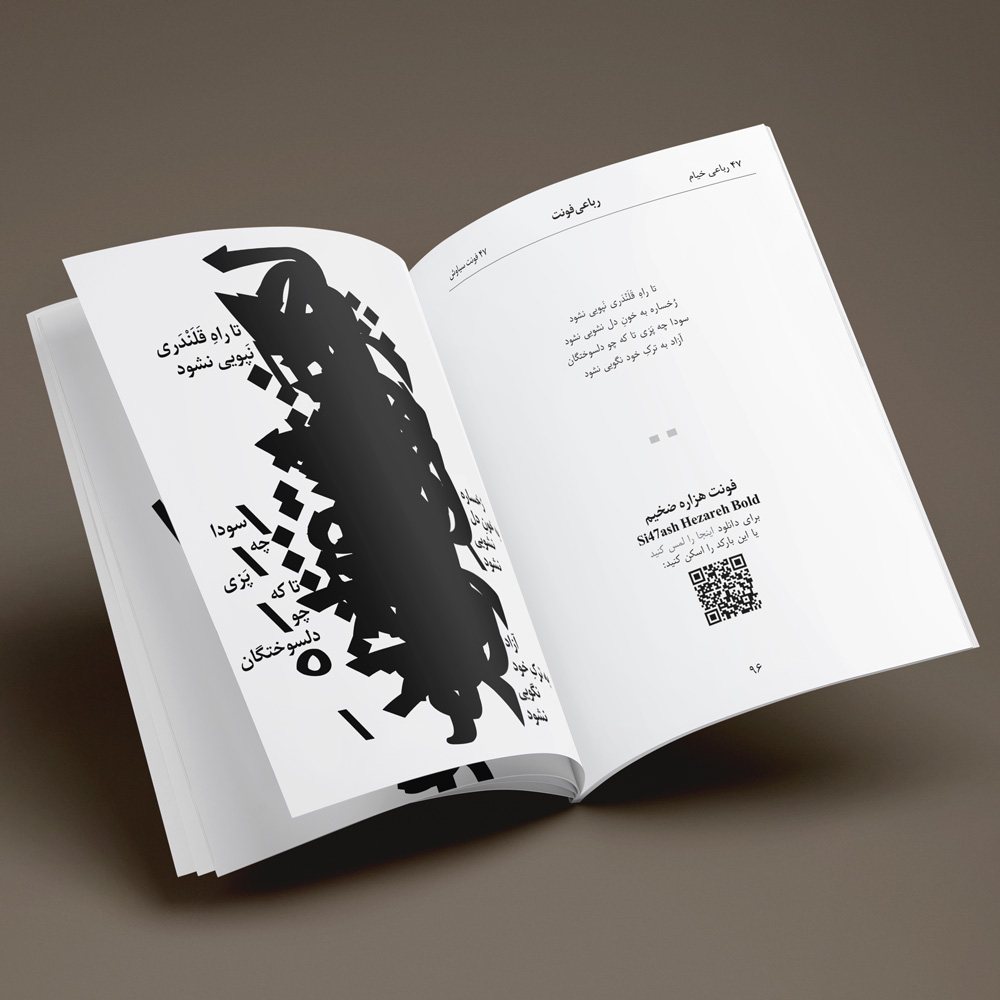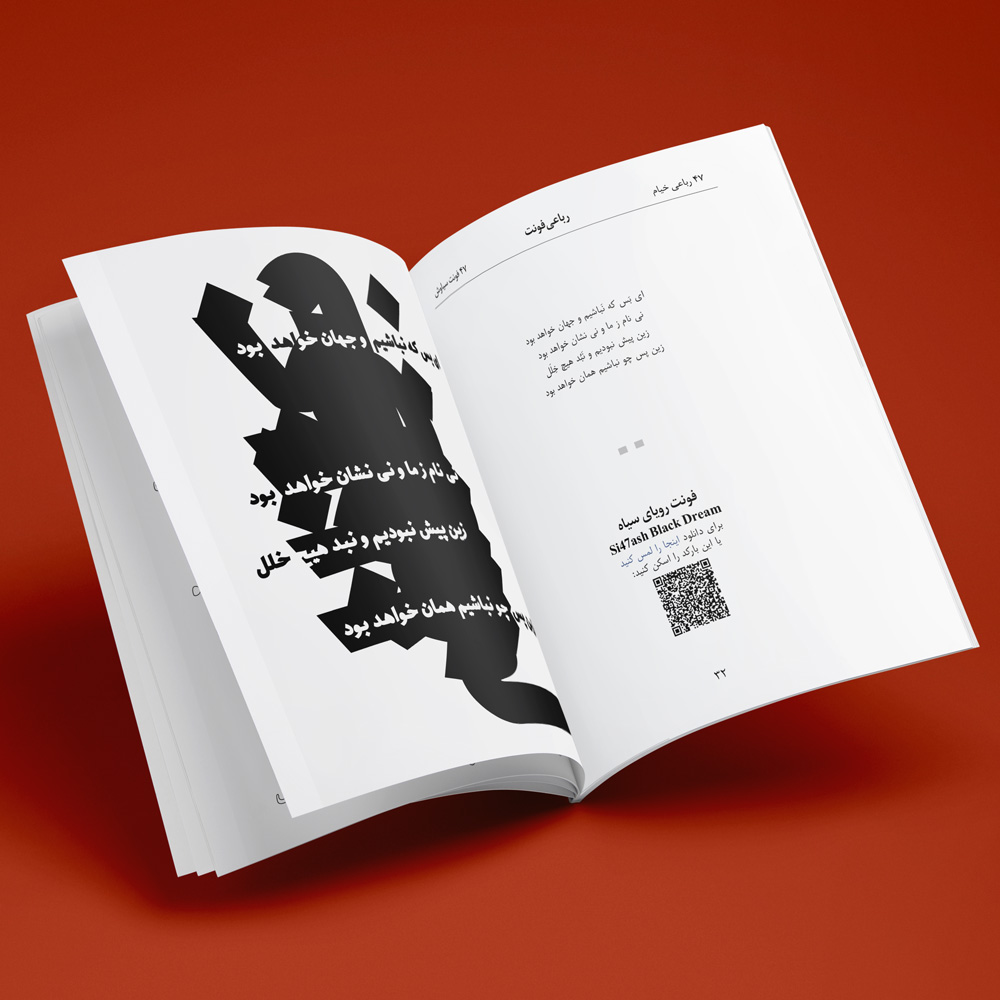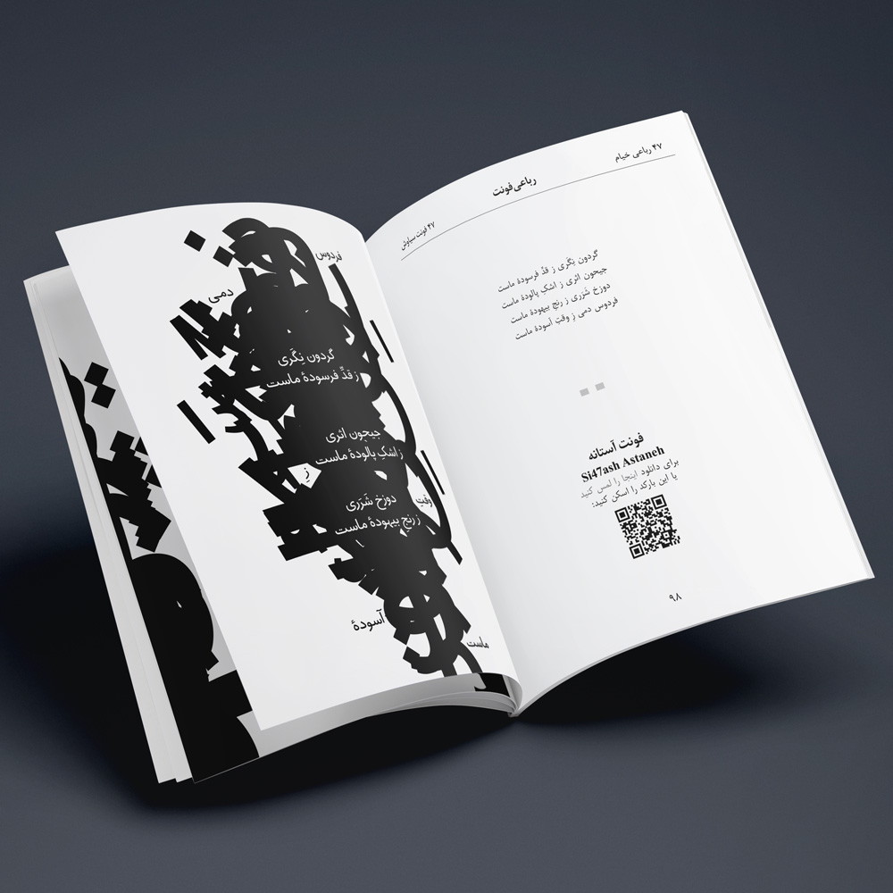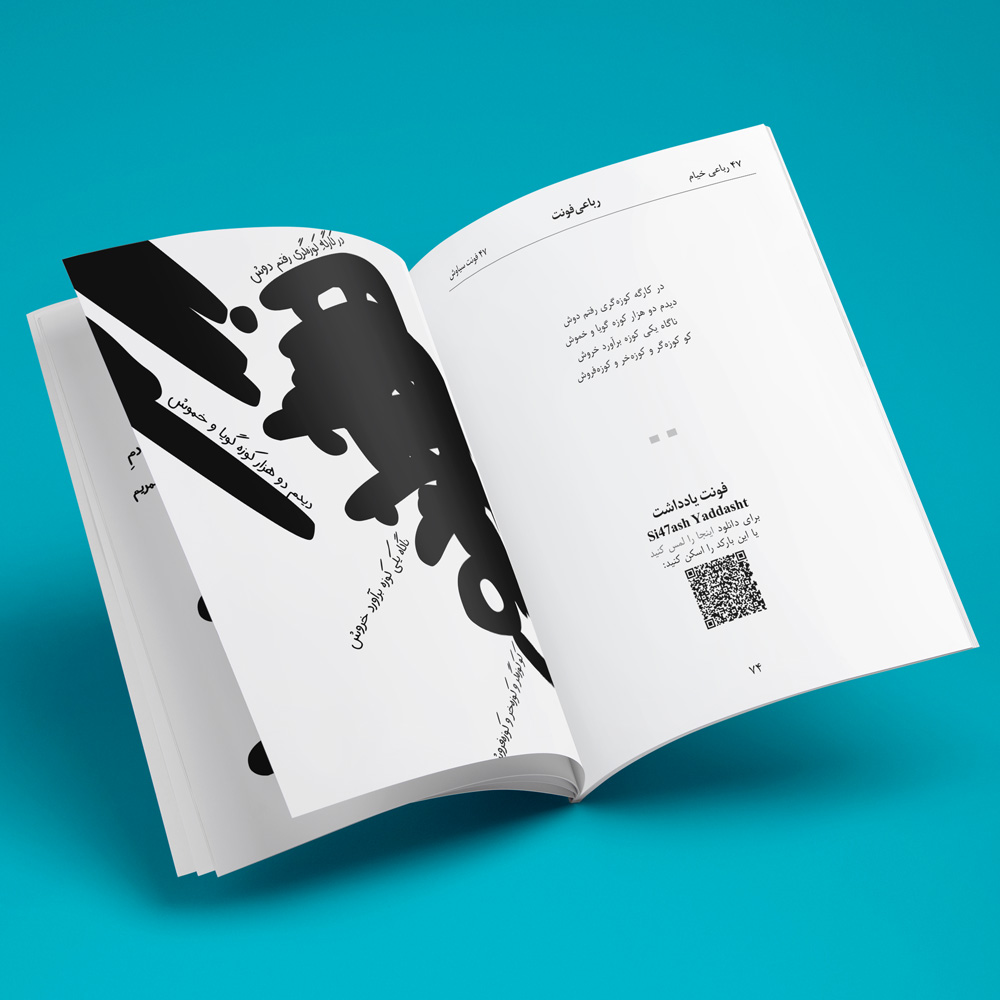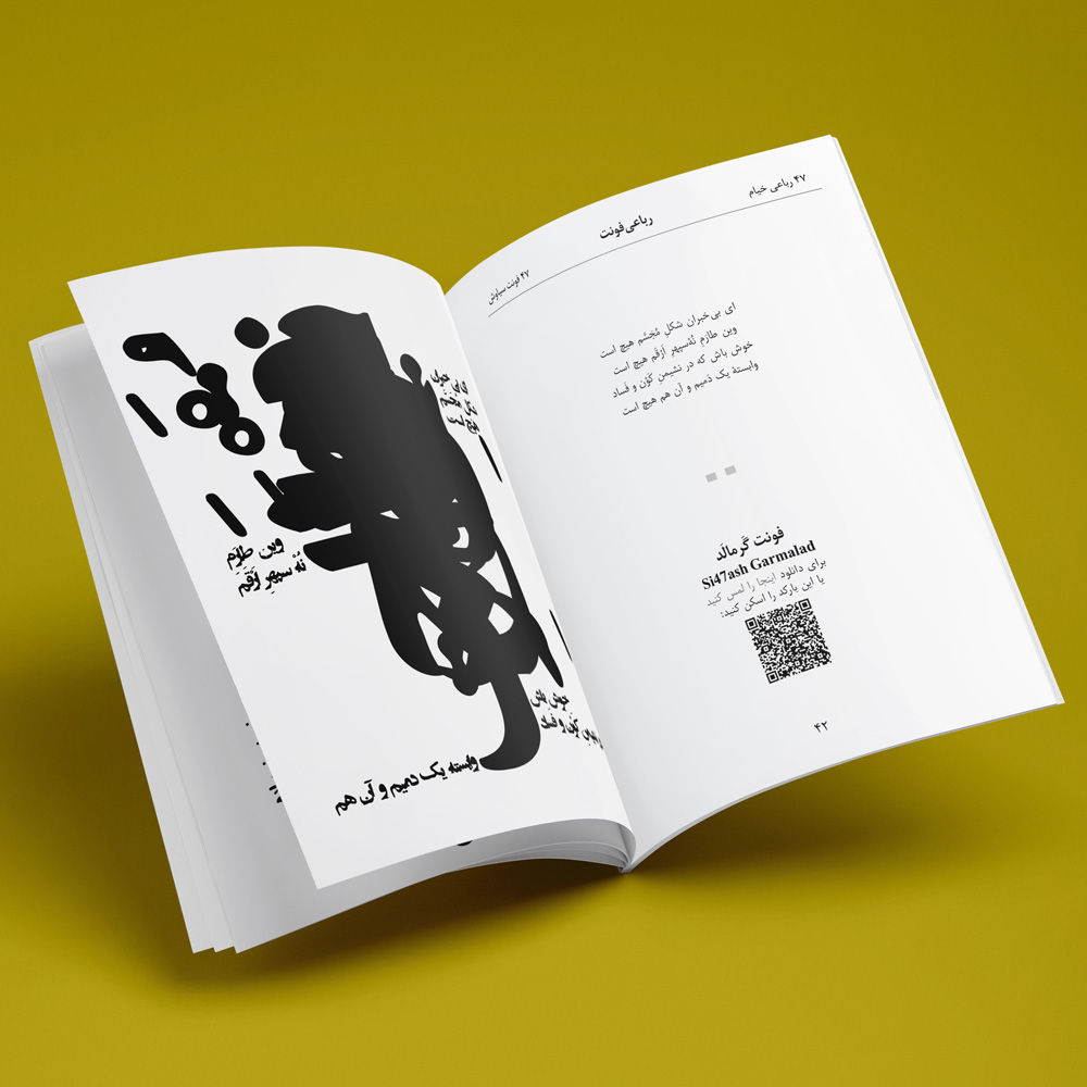 The RubaiFont book contains forty-seven of Khayyam’s rubaiyats, which are written in forty-seven of Si47ash’s Persian fonts. This work is a typographic and artistic approach towards Khayyam’s poems. On each page, there is one rubai set in a different font.