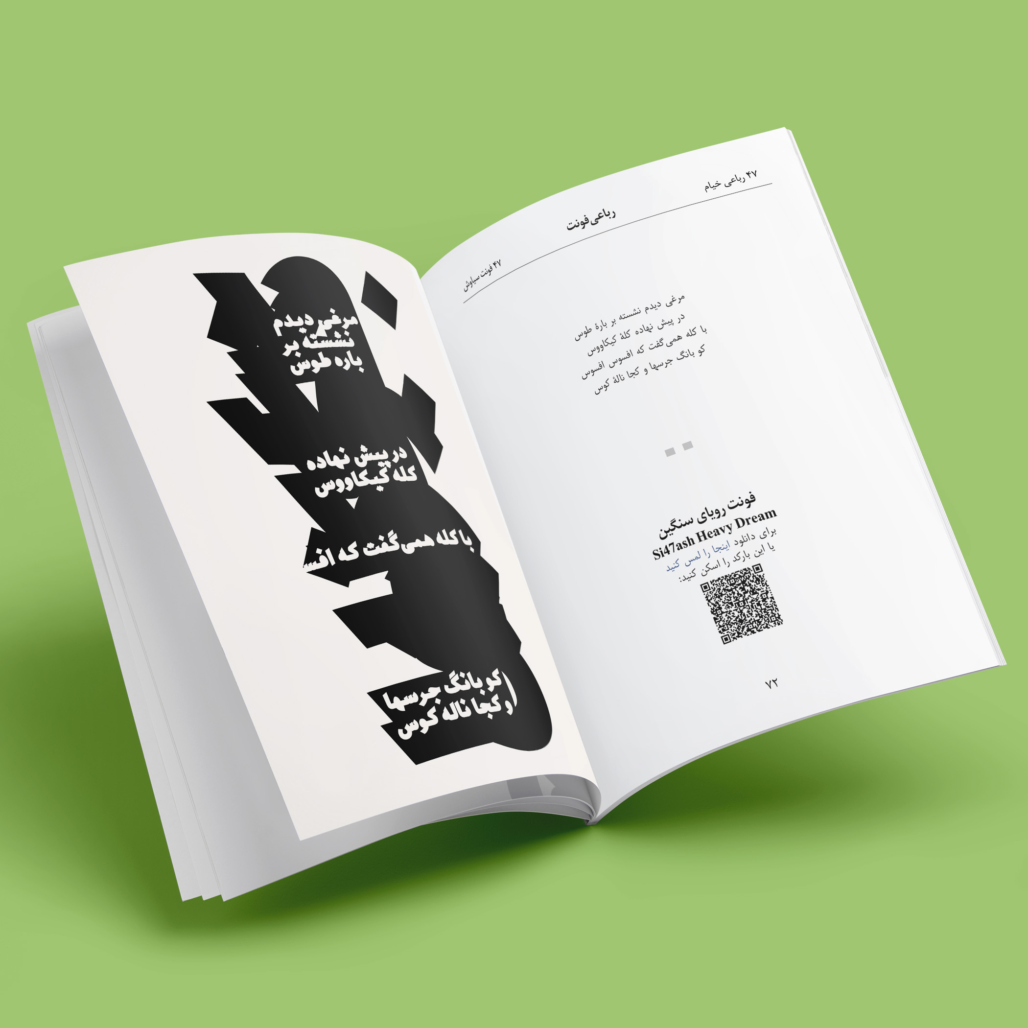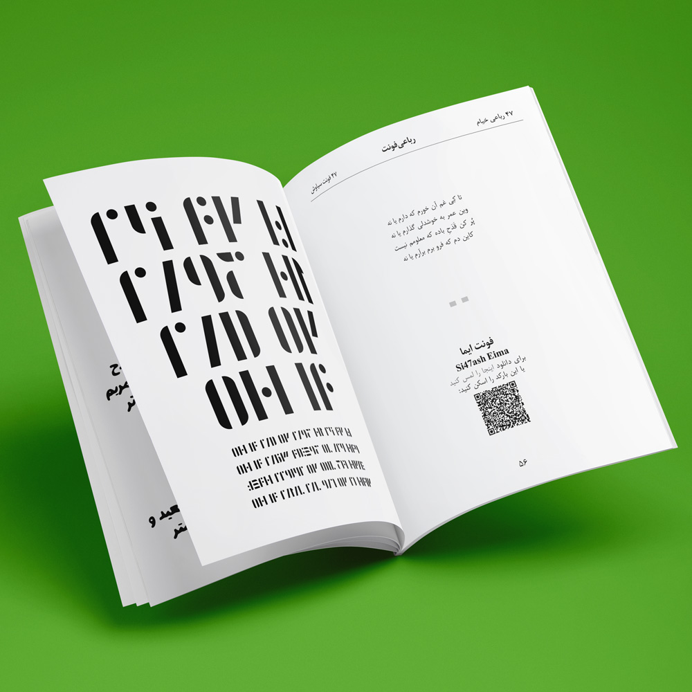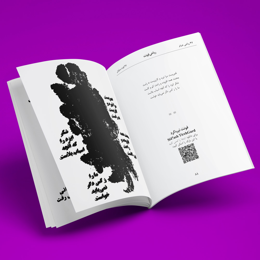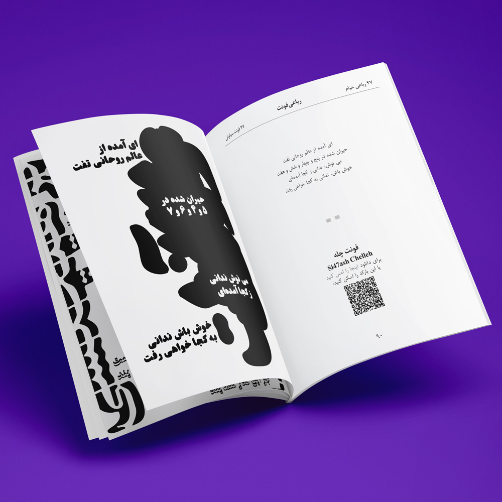 The RubaiFont book contains forty-seven of Khayyam’s rubaiyats, which are written in forty-seven of Si47ash’s Persian fonts. This work is a typographic and artistic approach towards Khayyam’s poems. On each page, there is one rubai set in a different font.